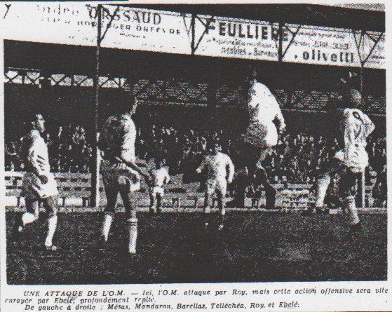 MONTPELLIER - Si tous les joueurs de ballon que nous avons vu sur les plages du Grau-du-Roi de Carnon et de Palavas les Flots se trouvaient sur les gradins du Parc des Sports, le record de recettes serait certainement battu. Mais il n'en est rien, hélas ! Pour le chanoine Bessede ! Et le trop beau temps, compliqué par le mauvais classement des deux équipes, fait que ce derby sudiste se dispute devant 4.000 spectateurs environ. Dans les rangs de l'O.M., c'est finalement Aygoui qui a été préféré à Pavon. Une certaine égalité Le premier quart d'heure est à l'avantage de Montpellier, plus offensive, il faut cependant attendre la deuxième minute pour voir Moreira intervenir sur un coup de tête de N'Doumbe consécutif à un centre de Mahjoub. À la 12e, on note le premier tir marseillais de Bruneton mais assez nettement à côté. La partie est assez agréable et jusqu'à présent extrêmement correcte. À la 16e minute, un tir d'Aygoui, mal repoussé par Mandaron, fait que le ballon rebondit devant Dogliani. Mais ce dernier rate la reprise directe au moment au demeurant assez difficile. L'O.M. maintenant joue mieux et se montre à son tour menaçant. Ce qui n'empêche pas (20e minute) Bonnet de passer en vitesse sur la gauche... et de rater son tir. Rien ou presque signaler A la 25e minute, N'Doumbe réussit son numéro favori de dribbles aux dépens de Leonetti et de Moulon. Mais son centre ne trouve aucun partenaire. Aussitôt après, les vociférations du public soulignent un départ de Bonnet, signalé hors-jeu par l'arbitre de touche. Un corner pour l'O.M., un coup franc aux 20 mètres pour Montpellier... et voilà 30 minutes de passées. Et c'est à la 31e minute que Moreira réussit son premier arrêt délicat, sur un retourné de Bonnet faisant suite à un corner. Nouveau corner pour Montpellier, deux minutes plus tard, et nouvelle envolée de Moreira qui se saisit du ballon juste sur la tête de Majhoub. Montpellier, il est vrai, a repris la direction du jeu. 0 à 0 à la mi-temps A la 35e minute, conduite par Aygoui et Dogliani, une contre-attaque de l'O.M. se développe. Roy, dernier servi, centre du gauche dans les mains de Dessons. C'est le premier arrêt du gardien de Montpellier. Sur le renvoi, Majhoub, qui avait pris la défense de l'O.M. à contre-pied est arrêté in extremis par Knayer. Et l'on s'achemine tout doucement vers la mi-temps, Montpellier attaquant et l'O.M. contre-attaquant, tous les deux sans le moindre succès, il faut bien le dire. 46e minute : Ebele marque Ce que l'on espérait d'un côté et redoutait de l'autre se produit dès la reprise. Un centre de Bonnet est repris directement et de volée par Ebele venu au sprint de l'arrière, à un mètre à peine de Moreira : |