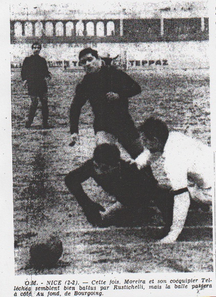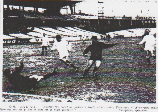Sur corner de Bourgoing, d'un demi-tour contact à la manière des rugbymen égalisa. Nous crûmes alors - les mêmes causes produisent les mêmes effets - que l'O.M. allait s'effondrer comme devant le Racing et Monaco. Il n'en fut heureusement rien. Après avoir passé sans mal un mauvais quart d'heure grâce surtout à Moreira, l'O.M. appuya souvent soudain sur la quatrième vitesse. Ce fut alors une équipe marseillaise méconnaissable par rapport à ses dernières rencontres, l'équipe marseillaise en pleine euphorie offensive qui poussait de l'avant par Bruneton et Tellechea, devait terminer la partie réglementaire au sprint sous les hurlements de la foule. Le festival offensif de l'O.M. Durant le dernier quart d'heure, l'O.M. eut une bonne dizaine d'axes d'occasions de conclure. Les Niçois acculés sur leurs buts, se détendirent alors avec les moyens du bord. Corners, dégagements en touche et plongeons fous de Lamia dont un comme nous avons déjà dit, se termina aux vestiaires à la suite d'une chute spectaculaire à trois joueurs ; Lamia lui-même, Van Moll et Roy. L'O.M. a laissé passer durant cette période, pour des tas de raison : excès de nervosité, malchance, exploits des défenseurs niçois l'occasion de l'emporter. Égalité durant la prolongation Il fallut jouer la prolongation. La première période fut extrêmement favorable aux niçois. Moulon, Barellas et Leonetti sauvèrent des situations qui paraissaient désespérées. Il y eut ensuite la chute de Rustichelli dans la surface de réparation sur charge Moulon, que les joueurs niçois considérèrent comme un penalty injustement refusé. En deuxième période, l'O.M. se repris, marqua, concéda l'égalisation avant de terminer aussi "mort" que son adversaire. L'O.M. a joue en équipe Une telle partie jouée sur un tel rythme et sur une pelouse aussi pénible que celle du stade de Gerland suppose un engagement total de onze joueurs qui équipent de l'équipe marseillaise. Il serait injuste, par conséquent adresser la moindre critique à quelconque de ces joueurs. C'est toute équipe qui lutta, souffrit, et finalement mérita ce beau résultat que l'on n'attendait pas. Cependant il est de notre devoir de souligner la remarquable partie de Milazzo auteur de deux buts qui faillirent éliminer osn ancienne équipe et qui par ailleurs se comporta de façon excellente durant toute la partie. Moreira pour sa part réussit certains arrêts qui soulevèrent le stade. Accordant ainsi une mention par exemple au benjamin de l'équipe Barellas qui se surpassa. Maison le meilleur niçois Bruneton, Tellechea, Sansonetti et Roy furent également excellents. Rial, comme le bon vin, s'améliore au fil des minutes. Viaene fut combatif à souhait. Moulon n'est pas loin de retrouver la grande forme et Leonetti face au meilleur attaquant niçois ne démérita pas. À Nice le meilleur fut le petit mais combatif et avisé Maison, Rustichelli et De Bourgoing furent épisodiquement très dangereux, et Cornu confirma qu'il est l'un de nos bons arrières centraux français. |
