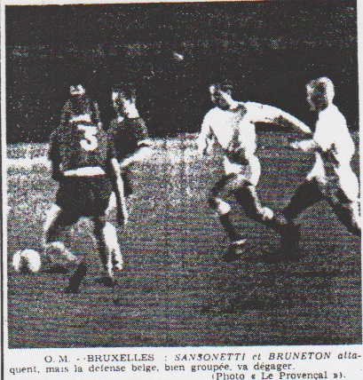 Quelques centaines de spectateurs au Stade - Vélodrome où, après exécution des hymnes nationaux, l'arbitre transalpin, M. Bonetto, libérait les joueurs mais, en même temps hélas, les écluses célestes. En effet, il se mit à pleuvoir dru et, il fallait s'y attendre, les Belges s'accommodèrent fort bien de ces conditions de jeu. Si Viaene, à la 5e minute, reprit dangereusement de volée un centre de Roy, ce furent ensuite les Bruxellois qui inquiétèrent fortement Moreira à plusieurs reprises par leur rapide ailier gauche Mertens, puis par le demi Van de Winter dont le tir fut lâché par Moreira, mais rattrapé sur la ligne (18e). La partie n'avait aucun caractère d'acharnement, mais elle n'était pas désagréable à suivre, les Belges confectionnant un solide jeu collectif sous l'influence de leur intérieur et capitaine Van den Bergh, à l'origine de la plupart des offensives, et grâce à l'activité inlassable du noir Kalunda. Si l'on sait que l'Union Sain-Gilloise est très mal classée en championnat de Belgique, on peut estimer que le niveau de cette compétition est assez relevé. Une belle action de Kalunda est enrayée par Alauzun (30e) alors que Van Valerenbergh était bien placé pour marquer. Mais, comme cela arrive souvent, ce fut l'équipe dominée qui passa le plus près de la réussite et, à la suite d'une attaque générale, Roy plaça un bon tir sur le montant gauche (35e). Immédiatement après c'était une très bonne ouverture de Stopyra vers Viaenne qui centrait trop en retrait (37e). Les deux équipes rentrèrent au vestiaire sans avoir pu ouvrir le score (alors que la pluie depuis quelques instants, avait cessé d'inonder les acteurs) malgré un bon tir à ras de terre de Viaene qui frôla cage (44e). Dès la reprise, l'O.M. rate de peu l'occasion d'ouvrir la marque par Stopyra, dont le centre tir et littéralement sorti de la cage par la tête de Vogelaere (48e). |