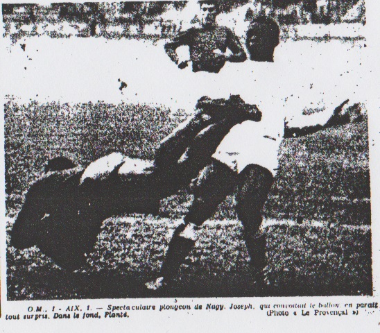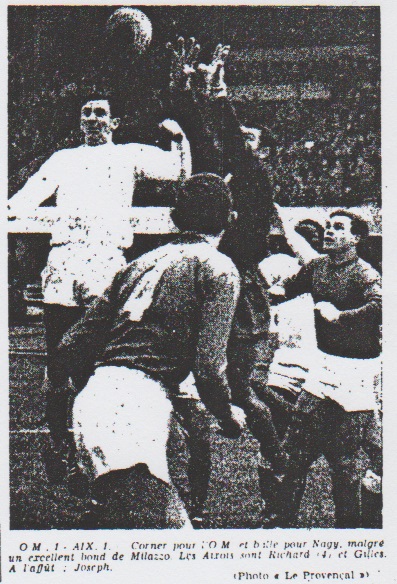 L'homme du match : Casolari L'homme du match, pour des tas de raisons diverses fut Casolari. Le bouillon est enquiquinant - ô combien ! - avant-centre aixois marqua son non seulement un très joli but, mais encore donna un mal fou aux défenseurs de l'O.M. Ses multiples démêlés avec les arrières et demis marseillais soulevèrent les clameurs du public. Il est bien certain que Casolari - et c'est tout à son honneur - est un attaquant déroutant, hargneux et sachant parfaitement protéger sa balle. Il est non moins certain que ce jeune homme joue parfois à la limite de la régularité, ce qui a le don de provoquer l'ire de ses adversaires. Ceci dit, les coups qu'il reçut, de Moulon plus particulièrement, nous ont paru dépasser la mesure admise en pareil cas. Entre footballeurs syndiqués, on ne devrait jamais confondre virilité et méchanceté. Cassar, Plazza et Nagy Casolari mis à part, Aix n'a pas fait son match habituel, surtout sur le plan collectif, ou seul Plazza et Cassar mirent régulièrement de l'ordre. Verah, dont on connaît les qualités, ne se mit en valeur que très épisodiquement. Les deux ailiers remplaçants le plus utile aurait été Rossi. Les quatre arrières Planté, Richard, Gilles et Revelli n'ont pas fait preuve de leur autorité coutumière. Leur tendance au petit jeu précis ressembla trop souvent à de l'imprudence. Nagy, enfin, exception faite de sa distraction sur le but de Viaene, fut irréprochable. Viaene futur arrière ? Il reste peu de choses à dire de l'O.M., qui vient de perdre son huitième points sur son terrain. Escale n'a pas grand-chose à se reprocher. Le tir de Casolari, dans la lucarne, était difficilement arrêtable. En défense, ou Boucher et Markiewicz surent tirer leur épingle du jeu, Moulon eut le tort de s'énerver. Dogliani et Milazzo, répétons-le, furent inférieurs à leur réputation. En attaque, le meilleur a été Peretti, qui empoisonna constamment la défense aixoise. Keller n'eut que le tort de rater deux ou trois tirs apparemment faciles, faisant suite à des actions individuelles assez brillantes. Joseph fut Joseph, avec ses défauts et ses qualités. Quant à Viaene, il prouva à ceux qui pouvaient en douter qu'il finira, tôt ou tard, au poste d'arrière. Tassone, blessé ou plutôt claqué, s'est montré courageux, ce qui ne surprendra personne. |