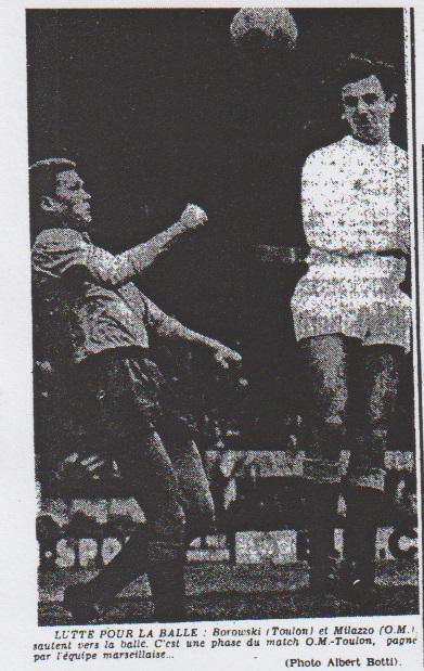 Il nous répondit en toute franchise : "Il n'y avait peut-être pas penalty, mais j'ai bien commis une faute sur Favre". Enfin penalty ou pas, M. Mouton fit jouer ce qu'on appelle la loi des compensations en n'accordant pas à Toulon, juste avant la mi-temps un penalty assez peu discutable celui-là, pour placage aux jambes de Megiolaro par Escale. Sejnera en vedette On voit donc que ce précieux succès de l'O.M. n'a pas été acquis sans mal. Le principal mérite de cette équipe olympienne, qui plia mais ne remplit jamais, et de s'être battue de bout en bout. C'est l'opinion de Jean Robin, elle nous paraît bonne. Contre une équipe de Toulon ayant justifié tout le bien que l'on pensait d'elle, l'O.M. le plus souvent dominé, incapable d'imposer franchement son jeu, lutta sur tous les fronts avec une louable énergie. Si Viaene fut le précieux finisseur de l'équipe, la volonté olympienne ne saurait être mieux incarnée que par cet étonnant petit Sejnera, meilleur "stoppeur" et relanceur d'attaque du jour. Escale, bien plus à l'ouvrage qu'Aparicio, arrêta quelques balles très dures, ne commettant, au surplus plus aucune faute. Bon match également de Tassone et de Moulon. En attaque, les actions de classe sont à porter à l'actif de Bernard et de Dogliani, ce qui ne surprendra personne. Peretti, actif, décidé, mais isolé au centre, et Milazzo, encore pas complètement guéri, surent se rendre utile. Bordere, à la place la plus ingrate de son équipe, se battit comme un lion ; tandis que Leonetti, s'il n'eut pas toujours le dessus sur Simian, se montra bon dans la partie offensive de son rôle. Simian : un réel espoir Ce qui manque le plus haut S.C. de Toulon et le sang-froid offensif. La manoeuvre souvent bonne, mais la conclusion laisse à désirer. Péché de jeunesse. Il est certain que cette sympathique équipe, avec un meilleur gardien et des avants de pointe moins "fou-fous", aurait pu causer une des surprises du jour. Cela dit, si Simian est bien un espoir du football français à son poste, Megiolaro est pétri de qualités et les anciens Oliver, Robinet, Laffont, Borowski et Pompilius n'ont pas grand-chose à se reprocher. L'arbitre, M. Mouton, il est vrai desservi par des auxiliaires à la vue basse, ne domina pas le sujet. Maurice FABREGUETTES |