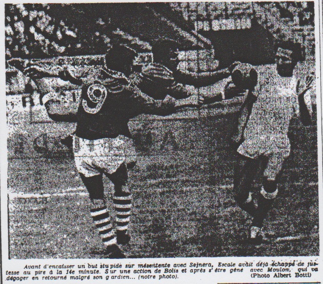 But marqué par Lekkak, au moment précis où l'O.M. dominait le plus et venait de rater 3 à 4 belles occasions d'ouvrir le score. Les sifflets ayant accompagné Marseillais étaient à peine calmés que l'on apprit la bonne nouvelle : à Montpellier, Metz était mené par 2 à 0. Ce résultat retourna littéralement le public et donna des ailes aux Olympiens. Jamais ils n'avaient été encouragés comme ils le furent durant toute la deuxième mi-temps. "Allez l'O.M. ! Allez l'O.M. !" Il ne manquait que les pétards, réservés sans doute pour le dernier match. Une ruée aveugle C'est dans ces conditions, trop favorable pour ne pas être énervantes, que les Marseillais se ruèrent à l'assaut des buts défendus par l'excellent Cluzel. Ruée vigoureuse, généreuse, mais tellemen taveugle que seul Bernard, le calme de l'équipe, réussit à tromper le gardien de Cherbourg. Pendant toute cette deuxième mi-temps, Escale toucha le ballon 2 ou 3 fois, et encore sur passes de ses arrières. C'est dire combien la domination de l'O.M., de l'O.M. déchaîné mais impuissant, fut nette. On était résigné au match nul, Cherbourg recommençait à respirer, quand M. Blum siffla le fameux coup franc qui devait transformer le résultat de la rencontre. Tout est bien qui finit bien, mais il était que temps. L'O.M. doit mieux jouer à Metz Pareille rencontre est difficile à commenter. Si l'on ne tenait compte que des qualités morales, l'O.M. mériterait la note maximum. Si l'on veut seulement se référer au jeu d'équipe, il convient de se montrer beaucoup plus réservé. Dominer n'est ni marquer, ni gagner. Tenons cependant compte du fait que les joueurs marseillais perdirent leur sang-froid et commirent de ce fait des fautes défensives et offensives, inhabituelles de leur part. Nous avons la certitude qu'ils joueront beaucoup mieux en déplacement. Sinon il n'y aura pas de "montée" possible avec ou sans barrage. Cluzel : N.1 de Cherbourg De l'équipe de Cherbourg, nous avons retenu, en première mi-temps, la valeur de Lekkak, Jubiot et Bolis. Ces trois jeunes gens "empoisonnèrent" alors la défense marseillaise. Cluzel, lui, fut excellent et la défense Cherbourgeoise dans son ensemble, assez faible. M. Blum est de ces (bons) arbitres qu'il vaut mieux avoir sur son terrain qu'en déplacement... Maurice FABREGUETTES |