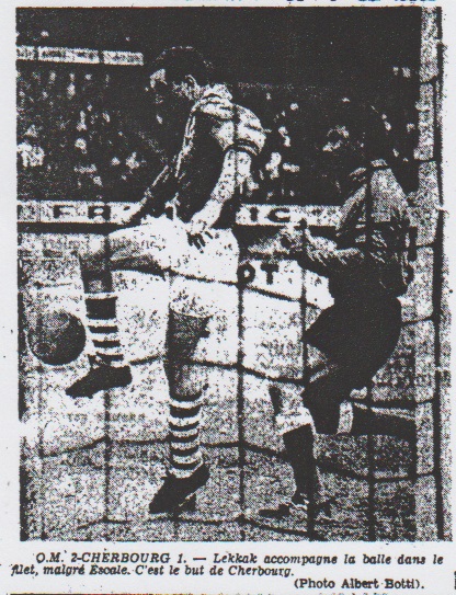 Ce n'était pas moins cinq, mais plus trois, quand M. Blum accorda un coup franc de l'O.M. pour obstruction Seddek - Sbroglia sur Keller, alors que le ballon était déjà entre les mains de Cluzel. À ce moment-là, on pouvait lire 1 à 1 au tableau d'affichage. Jean Robin était rouge à en éclater et le Docteur Luciani venait de confier à un de ses volains : "Enfin, match nul, c'est déjà mieux que dimanche dernier !" On voit à quel point ce coup franc providentiel, ce coup franc de la dernière chance, était le bienvenu. Viaene le tira en force dans le mur de Cherbourg. Il s'en suivit une mêlée d'où le ballon sortit devant le pied de Keller... et ce fut le but de la victoire. De la victoire ardemment souhaitée, largement méritée... et finalement inespérée. Le temps d'engager et M. Blum sifflait la fin, à la 94me minute. Nous vous laissons le soin d'imaginer le volume des acolamations ayant orchestré le retour des Olympiens aux vestiaires. Pourquoi M. Blum ? Ctte précieuse victoire, l'O.M. la doit à M. Blum et à Cluzel. La rencontre terminée, nous avons eu la chance d'entendre l'arbitre principal dire à l'un de ses adjoints de la touche : "Ils avaient fait trop d'anti-jeu, c'est pourquoi je ne leur ai fait aucun cadeau ; ni des arrêts du jeu, ni de ce coup franc". Même au milieu de la foule, les arbitres feraient bien de se méfier de ces quidams d'apparence insignifiante qui peuvent être des journalistes. La mauvaise humeur de M. Blum avait pour cause, essentiellement, la façon dont le gardien de Cherbourg, Cluzel "tira sur la ficelle" durant presque toute la deuxième mi-temps. À chaque fois qu'il savait le ballon - et il l'eut souvent - le gardien cherbourgeois s'appliqua à gagner le maximum de temps. Ces dégagements à retardement n'ayant eu aucune influence sur la partie, on peut affirmer que Cluzel, en indisposant M. Blum, a grandement contribué à la défaite, in extremis de son équipe. L'O.M. trop nerveux Mais nous n'aurions jamais vécu cette dramatique fin de partie si les attaquants de l'O.M. avaient transformé en buts à bonne demi-douzaine d'occasions faciles qu'ils eurent de tromper Cluzel, de la première à la dernière minute. Rarement vit-on une équipe autant dominer, mettre hors de position la défense adverse autant de fois et tirer un aussi petit profit d'un tel avantage. Cette maladresse de Keller, de Peretti de Joseph, reportez-vous au fil du match pour avoir une énumération précise, n'a qu'une cause : l'énervement collectif. Battu par le Red Star dans les conditions que l'in sait, l'O.M. avait une telle envie de ne pas connaître la même mésaventure qu'emporté pa rl'élan, le trop grand désir de bien faire, il confondit vitesse et précipitation. Le plus paradoxal est que cet excès de volonté faillit coûter la victoire à l'équipe olympienne. Bonne nouvelle à la mi-temps C'est surtout au début de la deuxième mi-temps que la chose parut évidente. L'O.M. venait de rentrer aux vestiaires avec un retard d'un but. |