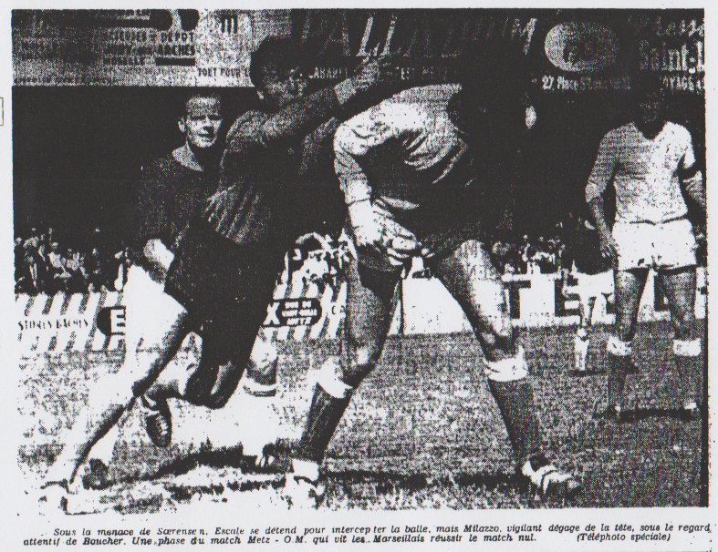 Le sauveur Escale, qui venait au cours des deux dernières rencontres disputées par l'O.M. à Marseille, de faire deux parties assez quelconques, c'est amplement racheté à Saint-Symphorien. Il ne commit aucune faute, sortit avec beaucoup d'opportunités et surtout réalisa cinq ou six arrêts magistraux qui eurent pour effet de conserver à l'O.M. le point précieux du match nul. De tout les Olympiens, il fut le seul avec le petit Sejnera à avoir joué l'un de ses meilleurs matches de la saison. Il est d'ailleurs encourageant de constater que ces deux joueurs, encore amateurs la saison dernière, furent les plus calmes, les plus précis et en définitive les meilleurs de leur équipe au cours de cette rencontre capitale disputée sur le terrain de l'adversaire. Le résultat d'une rencontre est toujours du à toute une équipe ; mais, hier à Metz, la part prise par Escale dans le demi-succès de l'O.M. fut prépondérante. Pendant le fameux premier quart d'heure de la deuxième mi-temps, qui vit Metz dominer à outrance et se montrer très dangereux, Escale se comporta en gardien expérimenté, sur de lui et audacieux en même temps. Beaucoup de qualités pour un joueur qui en est à sa première saison professionnelle. Escales mérite qu'on lui fasse pleinement confiance. Il possède les qualités qui font les grands gardiens de but. Ce qui peut parfois lui manquer s'acquiert avec le temps. |