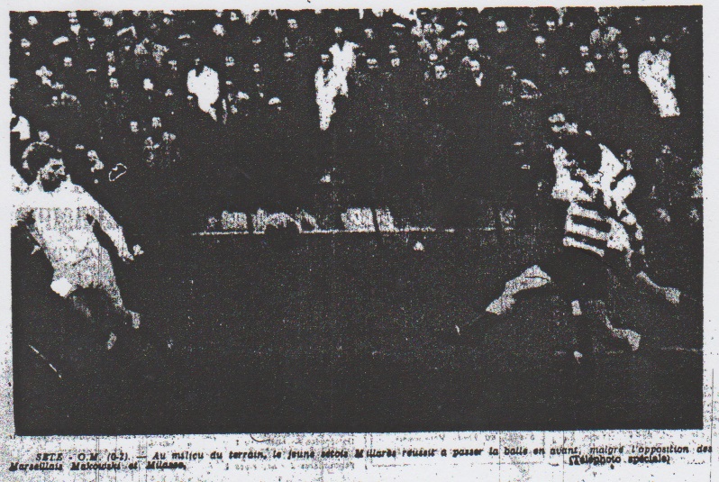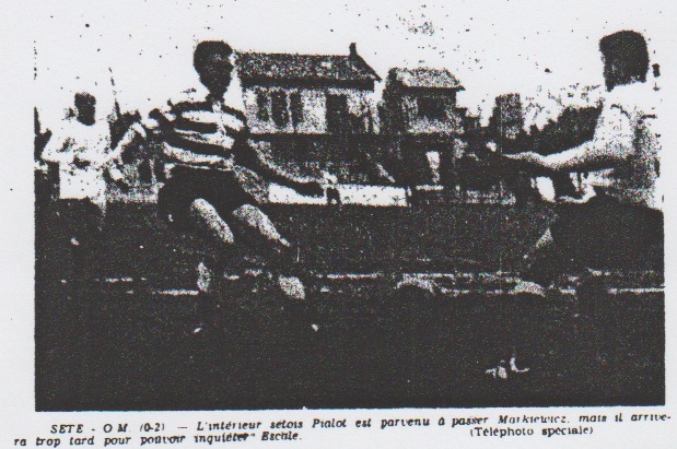 SETE - Près de 3.000 personnes et de nombreux officiels s'étaient rendus au stade Georges Bayrou pour revivre une tranche du passé : le derby Sète - O.M. traditionnel il y a une vingtaine d'années. Mais si la Coupe de France propose, le temps, lui, dispose, et c'est une tranche d'un présent particulièrement glacé que nous avons vécu en claquant des dents et en tapant du pied, hier après-midi, au pied du Mont Saint-Clair. Si encore la rencontre eut pu nous réchauffer, ce n'eut été que moindre mal il n'en fut rien, hélas, pour les supporters sétois et c'est à une partie sans histoire que nous avons assistée. Dogliani frappe d'entrée. Dès la 6me minute, l'habile Dogliani, profitant d'un assez grossier loupé de l'arrière sétois Anselme, trompe Paiola d'un tir croisé de près du gauche. Ce but assez heureux eut le mérite de décontracter les professionnels et de contracter les amateurs. Ces derniers, pourtant, par leur inter gauche Demori et leur demi-aile Miares, firent preuve durant toute la première mi-temps d'un allant et d'un courage admirable au service d'une technique non négligeable. On entendait des "Allez Sète ! Allez Sète" comme au bon vieux temps, et à deux reprises en put croire à l'égalisation. À la 15me minute, à la suite d'une belle montée l'attaque sétoise, Miares, dernier servi, et seul devant la cage de l'O.M., tira à côté. Plus chaude encore fut l'alerte pour les Marseillais à la 31me minute, sur un centre de Miares de la droite, on crut bien qu'Ascencio, de la tête, allait loger la balle dans la cage, mais le ballon passa à quelques centimètres du poteau. Pendant ce temps, l'O.M. s'était contenté de voir venir et c'est à peine si l'on put noter à son avantage un nouveau tir excellent de Dogliani faisant d'ailleurs pendant à un autre tir de Demori qu'Escale arrêta près nettement. Nouveau but de Dogliani En deuxième mi-temps, la fatigue se faisant sentir, l'O.M. prit alors la direction du jeu sans cependant forcer son talent, d'autant plus que dès la 54me minute, un autre tir de Dogliani de 20 mètres environ celui-là, avait fait mouche, pourtant l'avance des professionnels à 2 à 0. |