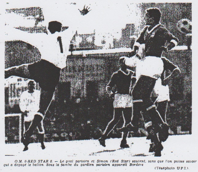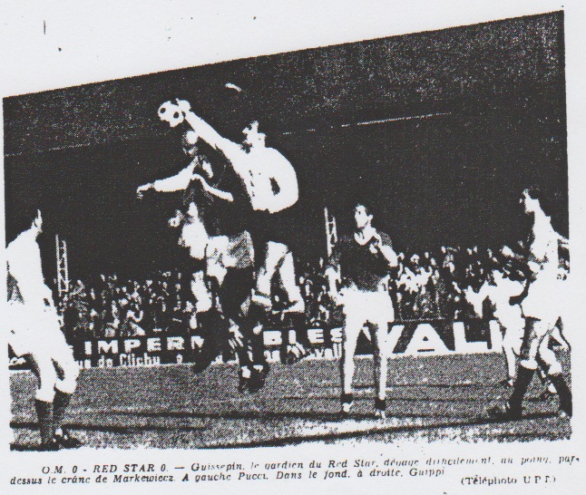 Et voilà la troisième occasion de marquer pour l'O.M. La 40e minute est entamée lorsque Baulu (encore lui) sème l'affolement dans la défense. Baulu déclenche un tir dans sa foulée. Guissepin repousse ce "boulet". Pucci bien placé, reprend le ballon et trop pressé d'aboutir manque les buts parisiens vides de défenseur. Deux minutes plus tard ce sont les buts marseillais qui sont sérieusement menacés à la suite d'un corner Pucci, replié, veut dégager son camp, le ballon dévié par le pied de l'arrière Jecker est renvoyé par le poteau droit alors qu'Escale semblait battu. Une seconde mi-temps assez confuse La seconde mi-temps sera plus confuse. Nous en parlerons de façon beaucoup plus lapidaire. Disons d'abord que Pucci commença cette deuxième période du jeu au poste d'avant-centre permutant avec Guidi. Baulu rageur et décidé mène de nombreux raids en camp adverse. C'est pourtant Grochulski qui sera le plus dangereux à la 51e minute stoppé à l'ultime seconde par Lopez. Encore Baulu 56e minute : après avoir dribblé deux adversaires, Baulu termine par un centre parfait. Pucci manque cette nouvelle occasion. 58e minute : Moy est touché et transporté sur la touche. L'O.M. concède ensuite deux corners. 66e minute : le Red-Star manqua à son tour une très belle occasion de marquer. Grochulski et Dalla Ciecca bien placés regardent passer un ballon propulsé par Taillepierre. 70e minute : tête de Taillepierre arrêté par Escale. Geridi marque 72e minute : Guidi lancé par Bordere marque un but annulé pour un hors-jeu discuté. 75e minute : corner contre le Red-Star qui menace davantage O.M. qu'en première mi-temps. 78e minute : contre-attaque menée par Tassone, puis Baulu ne peut exploiter l'ouverture. 85e et 86e minute : corner pour l'O.M. 87e minute : tir de Guidi. 88e minute : arrêt de l'Escale. Hodoul, victime de crampes s'écroule sur le terrain. C'est le dernier incident notable de ce match qui se termine par le score nul et négative de 0 à 0. Les spectateurs sifflent la sortie du Red-Star et applaudissent celle de O.M. Le paradoxe du sport a joué. |