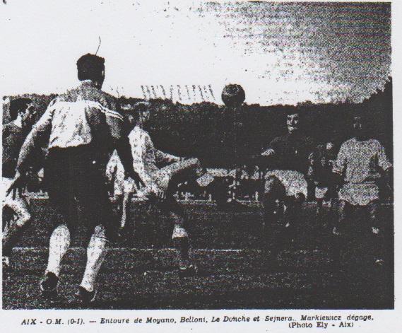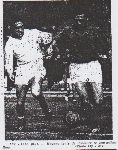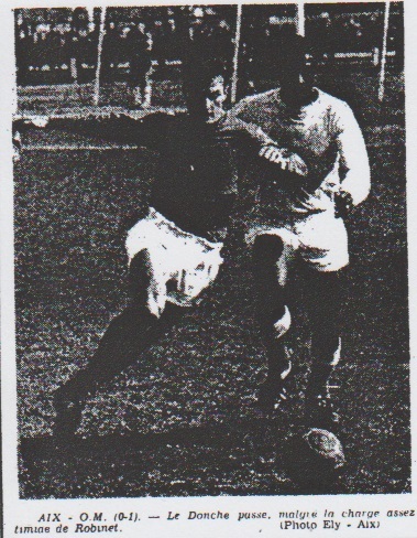 Le derby des Bouches-du-Rhône n'a pas attiré la grande foule au stade municipal d'Aix. Les équipes se présentent dans la composition suivante : O.M. : Belloni (1), Lopez (2), Jullien (3), Sejnera (4), Markiewicz (5), Roig (6), Baulu (7), Cassar (8), Joseph (9), Bordone(10), Robinet (11). Texte : Nagy (1), Plante (2), Revelli (3), Richard (4), Gilles (5), Plaza (6), Pin (7), Véran (8), Le Donche (9), Moyano (10), Taberner (11). L edébut de la rencontre ne se passe pas trop mal pour l'O.M. Dès la 1re minute, Bordone s'infiltre jusqu'au point de penalty ou il est bousculé. À la 3e minute, Cassar tire de 20 mètres et Nagy a beaucoup de mal à repousser la balle dirigée vers "la lucarne". Décontractés, les Marseillais continuent à dominer et obtiennent consécutivement deux corners. Le rythme est celui d'un match amical. Le premier tir aixois, oeuvre de Plaza, s'égare dans le virage ! D'ailleurs rien ne réussit à l'équipe aixoise qui rata un maximum de passe. Pin et la barre Il fallut attendre la 23e minute pour assister à une action aixoise valable. Moyano donne à Pin qui tira en biais et de la droite sur la transversale. Cassar et Robinet répliquèrent en obtenant un corner. On franchissait le cap de la demi-heure sans que Belloni ait touché une fois la balle. Ce fut faite à la 34e minute... à l'occasion d'une passe de Markiewicz. Deux minutes plus tard, Plaza montait à l'attaque et tirait au ras de la barre. Au-dessus vous l'avez compris. Encouragé par cet exemple, Richard tirait de loin, Belloni plongeait et arrêtait (37e). Taberner se manifestait pour la première fois et donnait un centre en retrait que Belloni cueillait en plongeant (40e) A la mi-temps donc : Aix 0. O.M. 0 La première action à noter après la pause était sur coup franc de Plaza, un coup de la tête de Moyano (51e) pas assez appuyé pour tromper Belloni. |