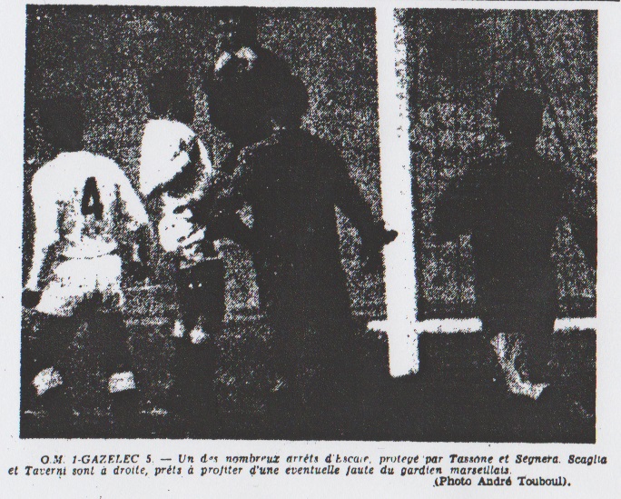 Chillan, en forme, ne faisait pas mieux. Le Gazelec : un tout homogène Le reste de l'équipe, sans que ce mot ait un sens péjoratif, forme sous la direction avisée de Cahuzac, un tout de bonne qualité. On a particulièrement admiré la virtuosité de Mehouri, le tranchant de Taverni, l'excellente "distribution" de Milazzo surtout en deuxième mi-temps et l'activité bénéfique de Scaglia. De la défense, on parlera moins car, et ce n'est pas de sa faute, la facilité de sa tâche nous interdit de la juger. Le match dura 23 minutes Le match ne dura que 23 minutes. Le temps que les Ajacciens, au rythme infernal, de faire voler en éclats la défense de l'O.M. Un but de Taverni (8me), de Cahuzac (16me) un de Kanyan (23me), la cause était entendue et les pétards n'éclatèrent plus sur la piste que pour la forme. La victoire en poche, le Gazelec, atteint un certain complexe de supériorité, leva le pied. En deuxième mi-temps, Kanyan et Taverni ajoutèrent chacun un but de plus pour leur club tandis que Scotti, d'un tir de plus de 25 mètres, sauvait l'honneur des continentaux... mais sans que les données du problème fussent modifiées. En "tuant" l'O.M. le Gazélec avait aussi "tué" le match. L'O.M., : des excuses valables Bien que sa défaite soit sans appel, l'O.M. a tout de même des excuses à faire valoir : Markiewicz, Lopez, Joseph, Robinet absents et Barellas se claqué dès les premières minutes. C'était vraiment beaucoup pour cette malheureuse équipe. Nous n'accablerons pas ses joueurs. Une défaite aussi totale interdit que soient faits des cas particuliers. Quand le navire fait eau de toutes parts, il est impossible de déterminer exactement quels en sont les responsables. Disons que les plus courageux furent Escale et Tassone, et le plus malheureux Bordone, qui rata deux balles de but à lui passées (fort habilement d'ailleurs) par Baulu. Le jeune Scotti tira deux fois fort brillamment. La première, Risterucci plongea et stoppa, la deuxième fut la bonne. Que peut-on lui demander de plus ? |
