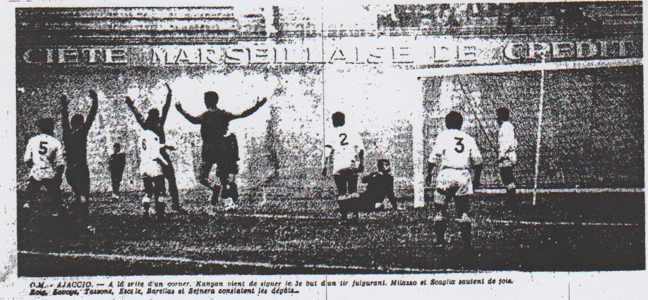 UNE SUPER-PRODUCTION CORSE, HIER AU STADE VELODROME "Mise à mort au crépuscule" Une super-vedette KANYAN, des pétards du jeu direct : G.F.C. AJACCIO : 5 - O.M. : 1
