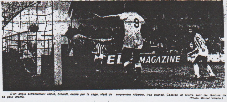 L'ailier droit de l'O.M., Roland Erhard, à assura le score à lui seul. À la 15me minute, il prit le meilleur sur Moïse, fila vers la ligne de but et de là, battit Alberto qui s'attendait plutôt à un centre, d'un tir tendu de 15 mètres. À la 76me minute, il marqua le second dans des circonstances curieuses. On entendit un coup de sifflet. Les joueurs ajacciens buant à l'arbitre. Erhardt s'empara de la balle et battit Alberto d'un tir à ras de terre, tandis que l'arbitre faisait signe de jouer. Ce fut profondément un spectateur qui joua ce mauvais tour aux visiteurs. Le jeu Il se déroula tout à l'avantage de l'O.M. qui domina dès le coup d'envoi une équipe visiteuse dont le meilleur buteur, Barrou, était très diminué. On assista donc à une débauche d'attaques marseillaises, les avants locaux bénéficiant d'un nombre rarement atteint d'occasions de buts. Il est curieux de constater qu'ils & rdeu ent-? -? -? -?.nkk- durent, pour s'imposer, se contenter d'une erreur d'Alberto et d'un véritable incident de jeu. Les contre-attaques ajacciennes trop rares se mirent pratiquement peu à l'épreuve la défense marseillaise. Les faits marquants Au nombre des occasions marseillaises, nous citerons : 22me : une belle détente de Alberto sur coup de tête de Joseph. 42me : un débordement irrésistible de Casolari qui donna en retrait... dans les pieds de Casties qu'il prit par Erhardt. 64me : sur centre aérien de Casolari, coup de tête de Joseph, à bout portant en plein sur Alberto. 65me : Série de tirs marseillais repoussés ou... ratés devant le but des visiteurs. 70me : Erhardt tire en force un penalty accordé pour main de Moise et bien repoussé par Alberto. 80me : un dribble et un tir à ras de terre de Brotons, bien arrêté par Alberto. 82me : "Caso" et Erhardt très près des buts, voient leurs tirs successivement repoussés. 85me : "Caso " de près, tir en plein sur Alberto. |