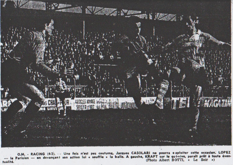 Casolari était ravi que son camarade Erhardt soit devenu le meilleur canonnier de l'O.M., mais dans son for intérieur, il rongeait son frein. Et sans le vouloir, il devait se répéter ce petit discours : "TU AS ÉTÉ EMBAUCHÉ COMME BUTEUR ET TU NE PARVIENS PAS A MARQUER". C'est décevant et humiliant à la fois. À plusieurs reprises, au cours de diverses rencontres, Casolari, shoota dans les positions les plus acrobatiques, mais la chance ne voulait pas lui sourire et il se demandait si ce mur de l'inefficacité, se dresserait longtemps devant lui, mais hier après-midi le voile des appréhensions, des atermoiements, s'est déchiré. Casolari a littéralement explosé. Trois buts en une demi-heure, c'est du stakhanovisme footballistique. En comprend dès lors de dans les vestiaires, Casolari exultait librement : "C'EST LA PLUS BEAU JOUR DE L'ANNEE...". Biancheri explique... Les Racingmen avaient une équipe incomplète, très diminuée dans le compartiment offensif. Néanmoins ils se battirent avec un grand courage et à plusieurs reprises, ils inquiétèrent les Marseillais qui faillirent même les remonter. Henri Biancheri le Marseillais de Paris nous expliquer la situation de son club : "DEPUIS PLUSIEURS SEMAINES NOUS SOMMES DIMINUES ? NOUS AVIONS PRIS SALABER ET OUDJANI COMME RENFORTS, ET CELA N'ETAIT PAS NEGLIGEABLE. MAIS VOILA QU'ILS SONT BLESSES ET NOUS NE SAVONS PAS QUAND ILS SERONT RETABLIS ! DANS CES CONDITIONS NOUS NE POUVONS PAS AVOIR DES RESULTATS SUIVIS ! PENSEZ QUE NOS AILIERS DISPUTENT LA COUPE GAMBARDELLA ! NOUS AVONS FAIT CE QUE NOUS AVONS PU, MAIS MARSEILLE A UNE EQUIPE COMPLETE, CAPABLE DE JOUER LA MONTEE." Alain DELCROIX |