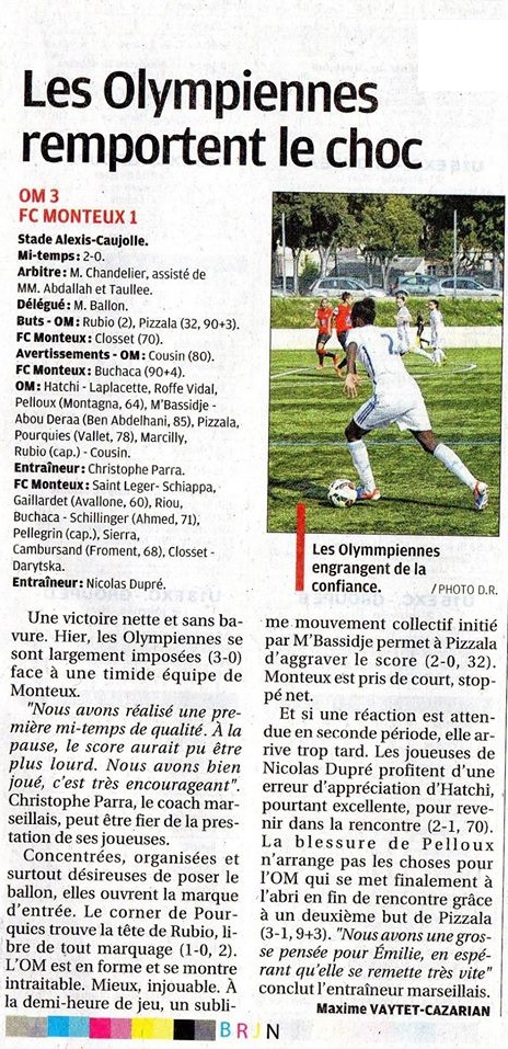 L'obsession de la victoire Malgré une fin de match stressante, les Olympiennes n'ont pas raté leur rendez-vous de haut tableau en s'imposant logiquement (3-1) contre Monteux. Elles sont deuxièmes. Petit à petit, les Olympiennes installent leur nid. Avec leurs imperfections, avec leur petit péché mignon de ne pas savoir tuer un match quand l'occasion se présente, avec cette mauvaise habitude d'offrir des buts et de contrarier leurs fins de match pour plonger leurs supporters, ils étaient plusieurs centaines ce dimanche, dans un stress inutile. Avec surtout un enthousiasme débordant, une détermination entraînante. Avec encore un véritable fonds de jeu, socle de leur parcours, raison de leur deuxième place ce dimanche soir. Jour après jour, elles apportent une crédibilité incontestable à leur histoire. Une quatrième victoire consécutive et un message envoyé : il est nécessaire de compter avec elles pour l'accession. La tête plongeante de Léa Rubio sur le premier corner de la partie, tiré par Alicia Pourquies, a installé l'équipe de Christophe Parra sur une bonne dynamique pendant les vingt premières minutes. Les Olympiennes ont alterné le jeu long et court, un peu trop insisté parfois sur la recherche de la profondeur, elles se sont sorties d'un pressing sur des petits périmètres avec intelligence, elles ont trouvé sur plusieurs ballons de rupture des solutions, grâce aux appels incessants de Pauline Cousin, une battante de premier ordre. L'intelligence de l'attaquante olympienne est d'ailleurs la cause du deuxième but, inscrit par Caroline Pizzala. Un appel croisé et, au moment où tout le stade s'attend à la voir frapper du gauche, une passe de déséquilibre du gauche : trois joueuses de Monteux embarquées, Pizzala arrive lancée et alourdit le score. C'est beau, intelligent, terriblement efficace. Les caprices d'un vent tournoyant n'ont pas apporté la sérénité requise. La bataille du milieu a été engagée, intense. Les Olympiennes ont récupéré un nombre incalculables de ballons, mais les ont souvent perdus sur la première passe en provoquant des coups francs inutiles. Rarement mises en défaut sur des attaques placées, bénéficiant de situations intéressantes mais mal exploitées en raison d'un manque de percussion ou de courses inappropriées, le collectif a été perturbé par la blessure d'Emilie Pelloux, partie vers les urgences avec une fracture du poignet. Quelques minutes de flottement, une réorganisation, des repères tardant à se trouver et un but cadeau pour pimenter la fin de rencontre. Monteux a alors poussé, le bloc olympien a reculé. L'investissement total a permis de colmater, de résister avant le coup de génie de Caroline Pizzala. Un coup franc rapidement joué, un crochet, une prise d'information et un ballon logé dans le petit filet à l'opposé. Dans la course de la double buteuse du jour vers son entraîneur, il y a l'image d'un bien-être, la libération d'un collectif récompensé une nouvelle fois de son humilité et son approche obsessionnelle de la victoire. Ce groupe marche uni. Les résultats en sont une simple et juste récompense... ______________________________________________ La réaction de l'entraîneur de l'équipe de D2 féminine de l'OM après la victoire contre Monteux (3-1), lors de la 5e journée du groupe C. "La première mi-temps a été de qualité. Nous avons certes joué avec le vent, mais en qualité de jeu, c'était très positif et très intéressant. Nous aurions dû arriver à la mi-temps avec un but supplémentaire, histoire de se mettre à l'abri un peu plus tôt, une fois de plus. A chaque sortie, nous sommes confrontés à cette situation. Il va falloir être plus buteur dans ces situations-là, pour se mettre à l'abri. Cela n'enlève rien au contenu, il a été très bon. "En deuxième période, on s'est servi des difficultés rencontrées par Monteux à jouer contre le vent durant la première période. On a mis en place une stratégie pour faire face à cette difficulté météorologique. Nous y sommes arrivés de bien belle façon et, malheureusement, on remet Monteux dans le match sur un fait de jeu. Une fois de plus, on donne un but. On n'est pas tueur et on en donne. Cela complique la donne. "Il y a un deuxième fait de jeu avec la blessure d'Emilie. Le groupe a été perturbé un instant. Il a été nécessaire de vite s'adapter. Les filles ont su faire face encore une fois avec un esprit sans faille. Il a été bénéfique car on inscrit un troisième but et on clôture le match. "Avant de nous rendre à Nivolas-Vermelle, le groupe va récupérer psychologiquement, physiquement. On a la semaine pour penser à ce déplacement." |