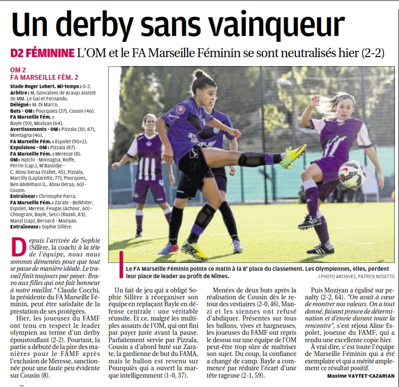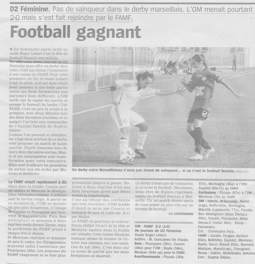 La tête à l'envers En supériorité numérique pendant plus de 80 minutes, les Olympiennes ont mené de deux buts avant de concéder le match nul. Finalité : un contenu médiocre, des points égarés et une première place perdue... Nous aimerions éviter de verser un refrain fatigant : "Un seul être vous manque et tout est dépeuplé." Pour la deuxième fois, en l'absence de Léa Rubio, les Olympiennes ont eu la tête à l'envers, plutôt de travers. On ne grandit pas seulement aux côtés d'un leader technique, on avance aussi quand il n'est pas là en retenant les leçons. L'équipe de Christophe Parra a eu le beurre et l'argent du beurre pour passer un bel après-midi : supériorité numérique après huit minutes de jeu à la suite de l'expulsion incontestable de Meresse annihilant une action de but de Cousin filant au but. L'ouverture du score, un deuxième but juste après la reprise. Les Olympiennes ont aussi tiré à deux reprises sur la transversale (Cousin, 20e, Pourquies 21e), elles ont bénéficié de nouveaux arrêts déterminants d'Anaïs Hatchi. Pourtant, avec deux buts d'avance, on ne sentait pas le collectif libéré, à l'aise. Signe trompeur ? Non, la force d'un sentiment. Au bout du compte, le FA Marseille est revenu dans la partie et mérite amplement son match nul. Le FA Marseille en voulait plus. Il a mis plus d'impact dans les duels, s'est mieux positionné aussi sur de nombreux seconds ballons. Le club voisin aurait même pu prendre l'avantage si Moziyan s'était montrée plus opportuniste lors du premier quart d'heure, ou si Laure Roffe-Vidal n'avait sauvé en catastrophe un ballon sur le point de franchir la ligne (41e). Intenable, l'attaquante du FAM a été un souci constant : les Olympiennes ont éprouvé les pires difficultés pour canaliser ses courses, ses déplacements, sa pointe de vitesse. D'un point de vue global, l'absence de réflexion collective a été une contrariété permanente : des positions de hors-jeu fréquentes face à une défense jouant la ligne nécessitait quelques petits réglages pour évacuer le problème ; l'oubli de fluidifier le jeu face à un adversaire évoluant à dix ; précipitation dans l'animation offensive ; manque de percussion sur les côtés. La réduction du score de Bayle, totalement isolée au second poteau sur un long coup franc, repose la question sur la régularité de concentration sur les coups de pied arrêtés défensifs. Le penalty, indiscutable, apporte un point final à un après-midi gâché. Les points perdus à domicile ne se rattraperont pas aussi facilement. La conclusion est un nouveau message d'alerte : pour ne pas avoir pris la mesure du fauteuil dans lequel elles étaient assises depuis la semaine dernière, les Olympiennes ont été priés d'aller s'asseoir un étage au-dessous. L'inconstance a un prix : elles ne sont plus leaders. Le contenu de leur match le justifie... ______________________________________________ La réaction de l'entraîneur de l'équipe de D2 féminine après OM 2-2 FA Marseille - Saison 2014-15 - Groupe C - 9e journée. "On récolte ce que l'on sème. Sans être transcendant en première mi-temps, on arrive à la pause avec un avantage. On essaie de recadrer à la pause, on inscrit un deuxième but rapidement. Et puis, soudain, on oublie qu'on est là pour faire du sport, pour jouer. "Aussi bien sur le plan de l'esprit, qu'au niveau technique, du respect des règles du jeu. Quand on tombe sur une équipe qui met du coeur et de la qualité dans ce qu'elle entreprend, quand on se cache, on ne joue plus, quand on ne défend plus ses valeurs, quand on ne sait plus aller de l'avant, ni être juste sur le plan technique, sur celui des déplacements, il arrive une journée de ce type : l'équipe plus dans le jeu revient au score. "C'est riche d'enseignements pour la suite. On va laisser les filles se reposer, récupérer, on en a tous besoin. Il y a surtout un problème de jeu et de justesse dans le jeu. Bien souvent, le jeu est impulsé par la motivation. Aujourd'hui, c'était trop insuffisant. On attend plus de tout le monde, on attend plus des 16 joueuses. Malheureusement, aujourd'hui, il y en avait seulement 15. Si je dis, 16, ce n'est pas pour rien. "Le problème n'est pas de gérer cette première place, mais de jouer, de s'amuser et de prendre du plaisir. Il y a eu 30 minutes en deuxième période complètement désastreuses."