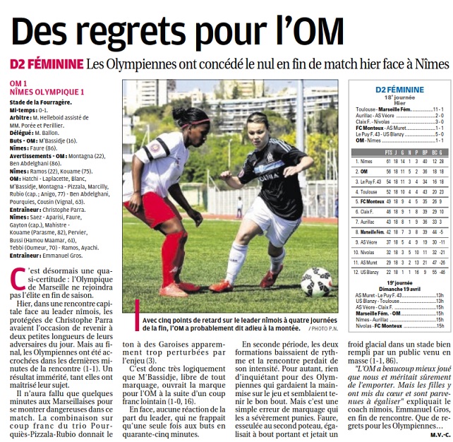 Il manque un souffle... Malgré une première période de grande qualité, les Olympiennes ont mené pendant plus d'une heure avant d'être rejointes à trois minutes du coup de sifflet final. Une erreur, une seule a été payée cash ! Il manque un souffle. Un souffle de perfectionnisme. Un souffle de réalisme offensif. Un souffle de réalisme défensif. Un souffle de concentration. Un souffle d'exigence, en somme. Ce n'est pas énorme, mais c'est l'ambition nécessaire pour prétendre au haut niveau. Les Olympiennes sont passées à côté d'un match fait pour elles. Elles l'ont pris par le bon bout en se présentant en 4-3-3 avec une première mi-temps de grande qualité. Très grande qualité. Dans l'investissement, dans la discipline tactique, dans la rigueur. Elles ont pressé haut et ont poussé Nîmes à reculer, à commettre des fautes. Tactiquement, la simplicité technique pour avancer verticalement en franchissant les deux premiers rideaux défensifs gardois leur a permis de peser. Un placement juste, un bloc défendant en avançant soit pour couper la relation entre le trident offensif nîmois et Ramos, soit pour freiner les longs ballons défensifs gardois vers leur ligne offensive. Dans l'animation, en mettant de la variété du rythme surtout, de l'application technique, en se servant de la mobilité des joueuses autour de la porteuse du ballon, les Olympiennes ont maîtrisé le milieu et la première mi-temps. Leur mobilité était intéressante. C'est simple : Nîmes ne s'est procuré aucune occasion. Mener à pause grâce à l'ouverture d'Anaïs M'Bassidjé a été, à cette heure, une juste récompense. Mais il manque un souffle de réalisme. Offensif d'abord quand on revoit les trois situations de but au début de la seconde période : un ballon de Ben Abdelghani trop tardivement donné à Pizzala lancée à toute allure vers le but dans une situation à 1 contre 3. Le ballon en profondeur de Pizzala à Cousin encore, seule face à Saez et le lob mal ajusté. Dans ces matches de grande importance, quand on oublie de tuer le match, on finit par être puni. Il manque alors un souffle de réalisme défensif. Les Olympiennes n'ont pas eu sur la deuxième période la main sur le jeu comme en première : elles ont reculé, commis plus de fautes. L'animation a perdu en fluidité. Le mouvement a été moins présent face à un bloc nîmois positionné un peu plus haut, mais par forcément dangereux. En sans concéder d'occasions, les Olympiennes ont été rejointes. A 3 minutes du coup de sifflet final face à une formation dont le jeu est en grande partie axé sur les longs ballons, mais aussi performante sur les coups de pied arrêtés. Un coup franc excentré de Ramos, un oubli sur le second ballon et Faure égalise. L'erreur de concentration coûte cher au regard de tous les efforts consentis depuis le coup d'envoi. Telle est la réalité du sport. Elle n'autorise pas le moindre écart. Les Nîmoises chantaient : "On est en D1 dans le vestiaire". Ce n'est pas encore le cas, mathématiquement, mais la maturité de leur collectif plus expérimenté doit être une expérience supplémentaire pour les Olympiennes. Viser plus haut est un travail de chaque instant. Un souffle, il manque un souffle. Le souffle de l'exigence... ______________________________________________ La réaction de Christophe Parra après OM 1-1 Nîmes - Saison 2014-15 - D2 féminine - Groupe C - 18e journée. "Avant de parler de déception, il n'est d'ailleurs pas nécessaire d'en parler, les filles ont évolué comme il le fallait pendant 87 minutes avec beaucoup de concentration, de rigueur, de sérieux. Malheureusement, nous n'avons pas su concrétiser les occasions que nous avons eues et nous aurions d tuer le match bien avant. "C'est le constat établi. Il faut en tirer des bénéfices pour la suite. Il manque un peu d'expérience sur le but ? Alors, il y a-t-il faute ou pas ? On verra sur les images, mais nul ne pourra revenir sur ce fait de jeu-là. "Dans le haut niveau ou l'approche du haut niveau, les matches sont faits de détails. C'est dommage car en maîtrisant les détails, on n'aurait pas pris ce but. On avance en se trompant. On va continuer à travailler, mais bravo aux filles. Ce n'est pas fini. "Le travail est une vertu. Il faut travailler quand tout va bien mais aussi dans les moments difficiles. On va s'appuyer sur les erreurs pour continuer à faire avancer le groupe."