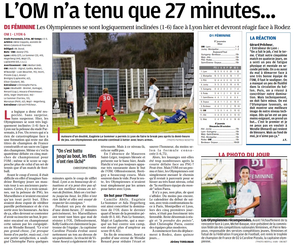 C'était écrit Devant 1685 spectateurs, les Olympiennes ont porté haut les couleurs du club. Malgré leurs efforts, elles se sont inclinées face à Lyon (1-6), multiple champion de France, au-dessus dans tous les domaines. Viviane Asseyi est tout de même parvenue à inscrire un but. Jusqu'ici, les Lyonnaises n'en avaient pas encaissé. Il n'y pas à rougir de cette défaite face à l'Olympique Lyonnais. S'incliner face à la meilleure équipe d'Europe n'est pas une honte, loin de là. Les Olympiennes se sont battues pendant plus de quatre-vingt-dix minutes sans ne jamais lâcher et en portant fièrement les valeurs du club. L'OM a tenu pendant 27 minutes puis a cédé en concédant le premier but de la rencontre inscrit par Abily. Pourtant, jusque-là, les Olympiennes étaient bien en place et leur coach leur demandait de ne surtout pas reculer et de jouer haut. Alors certes, elles n'ont pas eu la possession du ballon. Aussi, les Lyonnaises ont dominé les débats techniquement et physiquement. Mais cette supériorité s'inscrit dans la logique. Entre une équipe promue et une équipe championne d'Europe et championne de France depuis une décennie, il paraît normal d'assister à une rencontre déséquilibrée. Pourtant, il y a beaucoup de frustration : celle d'encaisser des buts sur des erreurs individuelles, largement évitables. À l'image du mauvais dégagement de Laplacette terminant au fond des filets. Tout de même, ce genre de rencontre permet de grandir, d'apprendre de ses erreurs. À côté de cela, il y a tout de même une grande satisfaction que l'on savoure encore : celle d'avoir inscrit un but à cette équipe lyonnaise car depuis le début du championnat, Bouhaddi a gardé ses cages inviolées. La palme revient à Asseyi auteure de son deuxième but en deux matches. Pleine de sang-froid, l'attaquante olympienne a profité d'une erreur technique de Renard pour lui chiper le ballon et partir au but pour enfin tromper la gardienne lyonnaise. Devant 1685 spectateurs, les Olympiennes ont tout donné, fourni beaucoup d'efforts pour titiller l'équipe adverse. Cela a marché durant une demi-heure avant que la machine lyonnaise se mette en route. L'OM n'a rien pu faire face à Lyon. Mais c'était écrit... |