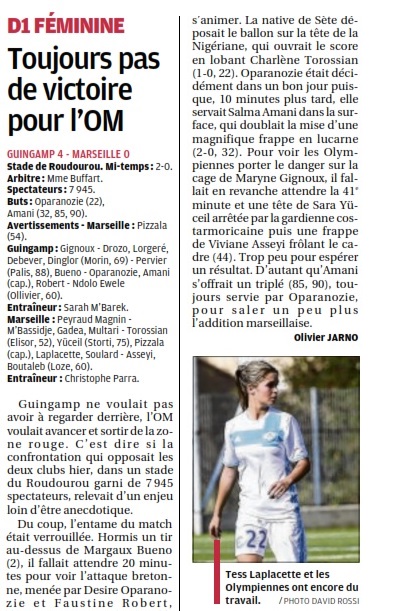 Sévère Les Olympiennes ont lourdement chuté à Guingamp, malgré un contenu en grande amélioration. Les Bretonnes ont donné une leçon de réalisme. Le maintien reste d'actualité, comme au début de saison. Il y a des contrastes contrariants. Cela peut paraître déplacé, mais dans le contenu, dans la circulation, les déplacements, l'animation, les Olympiennes ont certainement rendu leur meilleure copie. A côté de ce constat, subsiste une réalité froide, terrible : le résultat. 4-0, c'est dur. Sévère appuierons-nous au regard de la rencontre. Si le staff a une lecture plus développée, car il doit analyser tous les aspects d'une rencontre et ne pas se limiter au seul tableau d'affichage, la frustration est grande. Elle se lisait sur son visage dans le vestiaire à la fin de la rencontre. Pourtant, les Olympiennes ont semblé trouvé plus d'aisance technique dans le 3-5-2 travaillé dans la semaine, elles se sont exprimées avec plus de simplicité trouvant les relais comme espéré, avec un jeu plus fluide. Le match a été agréable à suivre, mais cela reste encore insuffisant. Il manque encore la pertinence dans les phases de rupture pour inquiéter plus souvent la défense adverse, de la consistance offensive, de la détermination dans la surface, de l'agressivité dans les zones défensives où il est indispensable d'être respecté. Le déficit de puissance, dans les duels est aussi handicapant pour le collectif, trop souvent pénalisé. Dans le jeu, dans l'animation, il n'y a pas d'écart, mais au final il y une défaite. Pourquoi ? Guingamp a été réaliste, opportuniste et nul ne peut lui enlever cette qualité indispensable en D1 pour avancer. Le duo Amani-Oparanozie a causé beaucoup de dégâts, par l'aisance technique de la première, la puissance et la percussion de la deuxième, dans tous les bons coups. Les Olympiennes n'ont pas su régler le problème exposé progressivement au fil des minutes, malgré une possession de balle supérieure. Le pire : à chaque fois où une situation de but se présentait pour leur permettre de recoller, elles ont été sanctionnées. La jeunesse de l'effectif est une autre raison, il convient de prendre plus conscience de l'exigence du haut niveau, de mûrir individuellement. Dans les prochaines semaines, le travail se situera sur cet axe-là. A ce jour, l'objectif reste le maintien, comme énoncé en début de saison par le staff. |