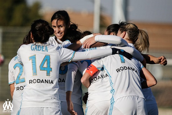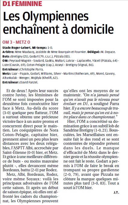 Les Olympiennes enchaînent En s'imposant 3 buts à 0 face au FC Metz, concurrent direct pour le maintien, l'OM remonte au classement et prend 7 points d'avance sur son concurrent du jour. Le vent a tourné pour les Olympiennes. Souvent peu ou pas payées depuis le début de la saison, elles sont actuellement dans une phase positive où la réussite est enfin de leur côté. Trois semaines après leur exploit face à Juvisy, les joueuses de Christophe Parra se sont offert un succès précieux face à un concurrent direct dans la course au maintien. En revanche, si le tableau d'affichage fait apparaître un écart conséquent entre les deux formations, la partie n'a pas été simple pour l'OM cet après-midi dans le froid du stade Roger-Lebert. D'entrée, les Lorraines ont mis la pression sur les Olympiennes en jouant haut avec beaucoup d'impact sur la porteuse de balle. Bien plus à l'aise techniquement que ses adversaires, la bande à Coton-Pelagie est parvenue à mettre en place son jeu par séquences, mais n'a jamais pu se défaire du pressing des Messines, la faute également à un trop grand nombre de petite erreurs dans la circulation du ballon. La lumière est venue d'un but aussi superbe qu'inattendu de "Brétigoal", auteur d'un lob subtil depuis l'extérieur de la surface de réparation pour tromper Laar, trop avancée. Un vrai bijou. En face, Metz, même mené, est resté fidèle à son plan de base en usant de longs ballons dans le dos de la défense dirigée par Kelly Gadéa. Un jeu stéréotypé, mais efficace pour faire déjouer les Olympiennes. Battu dans les duels, souvent corrects et parfois trop âpres, l'OM n'a pas réussi à se mettre à l'abri sur les occasions suivantes et n'est pas passé loin de l'égalisation messine avant la pause, sur le premier tir cadré du FCM. Au retour des vestiaires, l'impact est resté lorrain. Surprise, l'équipe de Christophe Parra a plusieurs fois frôlé la sanction, mais Peyraud-Magnin et ses défenseurs sont restés vigilantes lorsque les attaquantes de David Fanzel n'ont pas manqué de justesse. Grâce à la vitesse d'Asseyi et de Lozé, les Olympiennes se sont à nouveau offert quelques opportunités pour faire le break, mais il a toujours manqué un petit quelque chose pour concrétiser. Frustré jusqu'ici, le public a exulté lorsqu'à la suite d'un centre de Soulard, infatigable sur son couloir droit, Godart a dévié la balle dans ses propres filets. Quelques instants plus tard, leur bonheur a été total quand, sur une combinaison travaillée à l'entraînement, Caroline Pizzala est venue couper au premier poteau un coup-franc millimétré de Coton-Pelagie. Toujours sous la pression messine, les dix dernières minutes se sont écoulées au son des tambours et des chants des supporters sans qu'il n'y ait vraiment à s'inquiéter. Le score final est large, trop certainement au regard de la rencontre, mais il précieux pour l'OM dans sa quête de maintien. Les Olympiennes enchaînent, se donnent un peu d'air au classement et se rapprochent à point de leur prochain adversaire, Saint-Etienne (6e). Dans le Forez, la tâche ne sera pas aisée, mais d'ici-là, sans se relâcher, les filles peuvent savourer. Leur travail quotidien est en train de payer.. |