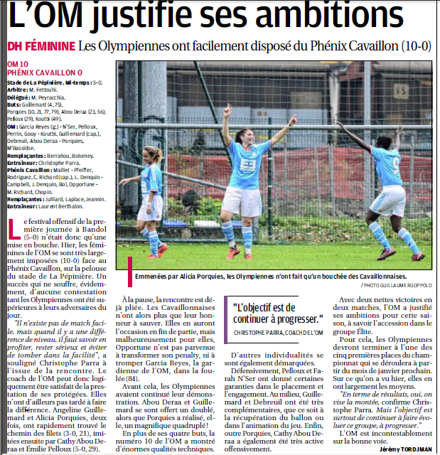Les buts : 5ème : frappe d'Angeline Guillemard à droite à l'entrée de la surface de réparation. Ça fait 1-0 au bout de 5 min de jeu à peine. 8ème : Débordement d' Elodie Debreuil coté gauche qui centre pour Alicia Pourquies qui pousse le ballon dans les filets après un petit cafouillage. 19ème : Magnifique frappe pied gauche d'Alicia Pourquies à l'entrée de la surface plein axe. À la 19ème minute. Ça fait 3 à 0 pour l'OM. 21ème : Frappe des 20 mètres excentrée à gauche de Cathy Abou-Deraa qui se loge sous la barre de la malheureuse gardienne de Cavaillon. À la 21 eme minute. Ça fait 4 à 0. 25ème : Corner au second poteau d'Alicia Pourquies catapulté de la tête par Émilie Pelloux à la 25 eme, ça fait 5 à 0. 50ème : Et pour son 21 eme anniversaire, Sarah Koutbi à inscrit un magnifique but des 35 mètres ! Ça fait cette fois ci 6 à 0. Pour de bon!!! 56ème : Débordement côté droit de Sarah Koutbi qui ajuste un magnifique centre au second poteau à l'entrée de la surface de réparation pour Cathy Abou- Deraa qui ajuste la gardienne d'une jolie frappe du pied droit à la 56eme, ça fait 7 à 0 en faveur de l'OM. 71ème : magnifique une deux dans la surface de réparation entre Angeline Guillemard et Anaïs M'Bassidjé qui remet sur la capitaine qui place un plat du pied droit dans le petit filet droit de la gardienne. 78ème : ça fait 9 à 0, sur un 1 contre 1 gagné par Alicia Pourquies du pied gauche. 79ème : centre de Jenna Berrahou déposé sur Alicia Pourquies qui inscrit le 10 eme but. La gardienne adverse semble blessée , physiquement et sort portée par deux de ses coéquipières . Elle est remplacée par une joueuse de champs. Tactique : Le système de jeu est un 4-2-3-1 pour le début de match. La compo: Marta Garcia-Reyes dans les buts, en charnière centrale: camille Perrin à gauche et Émilie Pelloux à droite, latérale droite: Farah N'Ser ,latérale gauche: Laura Gouy. Milieux: à gauche Elodie Debreuil et à droite Angeline Guillemard la capitaine. En pointe: Anaïs M'Bassidjé. Et sous la pointe: à gauche: Cathy Abou-Deraa, à droite Sarah Koutbi et en 10: Alicia Pourquiès. Sur le banc Jenna Berrahou et Osrra Bolomey. |