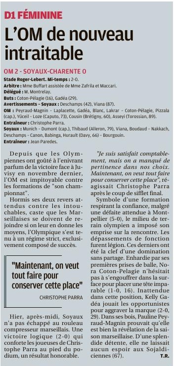 Le message des Olympiennes En s'imposant face à Soyaux (2-0) et pour la septième fois consécutive à domicile, les Olympiennes confortent leur quatrième place et envoient un message fort à leurs poursuivants. Elles se sentent bien à cette place et ne la céderont pas. Aujourd'hui, les Olympiennes ont envoyé un message. Un message à tous leurs poursuivants. Il sera difficile de les déloger de la quatrième place, leur quatrième place, acquise il y a maintenant plusieurs semaines. Sur le plan comptable, bien sûr, tout est encore possible. Mais avec cette nouvelle victoire, la septième de rang à domicile, l'OM creuse l'écart avec son adversaire du jour. Mieux encore, le nul de Juvisy face à Rodez et la défaite de Guingamp contre Albi permettent à l'OM d'accroître son avance sur ses poursuivants. Le succès acquis face à Soyaux est, une nouvelle fois, le fruit d'un travail accompli. Rien ne leur a été offert. Il y avait dans les esprits, le match aller, perdu de manière cruelle dans les arrêts de jeu. Mais depuis cette rencontre, beaucoup de choses se sont passées. Les Olympiennes ont enchaîné les succès, ont pris conscience de leur potentiel. Une équipe de plus, Soyaux, a fait les frais d'un collectif olympien irréprochable. En même temps, comment faire tomber cette équipe olympienne ? Elle produit sans cesse du jeu, elle offre de superbes séquences, elle se fait plaisir, tout simplement. Le but de Nora Coton-Pelagie en est la plus belle preuve. Parfaitement servie par Lozé, sa tête piquée fait mouche. Le lendemain de son anniversaire. Dans l'ensemble, Soyaux a eu le ballon sans vraiment trop se projetter vers l'avant, hormis dans le dernier quart d'heure de la rencontre où il a fallu un exploit de Peyraud-Magnin pour empêcher le ballon de rentrer dans sa cage, mais Soyaux a été gêné par le pressing des Olympiennes et a fait beaucoup d'erreurs techniques profitant aux joueuses de Christophe Parra. Si les Olympiennes se sont rapidement mises à l'abri grâce à Kelly Gadéa, le regret de ne pas avoir su aggraver le score pourrait être le seul bémol de la journée. Entre la reprise de Pauline Cousin au-dessus ou bien la frappe de Viviane Asseyi repoussée par la gardienne soljadicienne, les occasions nettes ont bel et bien été présentes. Tout de même, le travail a parfaitement été réalisé aujourd'hui. Lors de leur prochaine rencontre, dans deux semaines, un succès face à Bordeaux permettrait aux joueuses de Christophe Parra, d'assurer définitivement leur quatrième place... Plus que jamais, les Olympiennes sont candidates ! Auteur : Camille Daurès |