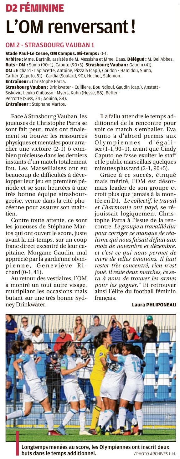 Menées 1-0 à la fin du temps réglementaire, les joueuses de Christophe Parra ont trouvé les ressources pour recoller au score puis prendre l'avantage dans le temps additionnel. Les Olympiennes profitent du faux-pas de Saint-Étienne, leur concurrent direct pour la montée, à Nancy. L'OM est seul leader du championnat ! Il y a des matchs où les émotions sont plus fortes que d'autres. Cette rencontre face à Strasbourg en est la plus belle illustration. Devancées par Saint-Étienne au classement d'un petit point, les Olympiennes avaient l'obligation de gagner si elles voulaient croire encore à une éventuelle accession en D1. Seulement elles sont tombées face à une équipe de Strasbourg bien armée et venue à Marseille pour jouer. Les Olympiennes se sont laissées piéger en fin de première période. La capitaine adverse a ouvert le score sur coup franc direct permettant ainsi à Strasbourg de regagner le vestiaire avec l'avantage au tableau d'affichage. En seconde période, les Olympiennes évoluaient avec le vent en leur faveur et se sont procurées un nombre incalculable d'occasions. La gardienne strasbourgeoise, en feu, a réalisé des parades exceptionnelles et lorsqu'elle était battue, ses coéquipières faisaient le travail. Seulement, à force de persévérance, la chance a fini par sourire aux Olympiennes dans le temps additionnel. D'abord, Sumo trompait Drinkwater d'une frappe dans la surface de réparation. Puis, l'arbitre accordait un dernier coup franc à l'OM. Pizzala s'en est chargé, trouvant Caputo au second poteau qui ne laissait aucune chance à la gardienne adverse. Le stress et l'impatience ont laissé place à une explosion de joie. D'autant plus que Saint-Étienne n'a ramené qu'un match nul de Nancy (2-2). Les Olympiennes prennent donc, seules, la tête du classement et sont plus proches que jamais d'un retour en D1. Leur destin est entre leurs mains... La réaction de Christophe Parra "Je suis très fier de ce que les filles ont réalisé. Ce n'est pas évident. C'est ce qui nous a manqué durant le mois de novembre qui a été compliqué. Des équipes qui sont venues jouer de cette façon là, ici, il y en a eu quelques-unes et on n'avait pas connu l'échec. Aujourd'hui, le groupe a pris en maturité, en harmonie, en cohésion. Le résultat du jour en est le fruit. Bravo à elles même si on a été en difficulté en première mi-temps. En deuxième mi-temps, le travail a été fait pour mettre en difficulté le bloc adverse. On a beaucoup pêché dans la finition. La beauté du sport, c'est ce que nous avons vécu aujourd'hui. Tout est réalisable même dans les situations les plus critiques. C'est une belle leçon de sport. Ce groupe travaille. Il n'y a pas de calcul, il faut tout gagner." |
