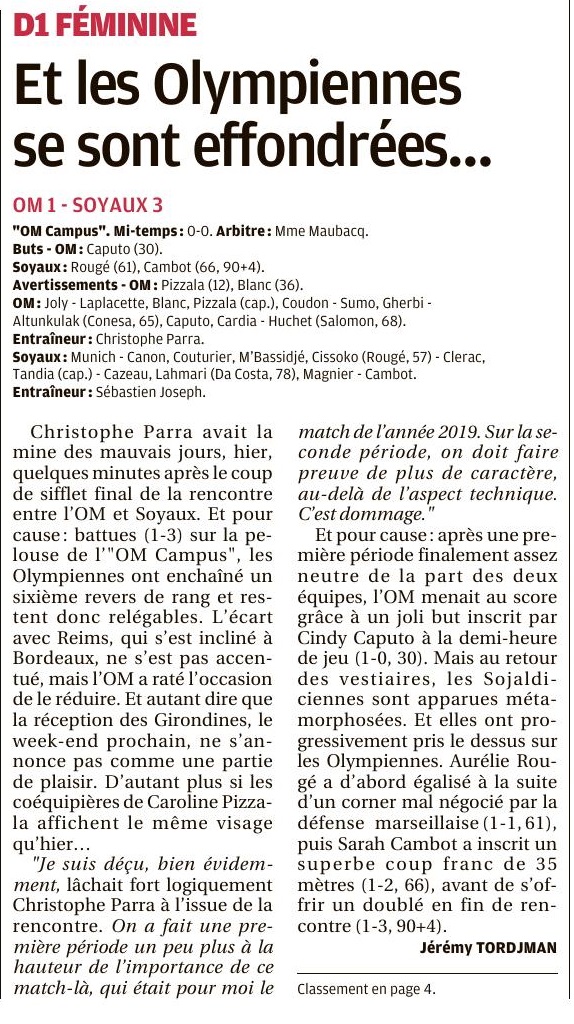 La réaction de Christophe Para "On est déçu. Nous avons fait une mi-temps un peu plus à la hauteur de l'importance de ce match-là. C'était pour moi le match de l'année 2019. Sur la deuxième période, il faut faire preuve de plus de caractère. Cela reste des matches particuliers. C'est dommage. Soyaux a relevé le défi sur la deuxième mi-temps avec des filles de caractère, ce c'est qu'il nous a manqué. On prend un but sur un cafouillage. Comment lutter contre l'adversité ? Ce sont des ballons qu'il faut arriver à sortir. Le troisième est anecdotique. On recule, on est moins efficace sur les coups-de-pied arrêtés. Il fallait avoir plus de caractère, on a essayé de mettre du sang neuf en faisant des changements." |