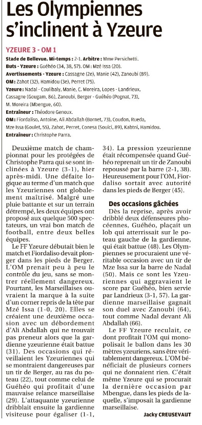 Pour son deuxième match à domicile, le FF Yzeure a remporté une victoire probante contre une très bonne équipe de l'Olympique de Marseille (3-1), dimanche. Une victoire qui lui permet d'occuper la troisième place du classement. Dimanche, Marseille a présenté une équipe complète dans toutes ses lignes avec quelques très bonnes manieuses de ballon et qui a mis d'entrée un gros impact physique. Face à une telle équipe, les Yzeuriennes ont montré qu'elles avaient sérieusement progressé dans l'engagement physique. Très solidaires, elles ont toutes enfilé le bleu de chauffe pour réussir à faire plier les Marseillaises qui avaient ouvert le score sur un corner repris de la tête par Yrma Mze Issa (1-0, 20 e). Le FF Yzeure a été solide défensivement et s'est montré efficace offensivement avec notamment Cynthia Guéhéo, auteur d'un triplé. Trois buts qui concluaient des mouvements collectifs intéressants. Par ailleurs, le FF Yzeure s'est procuré plusieurs occasions nettes par Julie Berger (45 e) et Myriam Zanoubi (64 e), mais Thelma Fiordaliso, la gardienne marseillaise, s'est montré à son avantage. Et elle a été sauvée par son poteau sur une frappe de Cynthia Guéhéo. Petit bémol à ce match plein des Yzeuriennes, elles ont encore encaissé le premier but et encore sur un coup de pied arrêté. Prochain match à Arlac-Mérignac " C'est notre point faible, constate le coach Théodore Genoux. Malgré ça, les filles ont su réagir rapidement. On savait que l'impact physique jouerait un rôle important et elles ont été bonnes dans ce domaine. Elles ont fait preuve de beaucoup d'abnégation et de solidarité. Elles ont vraiment su appliquer le plan de jeu, je suis vraiment content de cette victoire méritée, surtout que Marseille a une bonne équipe qui va en embêter plus d'un. " Ce dimanche, le Football Féminin Yzeure se déplace à Arlac-Mérignac (11 e) avant de recevoir Le Puy (9 e).