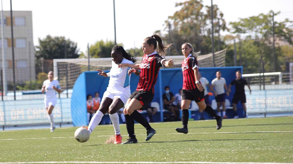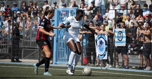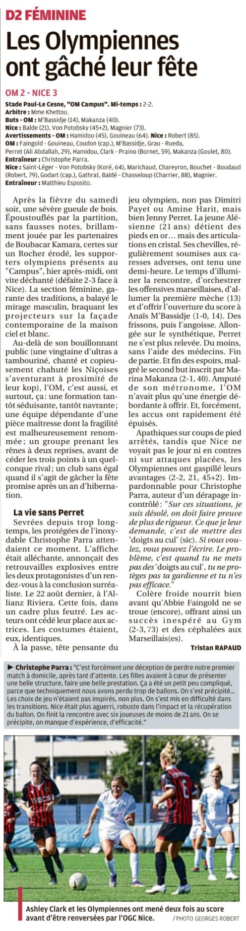 OM-Nice (2-3) : l'OM s'incline Alors que les Olympiennes ont mené à deux reprises dans la rencontre, elles se sont inclinées 3-2 face à Nice. Sous une chaleur presque insoutenable, les Olympiennes, encouragées par leurs supporters venus en nombre, mettaient tout de suite le pied sur le ballon. Décidées à occuper la moitié de terrain niçoise, les joueuses de Christophe Parra ouvraient le score au quart d'heure de jeu. Perret obtenait un corner après une jolie frappe, cette dernière se charger de le tirer et M'Bassidjé d'un coup de tête permettait à l'OM de mener. Sur leur première véritable occasion, les Niçoises égalisaient sept minutes plus tard. À la demi-heure de jeu, l'OM subissait un coup dur avec la sortie sur blessure de Perret, touchée à la cheville. Les chants des supporters poussaient les Olympiens à ne pas se décourager et à aller, de nouveau, de l'avant. Et leurs efforts finissaient par payer puisque Makanza redonnait l'avantage aux Marseillaises après 40 minutes de jeu. Malheureusement, un coup-de-pied arrêté niçois était fatal pour les Olympiennes, rejointes au score quelques secondes avant la pause. En deuxième période, les Olympiennes ne réussissaient pas trouver la faille malgré leurs incursions dans la surface adverse. À contrario, Nice inscrivait un troisième but sur une frappe écrasée qui trompait Faingold. Malgré leurs deux buts inscrits, les Olympiennes subissent leur première défaite de la saison et auront deux semaines pour travailler avant leur prochaine rencontre de championnat. |