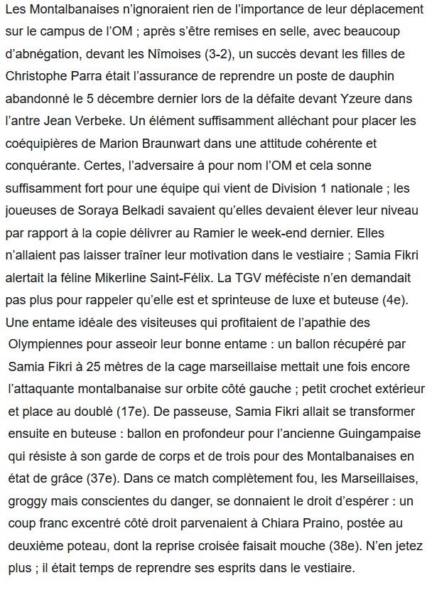 Dimanche après-midi, l'équipe féminine de l'OM a été battue à domicile par Montauban. Tout est allé très vite dans le match en retard de la 11e journée du groupe B de D2 féminine. Les deuxièmes du championnat ont rapidement pris les devants avec un doublé de Saint-Félix. Ilana Goulet a réduit l'écart mais Fikri a donné un avantage de deux buts à Montauban. Au classement, l'OM est huitième avec 11 points. Lors de la prochaine journée, le dimanche 6 février à 14h30, les joueuses de Christophe Parra accueilleront Grenoble Foot (6e). |