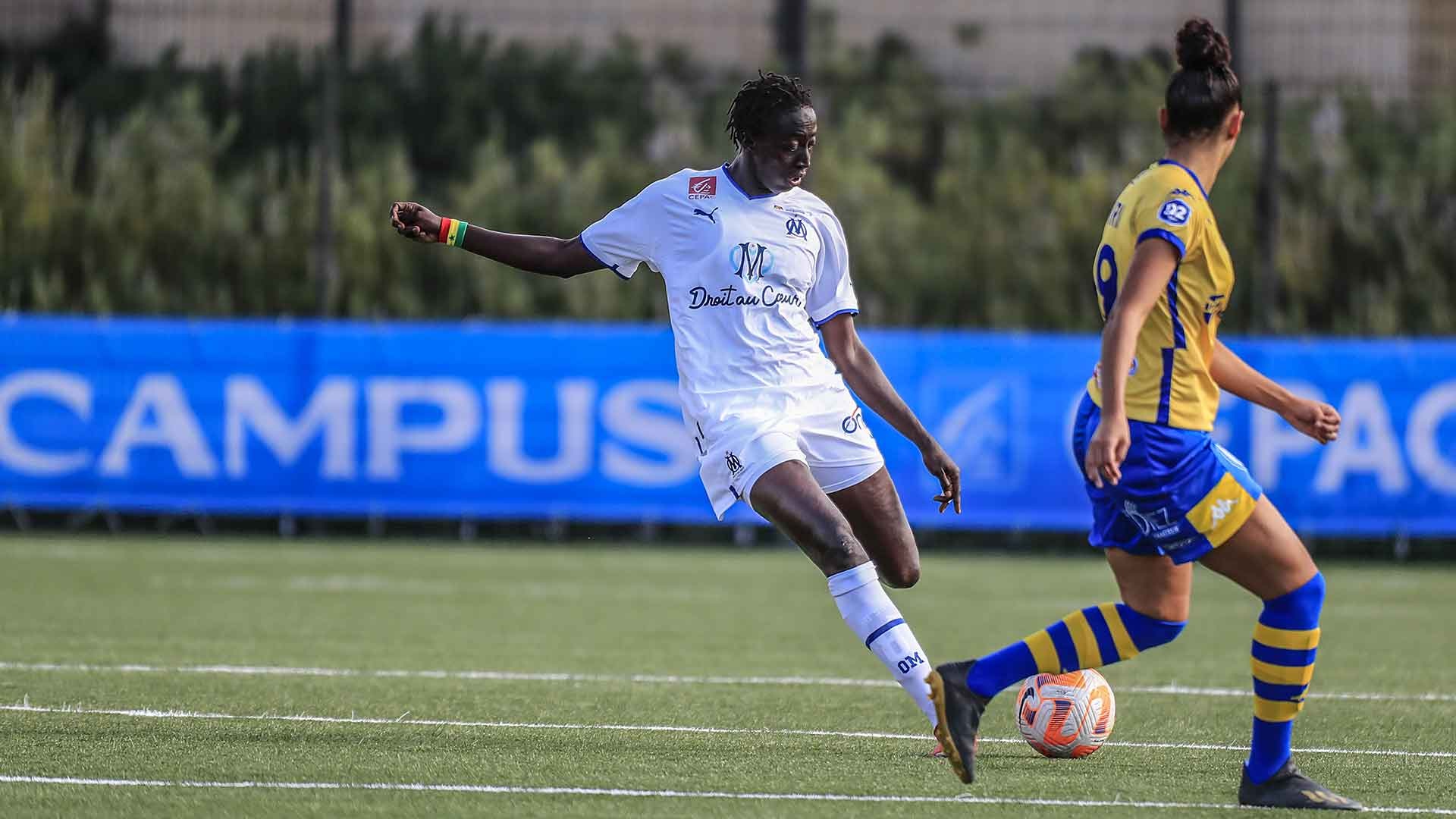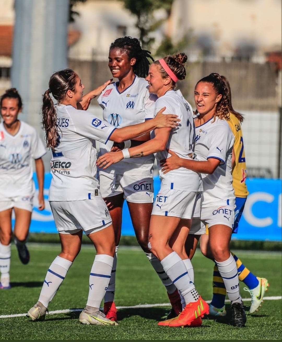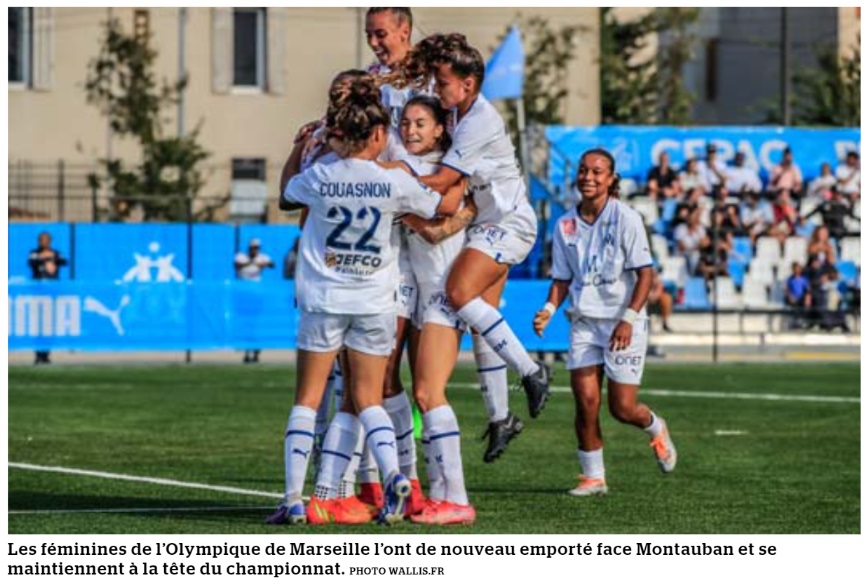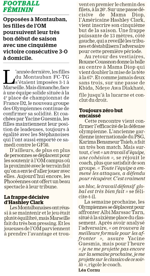 Notre équipe de D2 Féminine poursuit son parcours sans-faute en alignant un cinquième succès contre Montauban. La réception de Montauban, quatrième avant cette cinquième journée de D2F, était le premier véritable test face à une équipe du haut de tableau pour nos Olympiennes. Elles ont parfaitement négocié cette rencontre avec un premier but de la capitaine Ashley Clark avant la demi-heure de jeu. En seconde période, les Sénégalaises ont aggravé la marque. Mama Diop, tout d'abord a superbement repris de la tête un centre de Roxane Couasnon, puis en fin de match Ndeye Awa Diakhaté a trompé la gardienne adverse. Avec ce succès, le cinquième en autant de journées, l'OM est deuxième avec 15 points à égalité avec le leader, l'AS Saint-Etienne, qui a une meilleure différence de buts (+25 contre +18). Lors de la prochaine journée, le dimanche 23 octobre à 13 heures, la formation de Yacine Guesmia se déplacera sur la pelouse d'Albi Marssac, septième avec 6 unités. |