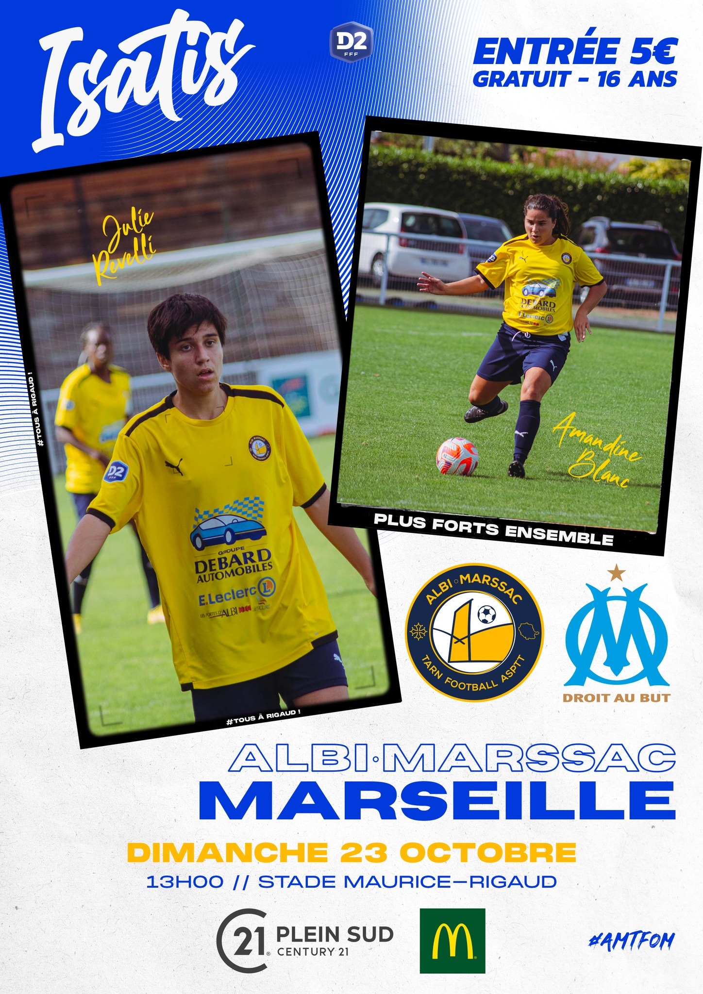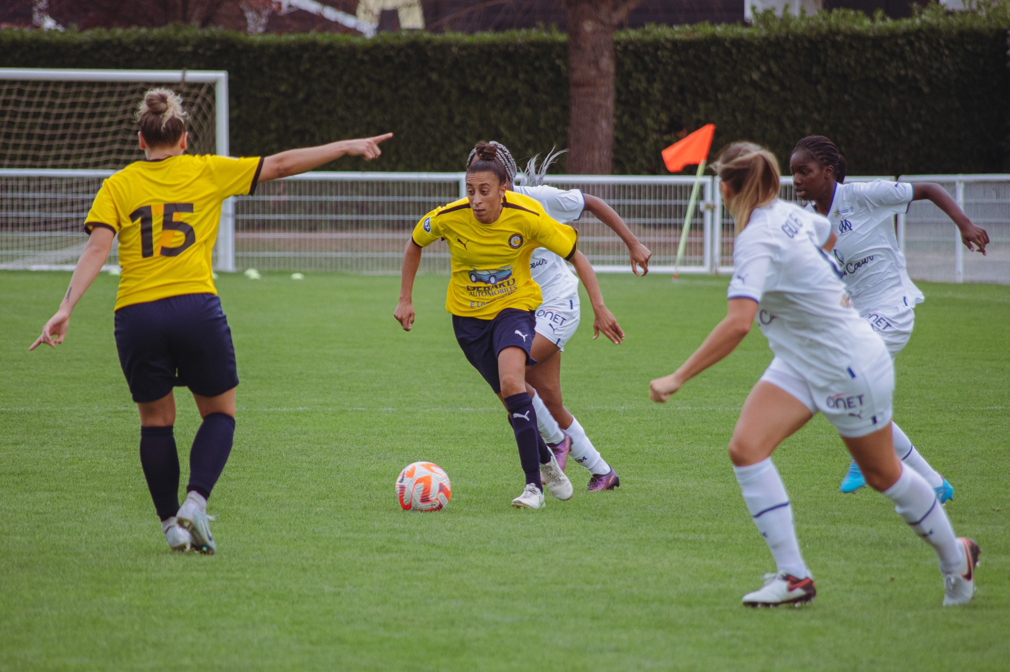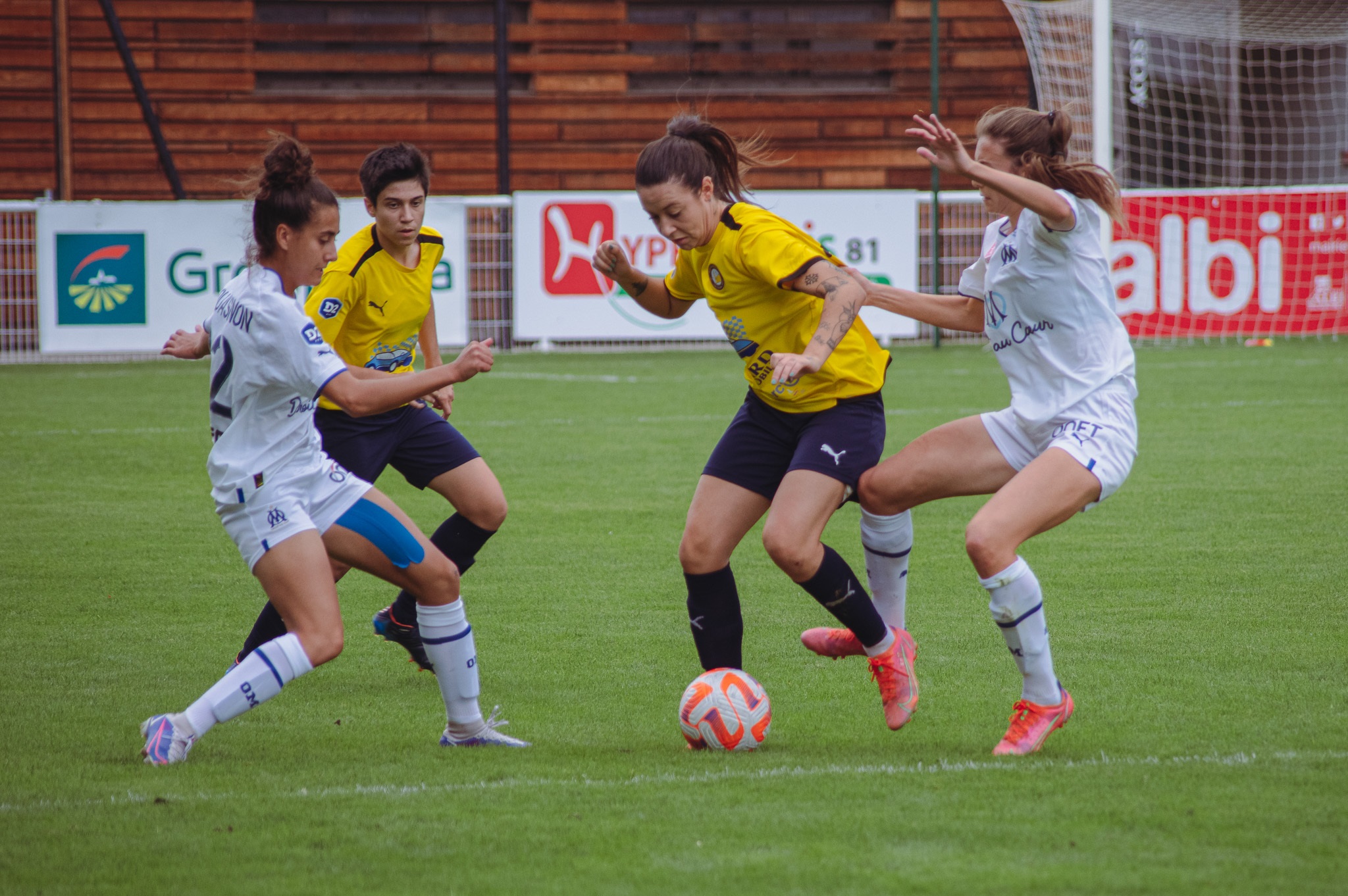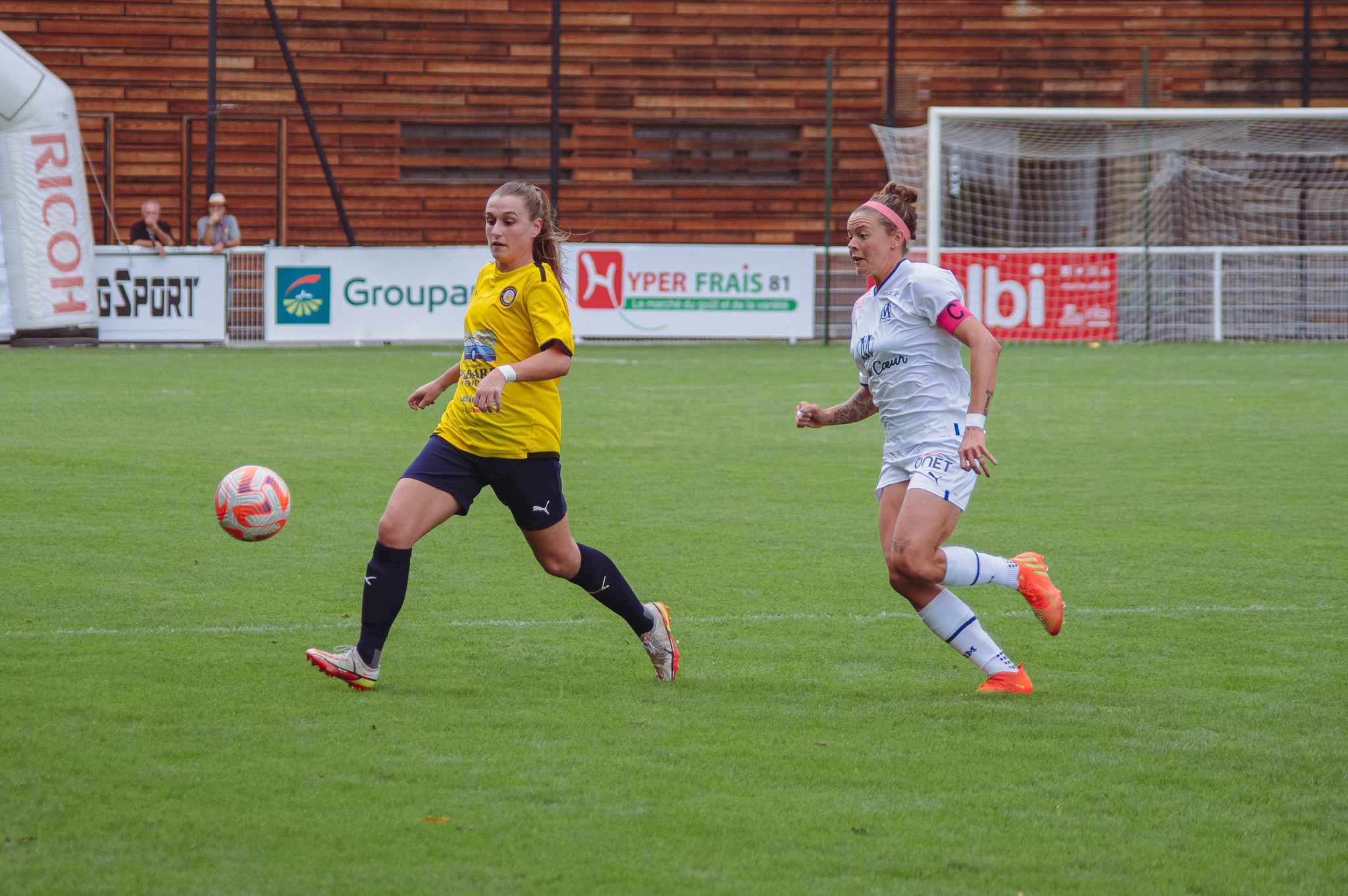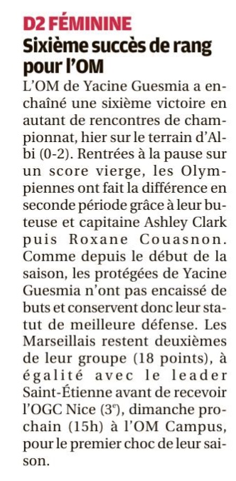 Notre équipe de D2 Féminine poursuit son parcours sans-faute en alignant un sixième succès sur la pelouse d'Albi. Après leur succès à domicile face à Montauban, nos Olympiennes se déplaçaient sur la pelouse d'Albi Marssac TF. Il aura fallu attendre l'heure de jeu pour voir un premier but de la capitaine Ashley Clark (58') d'un superbe enchaînement. Roxane Couasnon (90') enfonça le clou dans les arrêts de jeux avec une frappe dans les abords de la surface. L'OM reste deuxième avec 18 points à égalité avec le leader, l'AS Saint-Etienne, qui a une meilleure différence de buts (+31 contre +20). Lors de la prochaine journée, le dimanche 30 octobre à 15 heures, la formation de Yacine Guesmia accueillera l'OGC Nice troisième avec 15 points. |
