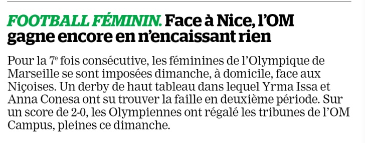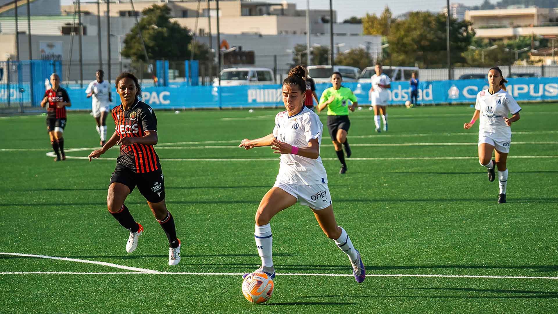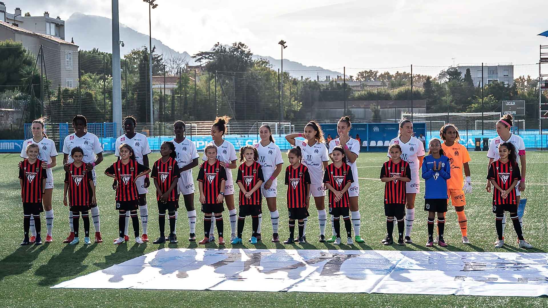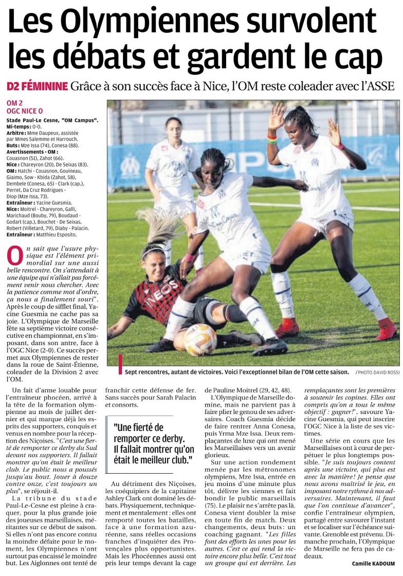 Saint-Etienne, premier du groupe et vainqueur du Toulouse FC la veille confortait sa première place avec 3 points d'avance sur nos Olympiennes. Nice, en embuscade, avait seulement trois points de retard sur les joueuses de Yacine Guesmia. Dans un OM Campus acquis à la cause de nos Olympiennes, il aura fallut attendre la 75e pour prendre les devants au tableau d'affichage. Rentrées en cours de jeu, Yrma Mze Issa (75e) et Anna Conesa (89e) on su faire plier la formation niçoise dans le dernier quart d'heure de jeu. Avec cette victoire 2 buts à 0, l'OM recolle à Saint-Etienne en tête du classement mais reste deuxième à la différence de but. Lors de la prochaine journée, le dimanche 6 novembre à 15 heures, nos Olympiennes se déplaceront sur la pelouse du Grenoble Foot 38 Auvergne, neuvième avec 7 points. |