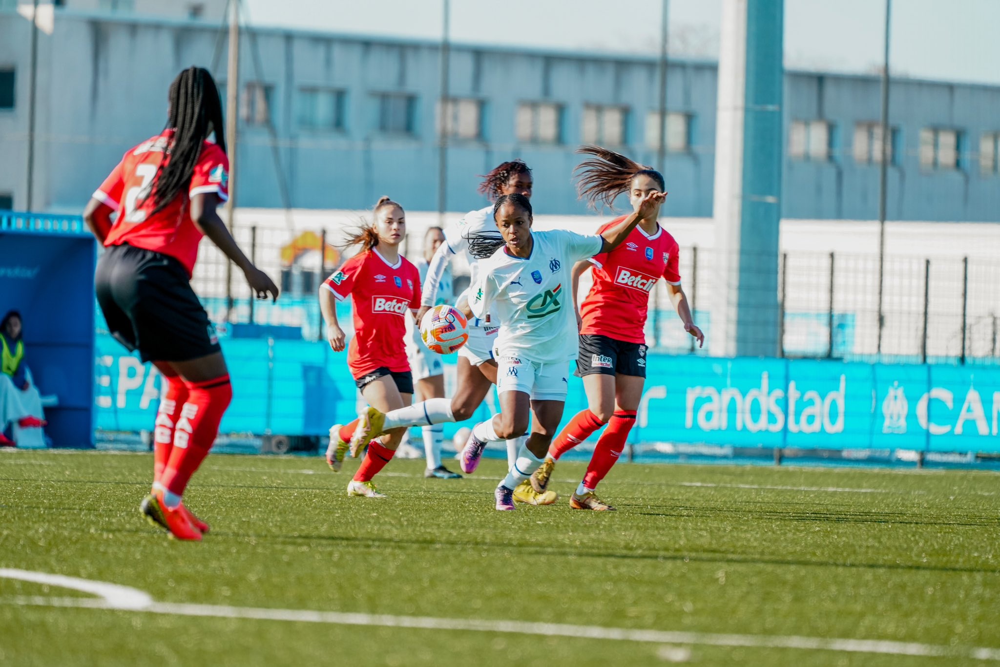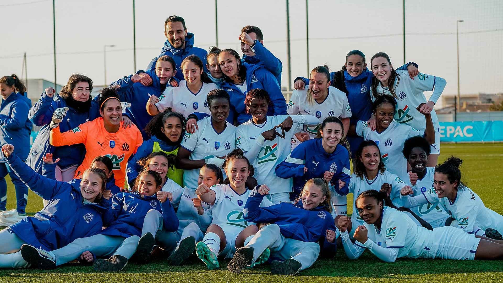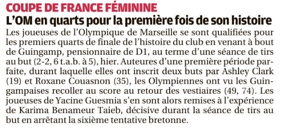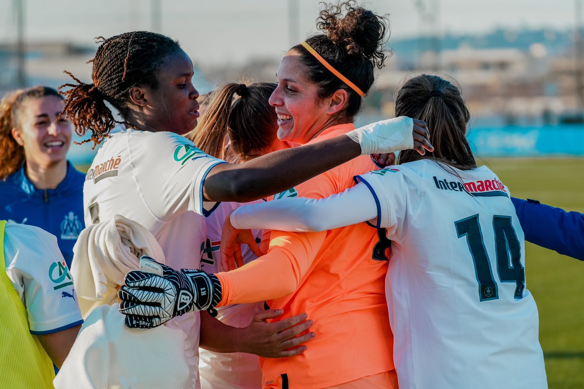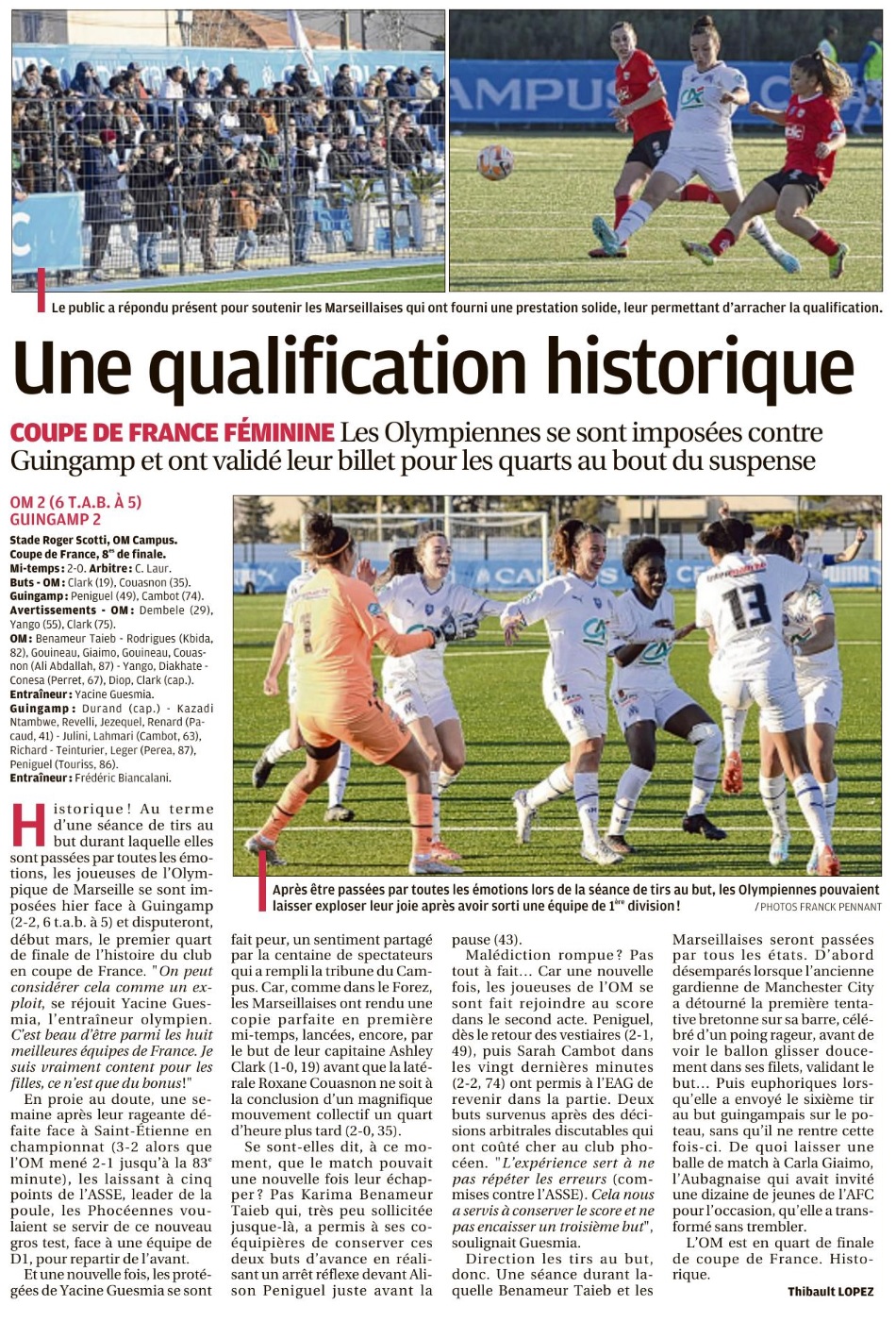 Dimanche après-midi, l'OM s'est qualifié pour les quarts de finale de Coupe de France féminine en éliminant l'En Avant Guingamp aux tirs au but. La réception d'une équipe de D1 en huitième de finale de Coupe de France féminine avait valeur de test pour les joueuses de Yacine Guesmia qui jouent les premiers rôles en D2. Nos Olympiennes ont pris le match par le bon bout en marquant deux buts en première période par Ashley Clark et Roxane Couasnon. Les Bretonnes ont réagi en seconde période. Alison Peniguel et Sarah Cambot ont contraint l'OM à disputer la séance des tirs au but. Nos tireuses n'ont pas tremblé et se sont imposées 6 à 5 dans cet exercice. L'OM jouera donc pour la première fois de son histoire les quarts de finale de Coupe de France féminine. Le tirage au sort se déroulera le jeudi 2 février à midi. |