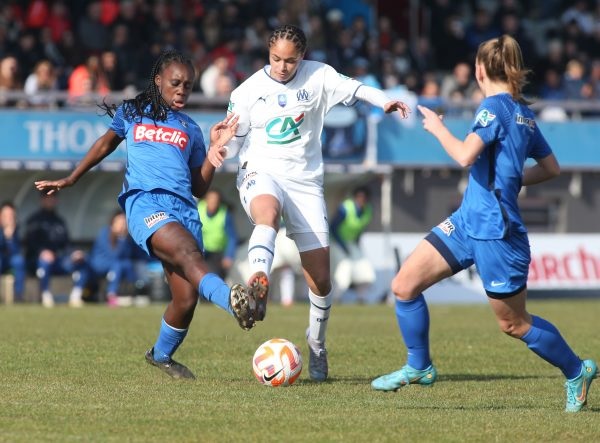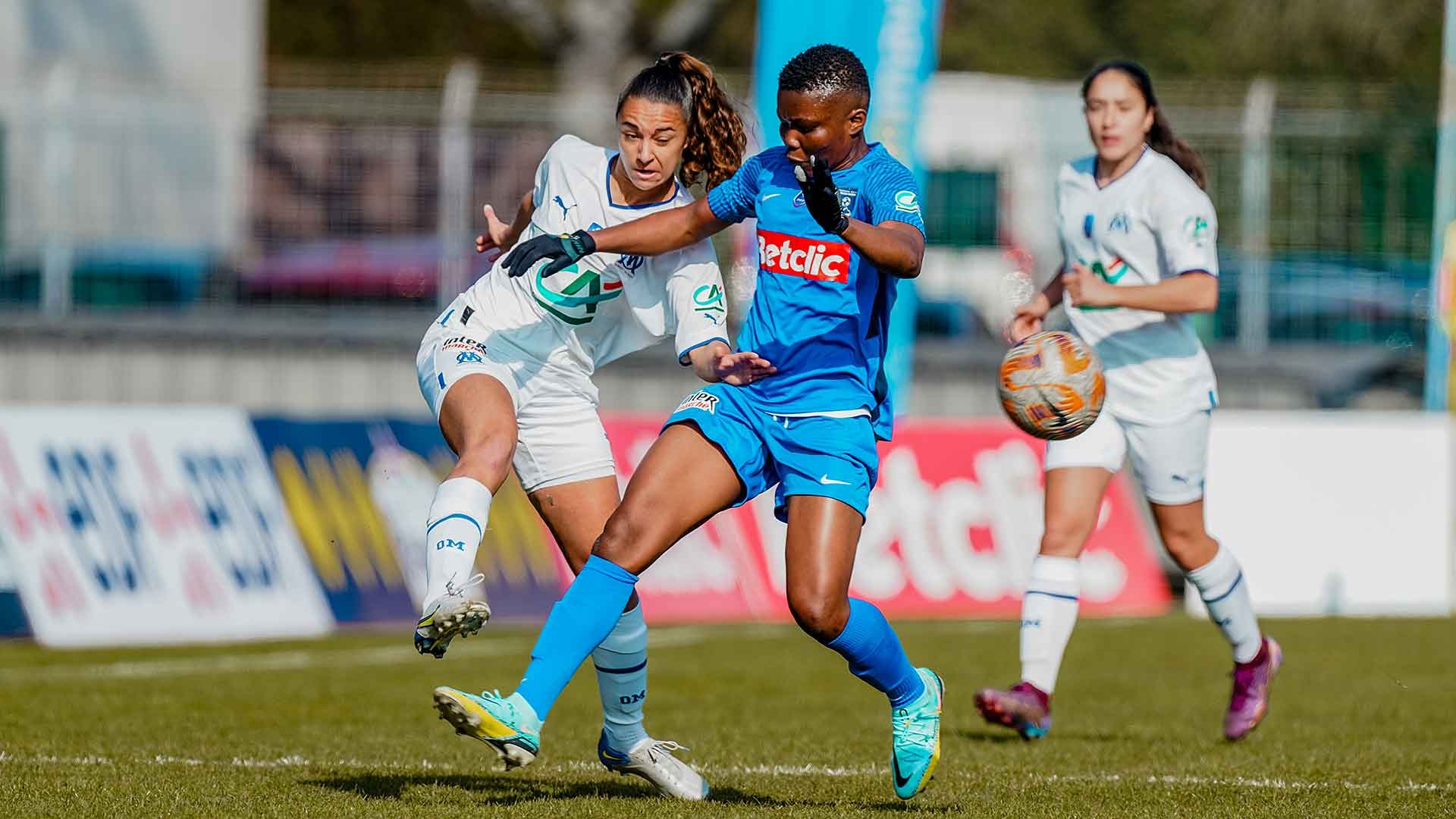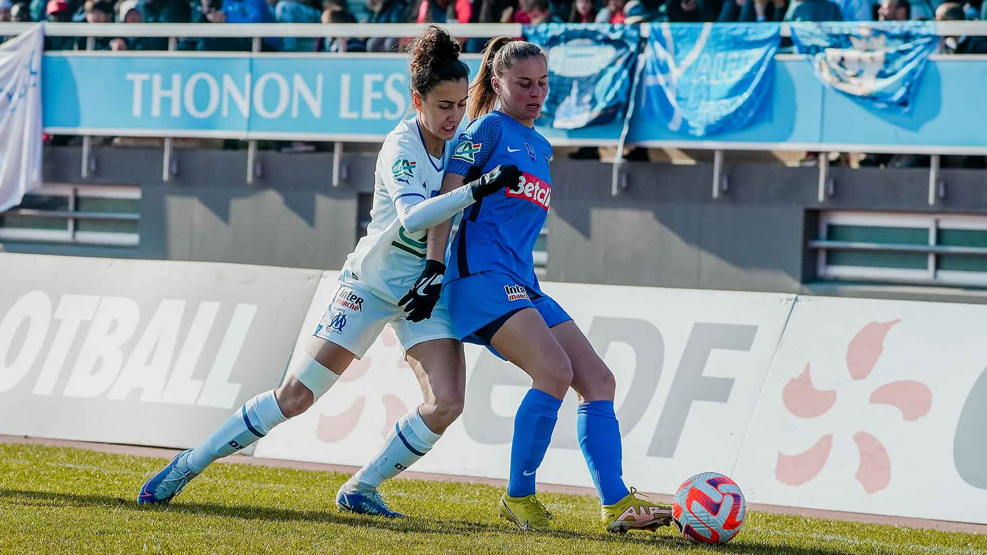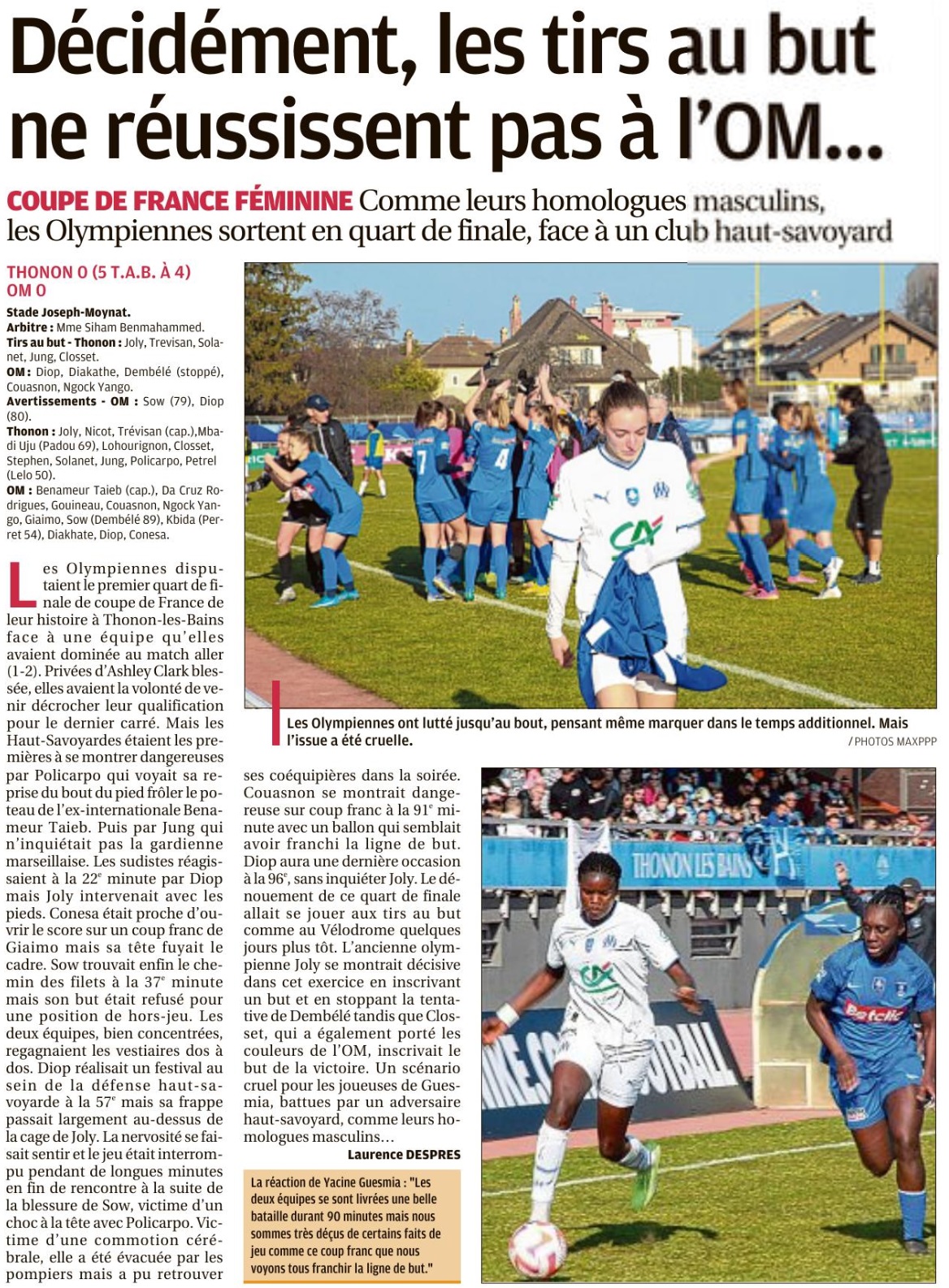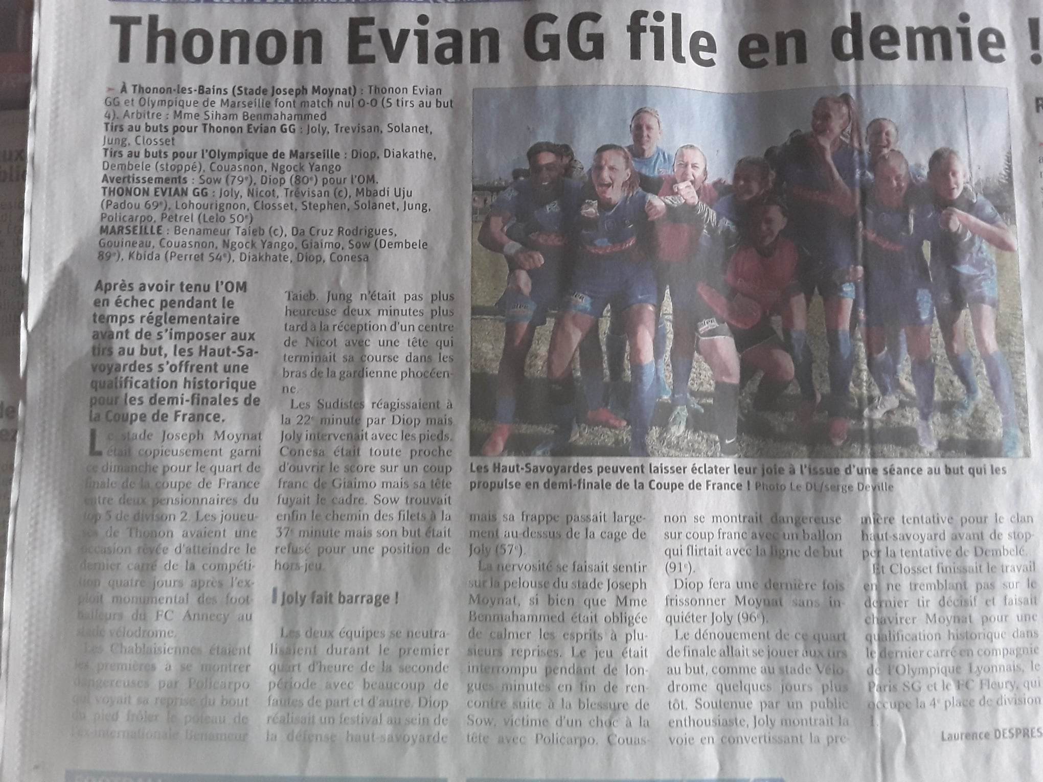 Nos Olympiennes ont été éliminées aux tirs au but en quart de finale de Coupe de France féminine sur la pelouse de Thonon Evian GG FC. Le beau parcours des joueuses de Yacine Guesmia a pris fin dimanche après-midi sur le terrain de Thonon Evian GG FC en quart de finale de Coupe de France féminine. Face à un autre pensionnaire du groupe B de D2 féminine, nos Olympiennes ont su préserver leur but inviolé mais elles n'ont pas réussi à trouver le chemin des filets. Les tirs au but ont départagé les deux formations. Les Haut-Savoyardes ont été plus efficaces dans cet exercice en réussissant toutes leurs tentatives alors que, côté olympien, Coumba Dembélé a vu son tir repoussé par la gardienne adverse. |