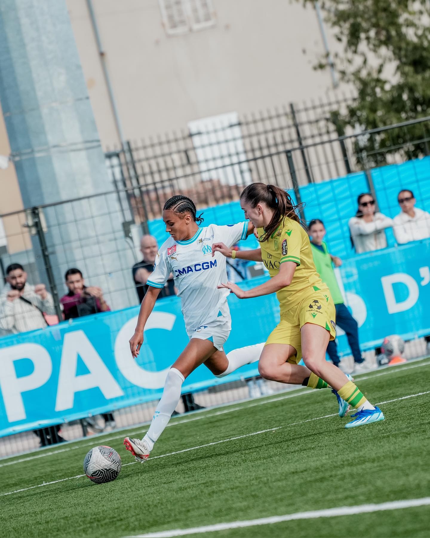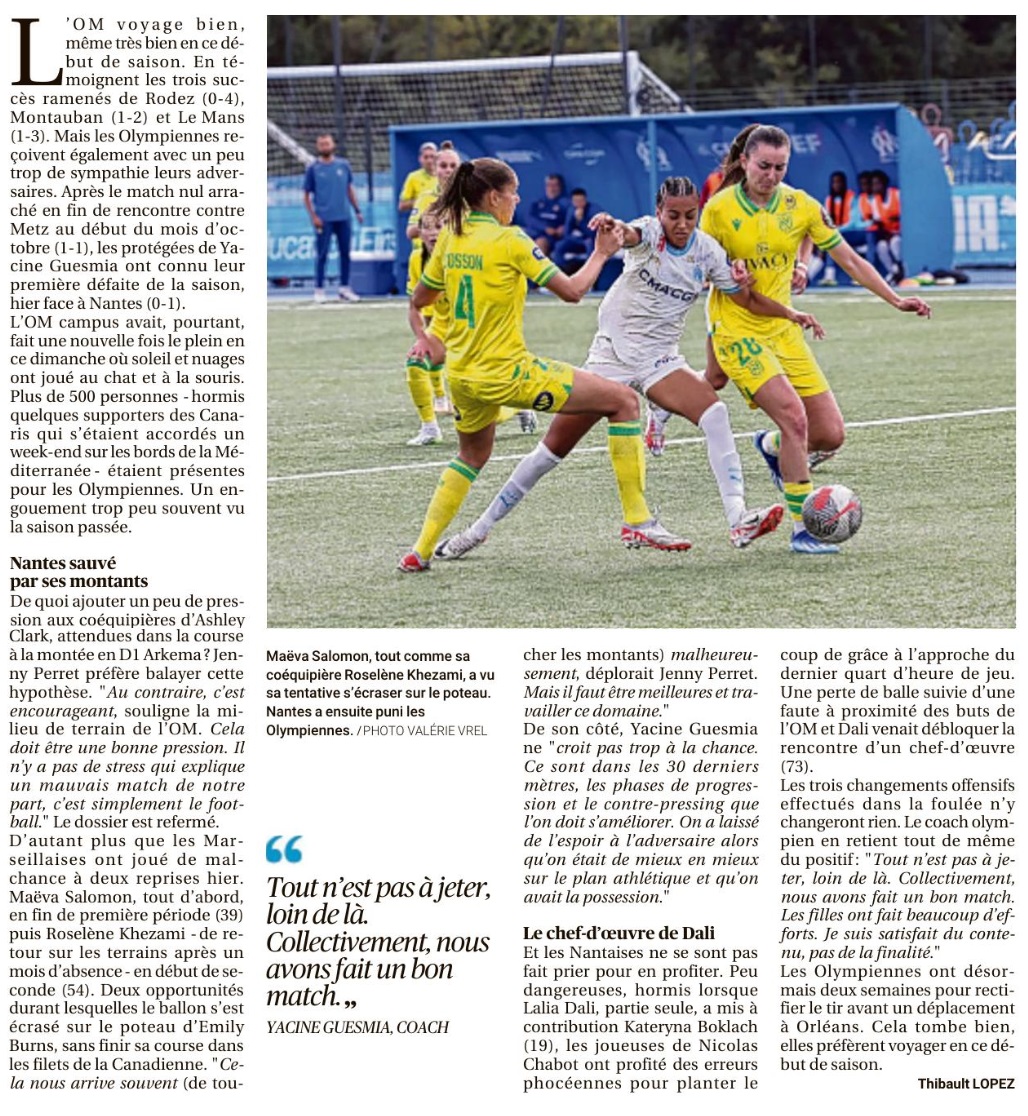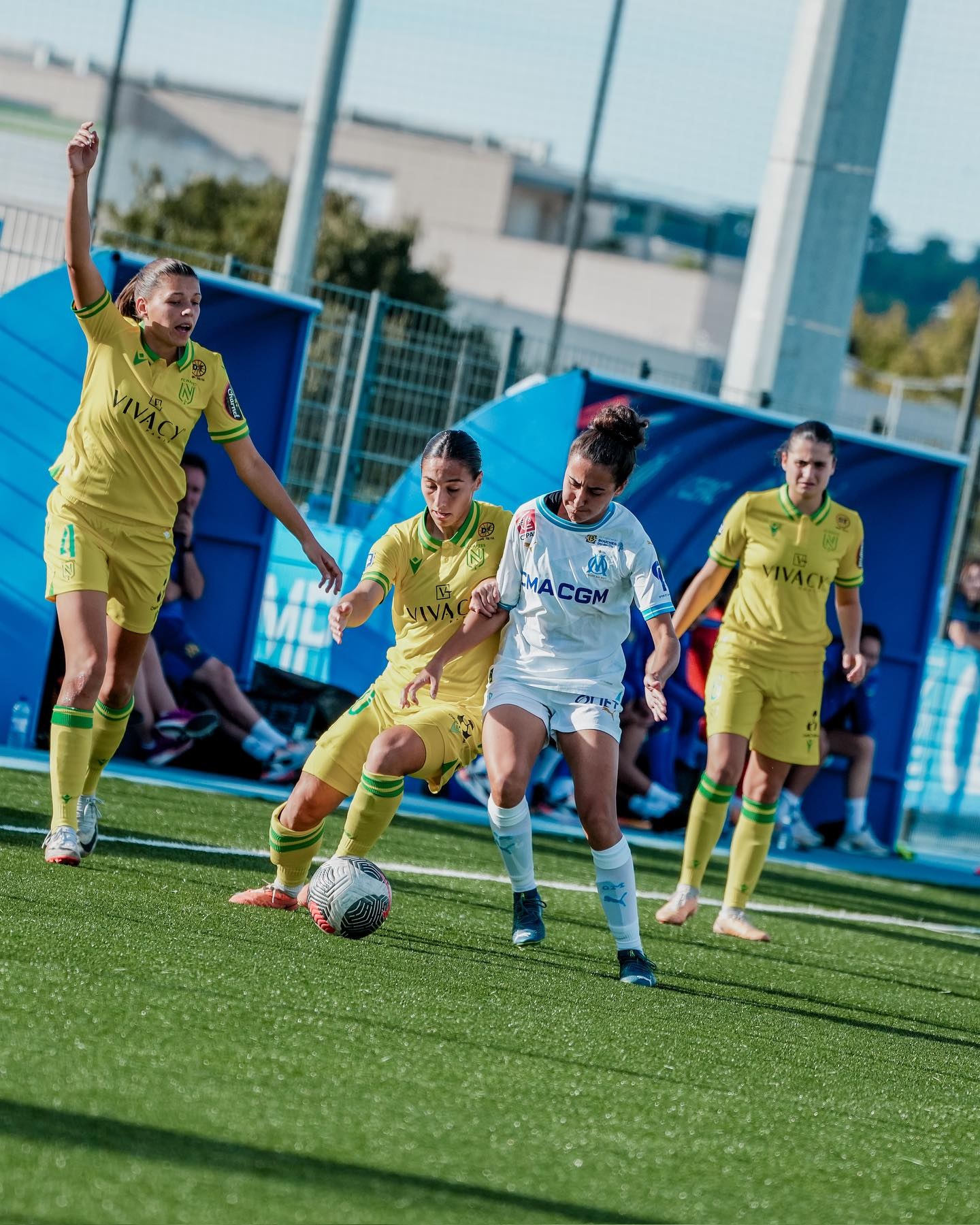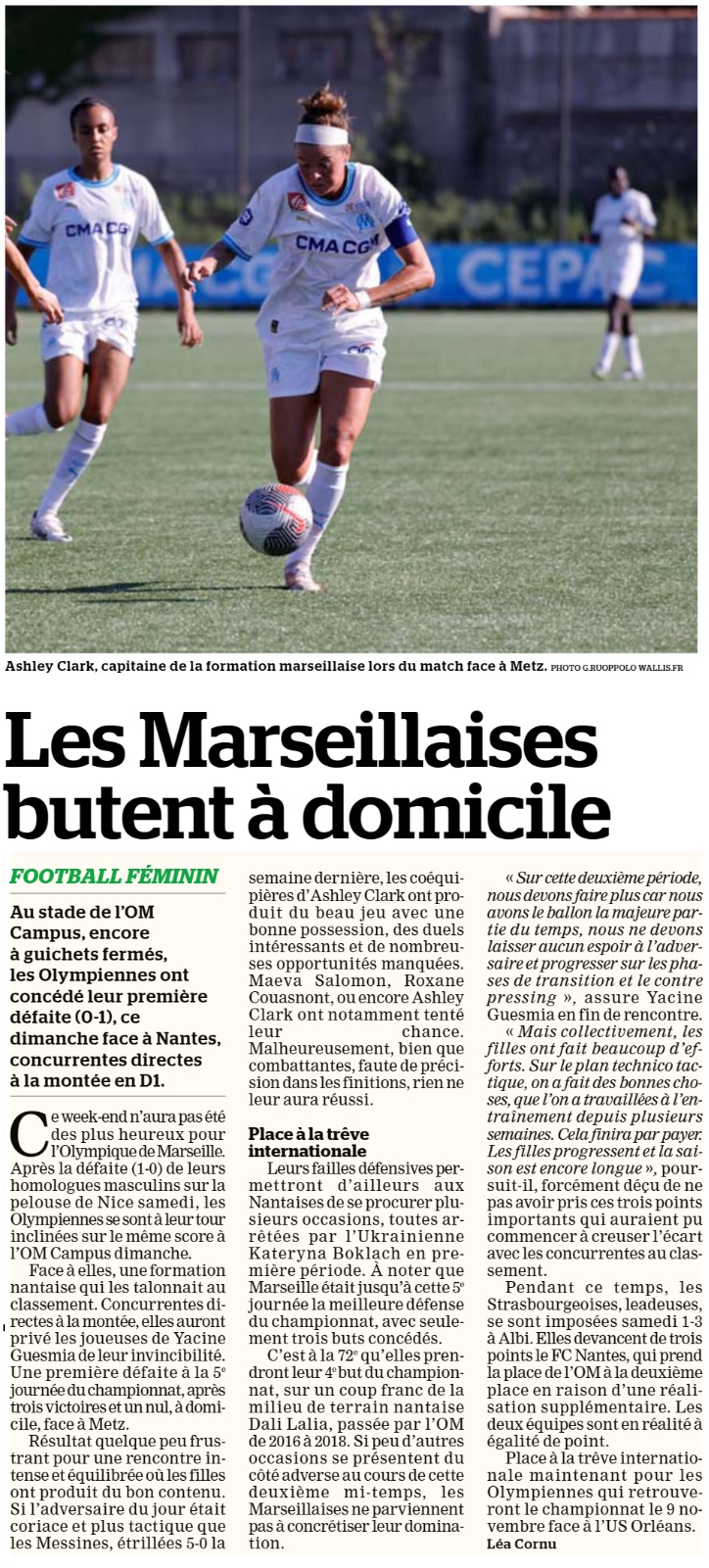 Nos Olympiennes ont été battues par le FC Nantes dimanche à l'OM Campus. Ce match de la cinquième journée de D2 Féminine était l'affiche du week-end entre le deuxième, l'OM et le troisième, le FC Nantes. Dominatrices au niveau de la possession du ballon en première période, les joueuses de Yacine Guesmia n'ont pas trouvé la faille dans la défense des Canaris, malgré une frappe sur le poteau de la gardienne nantaise, Emily Burns. En seconde période, les Nantaises parviennent à inscrire, sur coup franc, l'unique but de la partie et nos Olympiennes ont à nouveau touché les montants adverses. Elles n'ont pas réussi, malgré le soutien du public, à faire trembler les filets. Après cette défaite, la première de la saison, l'OM est troisième au classement à trois longueurs du leader, le RC Strasbourg. Lors de la prochaine journée, le dimanche 5 novembre à 13 heures, nos Olympiennes se rendront sur la pelouse d'Orléans, neuvième au classement. |