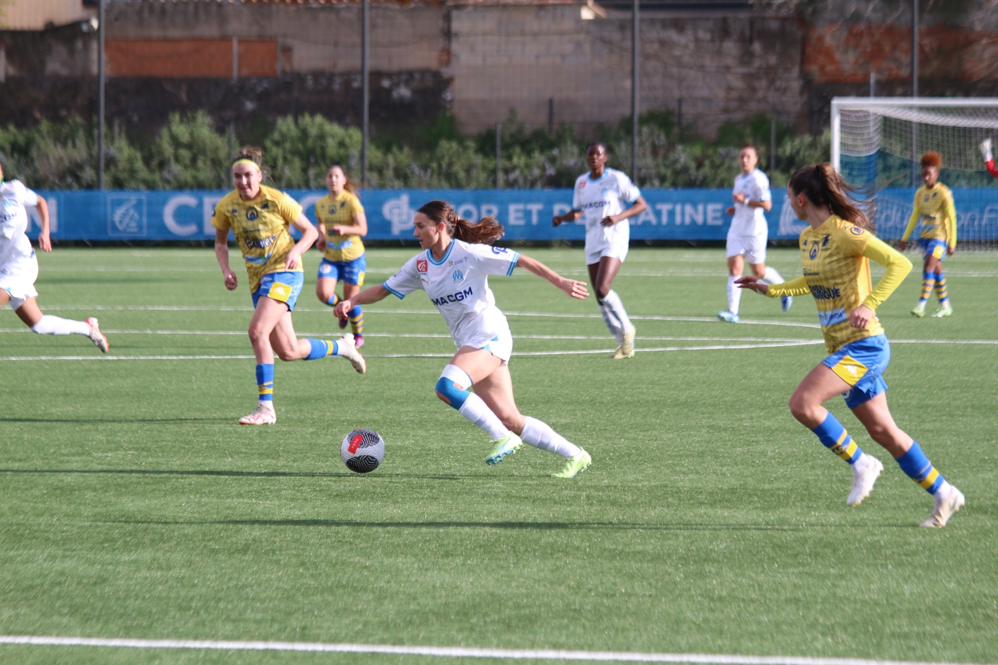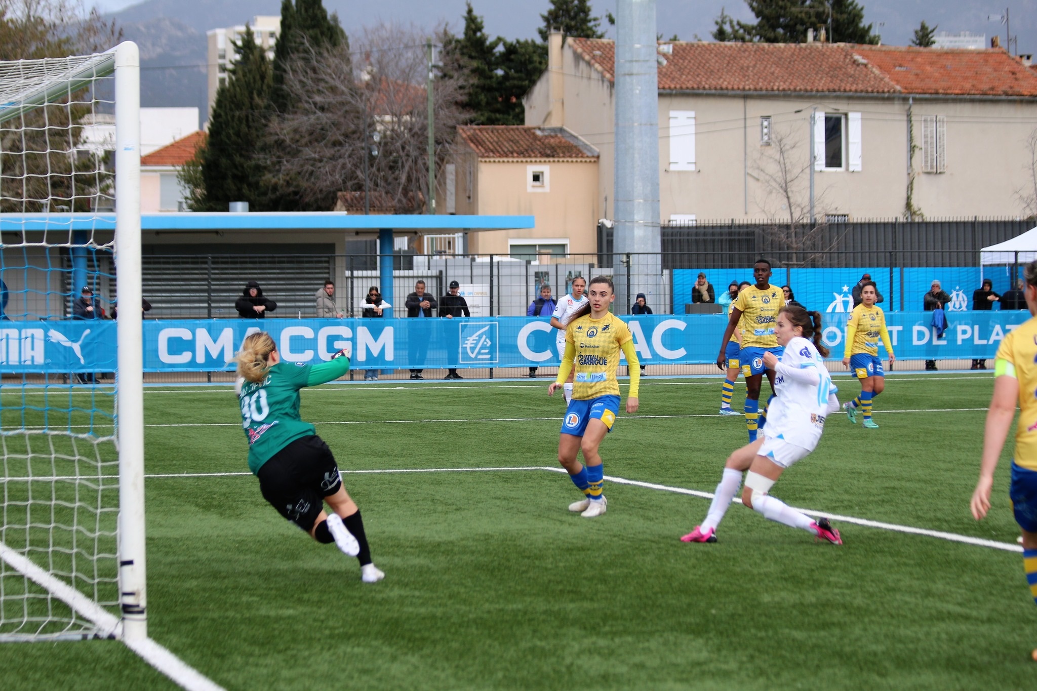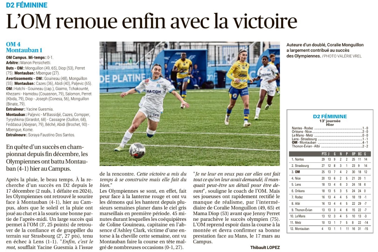 Surprises en première période par l'ouverture du score des Montalbalnaises juste avant la demi-heure de jeu par Seynabou Mbengue, les joueuses de Yacine Guesmia ont réagi en seconde période en étant plus efficaces dans le dernier geste. Au retour des vestiaires, elles ont marqué 4 buts, deux pour Coralie Monguillon, un pour Mama Diop et le dernier pour Jenny Perret. Nos Olympiennes s'imposent donc 4 buts à 1 dans des conditions rendues difficiles par la pluie et le vent face au dernier du championnat. Au classement, l'OM est troisième avec 25 points et profite du match nul de Strasbourg pour revenir à deux longueurs de la deuxième place. Lors de la prochaine journée, le dimanche 12 mars à midi, l'OM accueillera Le Mans à l'OM Campus. |