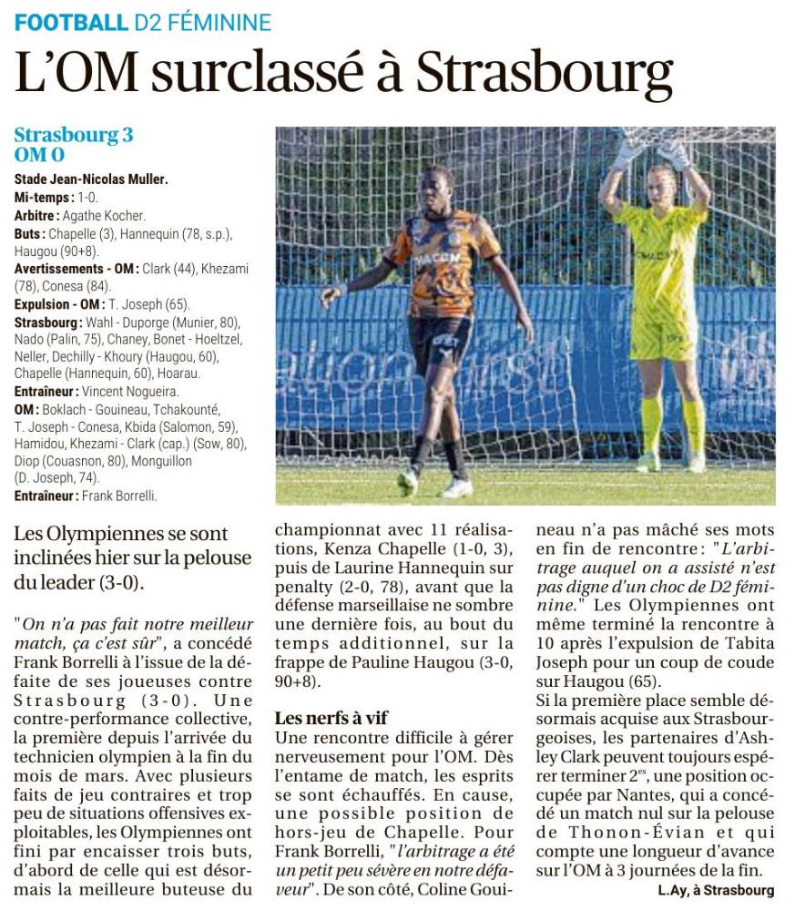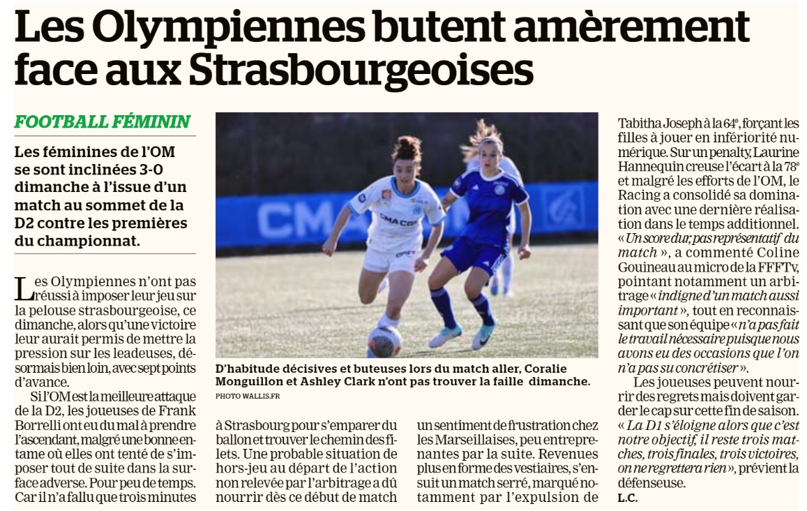 En déplacement sur le terrain de la formation qui occupe la tête du classement de D2 Féminine, notre équipe féminine a connu sa première défaite depuis l'arrivée au poste d'entraîneur de Frank Borrelli. Nos Olympiennes ont encaissé un but dès les premières minutes pas Kenza Chapelle. En seconde période, réduites à dix, elles ont concédé un penalty et un troisième but, sur l'ultime offensive alsacienne. Après cette 19e journée, l'OM est toujours troisième. Lors de la prochaine journée, l'OM accueillera Albi Marssac, le dimanche 12 mai à 15 heures à l'OM Campus. |