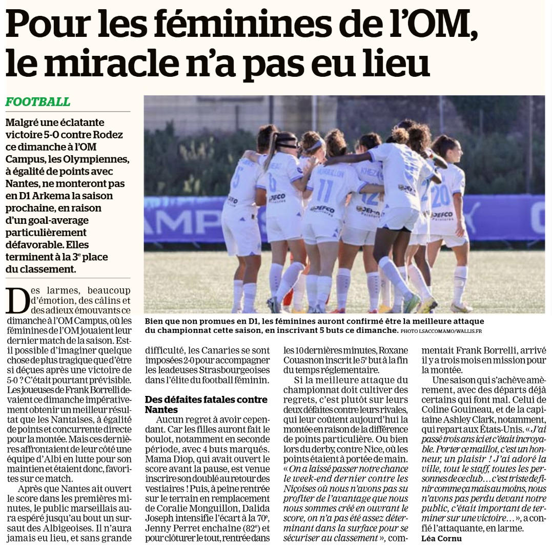 Nos Olympiennes se sont imposées 5 buts à 0 contre Rodez à l'OM Campus mais dans le même temps, Nantes a battu Albi. L'OM termine à la troisième place du classement et n'accède pas à la D1.