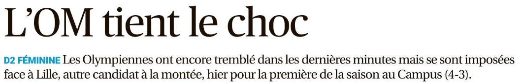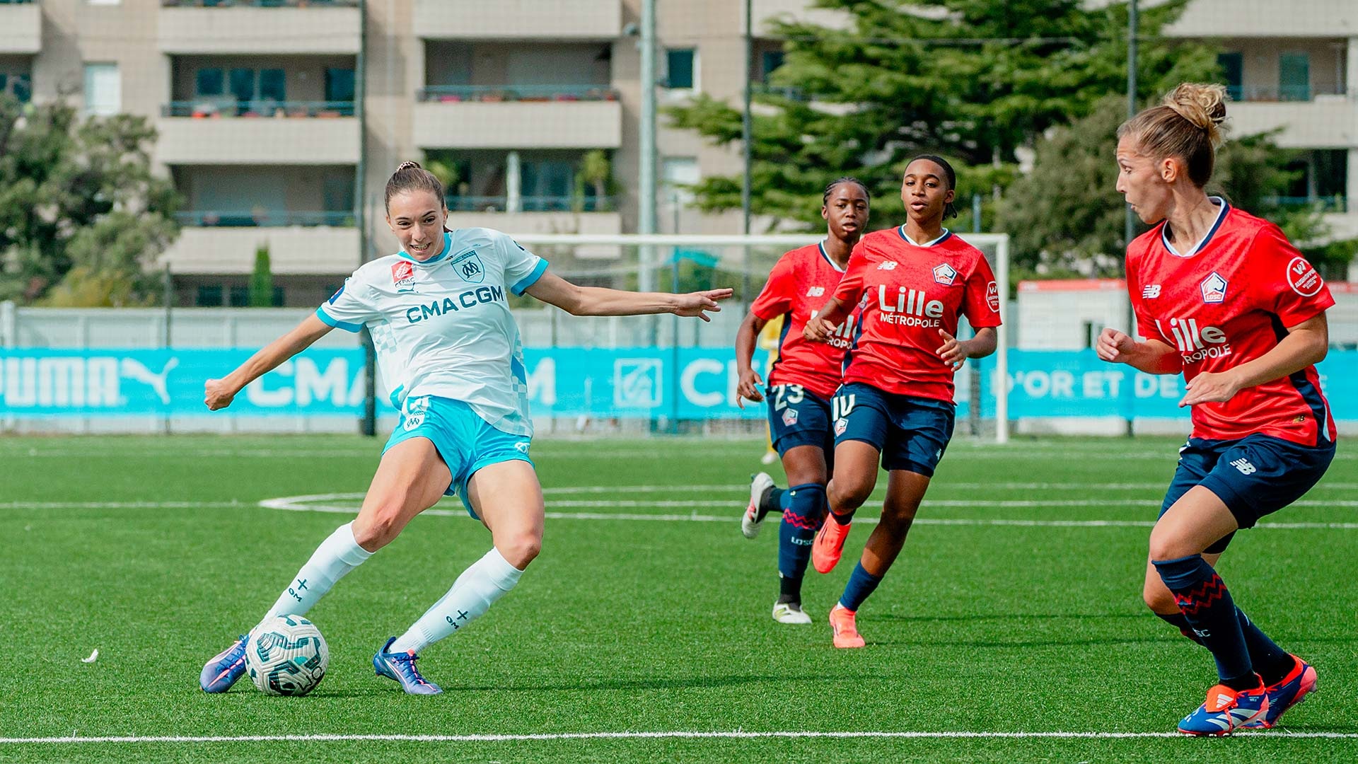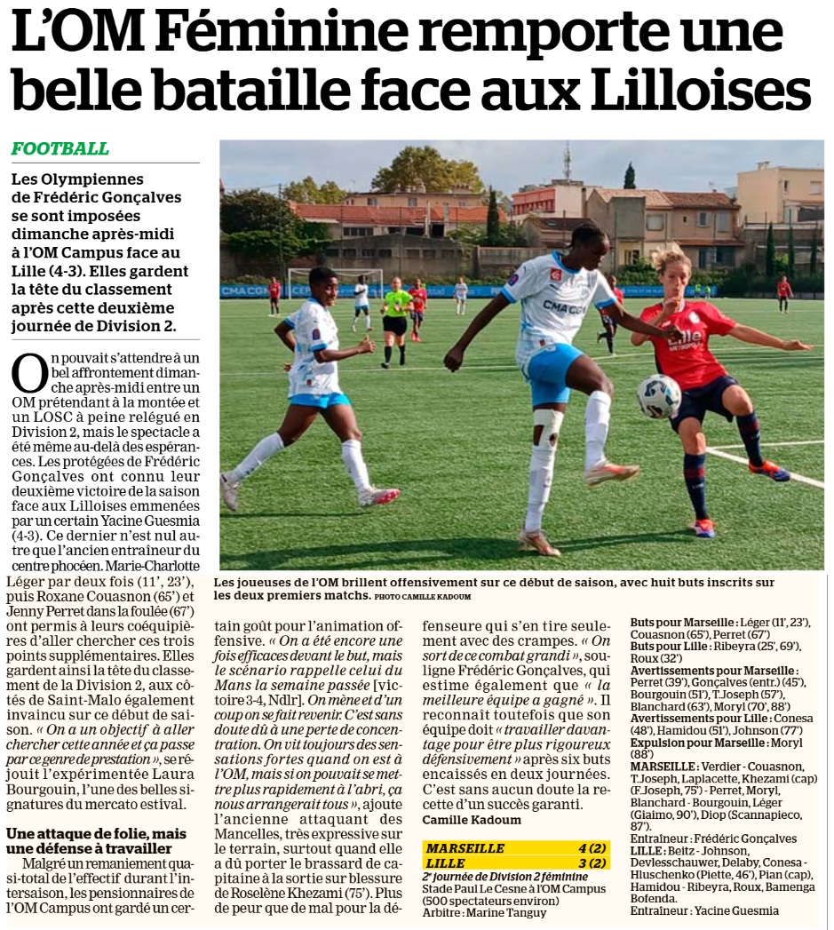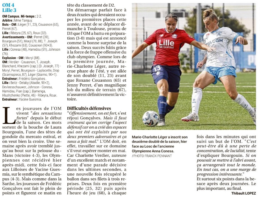 Pour la deuxième journée de Seconde Ligue, notre formation féminine recevait Lille à l'OM Campus. Nos Olympiennes sont parfaitement entrées dans la partie avec un doublé de Marie-Charlotte Léger avant la demi-heure de jeu. Mais les Nordistes ont rapidement réagi en marquant deux fois avant le repos. Après l'heure de jeu, les joueuses de Frédéric Gonçalves ont remis les pendules à l'heure. En deux minutes, elles ont repris un avantage de deux buts avec des réalisations signées Roxane Couasnon et Jenny Perret. Les Lilloises ont très vite réduit l'écart et ont poussé en fin de rencontre pour revenir au score. Mais, malgré l'expulsion de Maudeline Moryl, nos joueuses ont tenu bon et s'imposent donc pour ce premier rendez-vous de la saison à domicile. Après ce second succès, elles pointent en tête du classement avec 6 points. Lors de la prochaine journée, le dimanche 29 septembre à 15 heures, elles se déplaceront sur la pelouse du Toulouse FC |