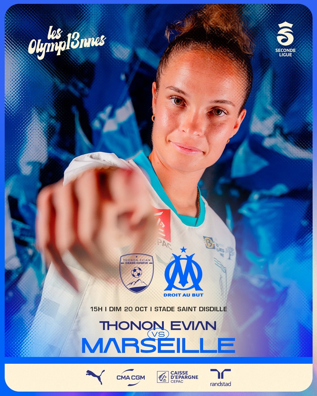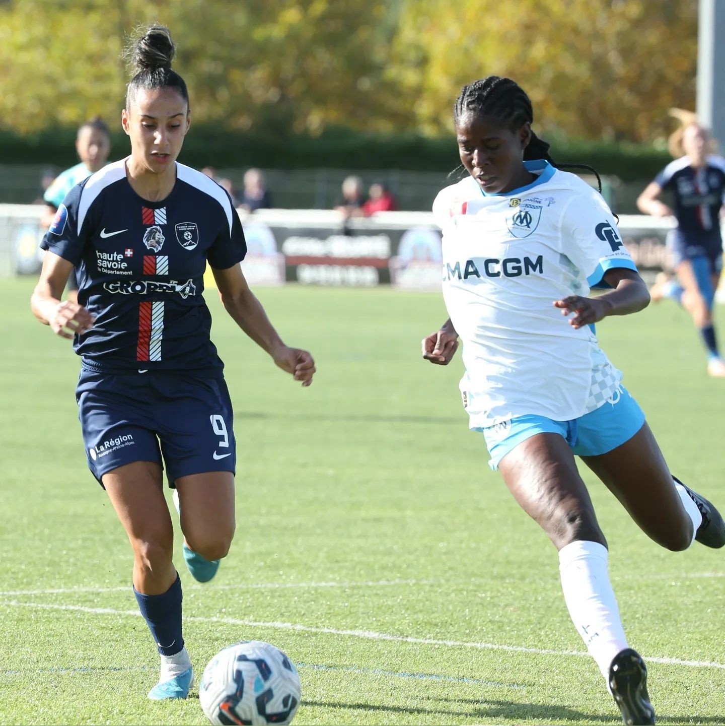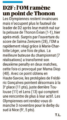 Après leur victoire à domicile contre le FC Metz, nos Olympiennes avaient à coeur d'enchaîner avec un nouveau succès. Mais, en déplacement en Haute Savoie, elles sont tombées face à une solide équipe de Thonon Evian Grand Genève. C'est d'ailleurs l'équipe locale qui a ouvert le score avant la demi-heure de jeu par Salma Zemzem. Les joueuses de Frédéric Gonçalves ont égalisé grâce à Marie-Charlotte Léger avant la pause. Aucun but n'a été inscrit en seconde période et les deux formations partagent donc les points. Au classement, l'OM est troisième avec 11 points à deux longueurs du leader, le RC Lens. Lors de la prochaine journée, le dimanche 3 novembre à 15 heures, l'OM se déplacera sur la pelouse de l'OGC Nice. |