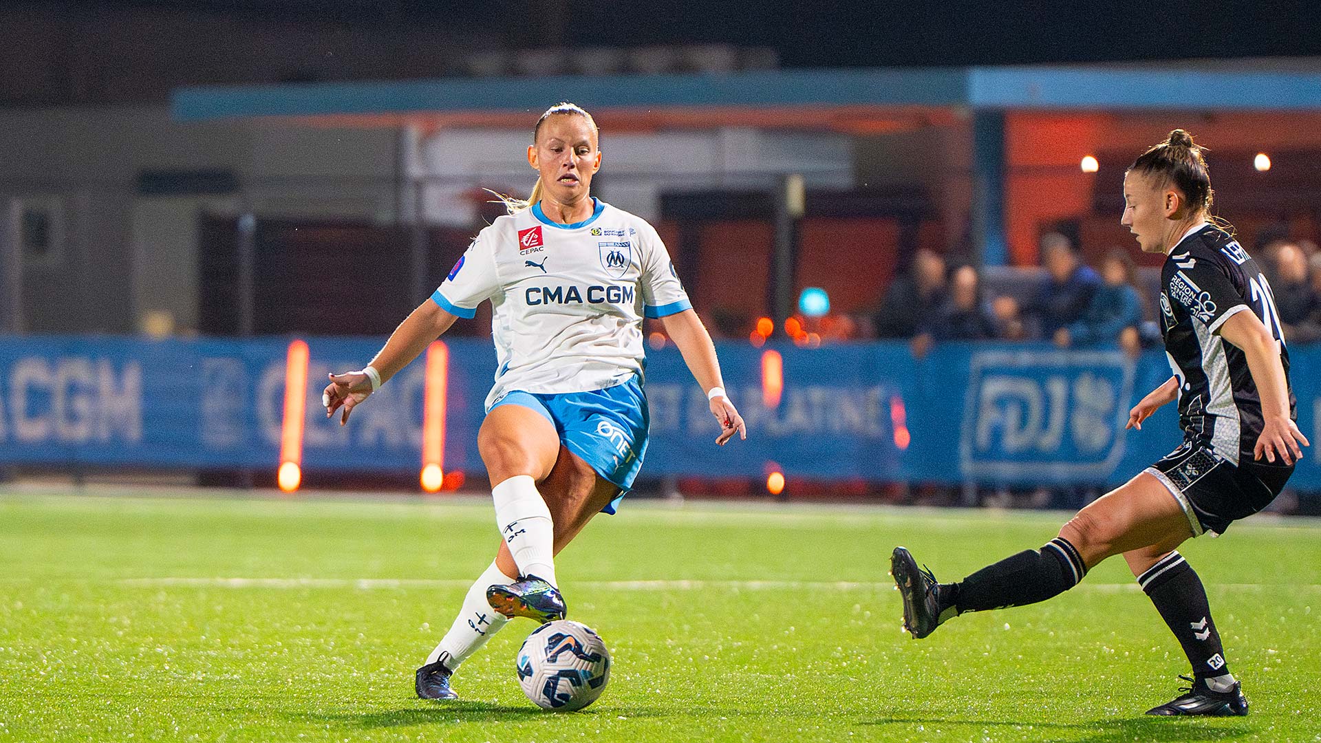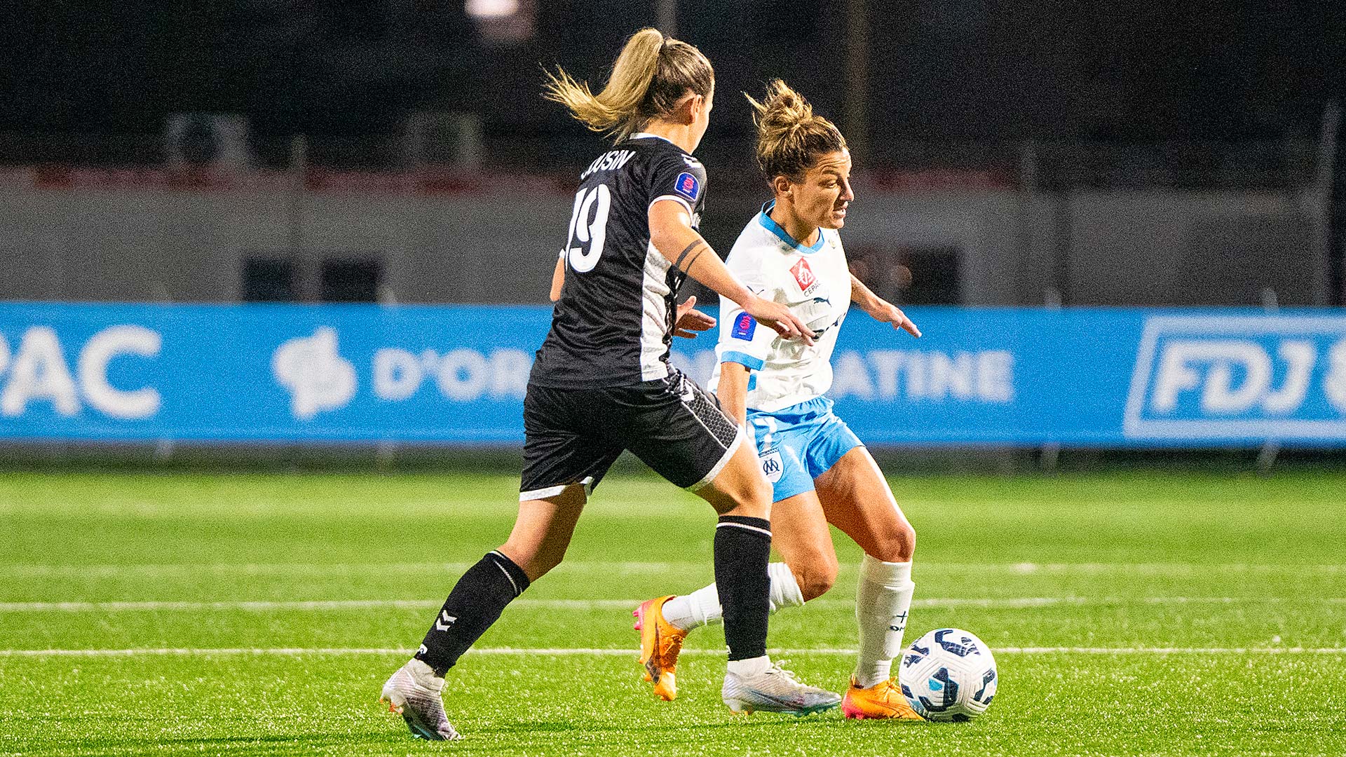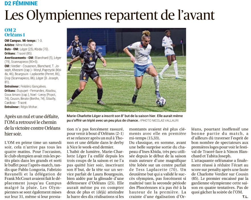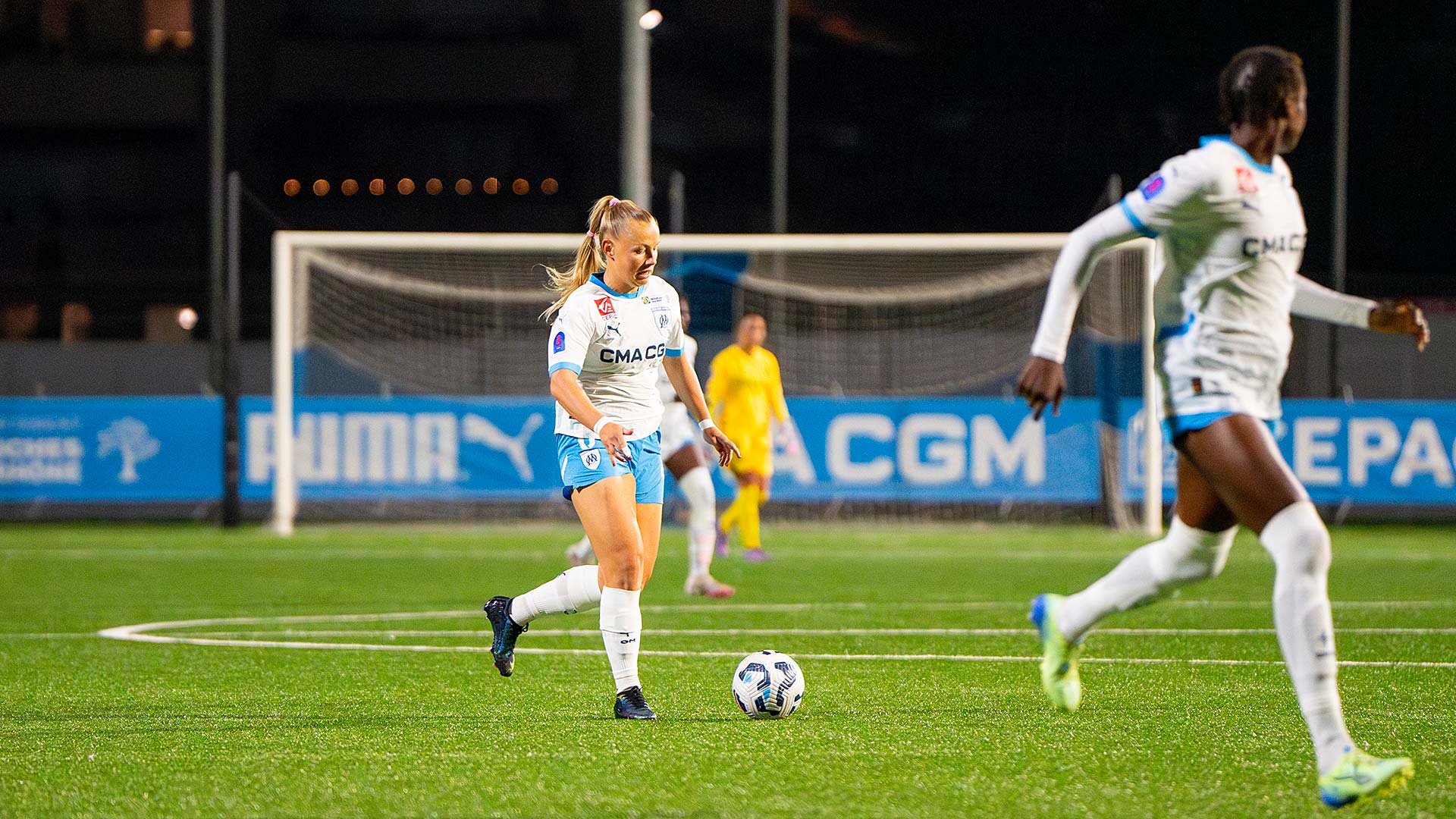 Notre équipe féminine a battu l'US Orléans Loiret à l'OM Campus sur le score de 2 à 1. Nos Olympiennes recevaient l'US Orléans Loiret à l'OM Campus à 20 heures, le samedi 9 novembre. Les joueuses de Frédéric Gonçalves ont bien entamé la rencontre. Dominatrices, elles ont eu plusieurs occasions et ont concrétisé l'une d'elles à la 25e minute par Marie-Charlotte Léger. Notre attaquante a également touché la barre transversale adverse à deux reprises. En seconde période, elles ont gardé un rythme élevé. Entrée peu de temps avant, Inès Kbida a doublé la mise. Orléans, dernier au classement, a réduit l'écart en fin de partie. Dans la course aux premières places, l'OM a pris trois points importants. Au classement, l'OM est quatrième avec 14 points à deux longueurs du leader lensois. Lors de la prochaine journée, le dimanche 17 novembre à 14h30, l'OM accueillera Rodez AF à l'OM Campus. |