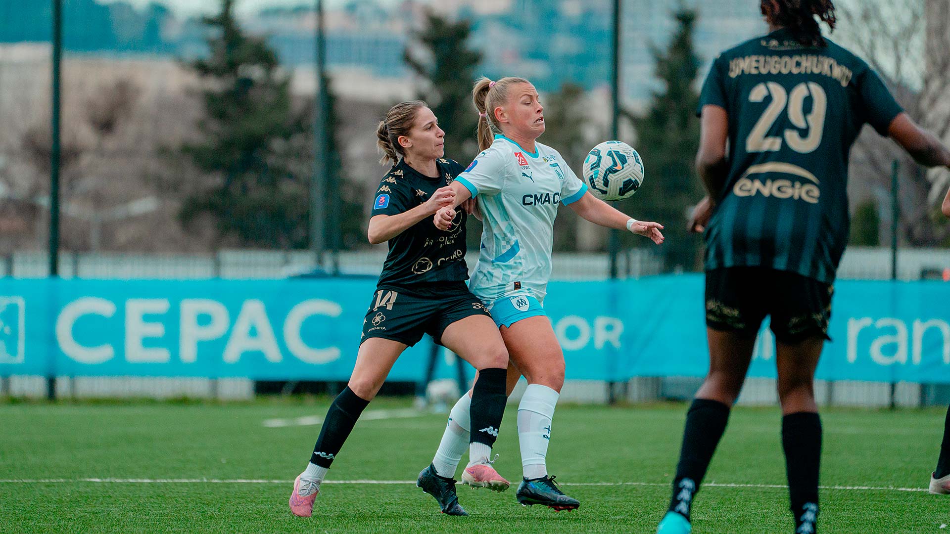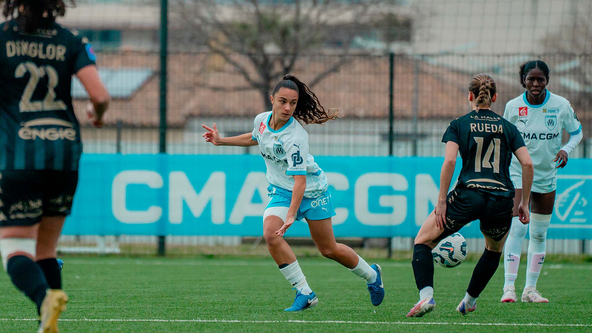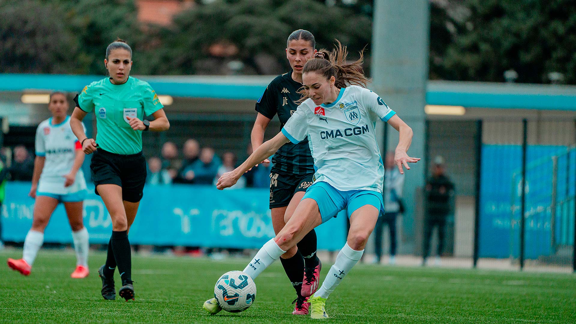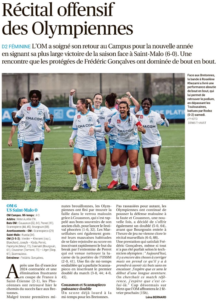 Notre équipe professionnelle féminine a gagné, 6 buts à 0, à domicile contre l'US Saint-Malo. Frédéric Gonçalves, entraîneur de l'équipe féminine, avait souligné durant la semaine l'importance de la rencontre du dimanche 19 janvier face à l'US Saint-Malo. Il a été entendu par ses joueuses qui n'ont pas fait de détail face aux Bretonnes à l'OM Campus. À la pause, le score était déjà de 4-0 en faveur de nos Olympiennes. Roxane Couasnon avait ouvert le bal des buts. Jenny Perret l'a imitée avant que Dona Scannapieco ne signe un doublé en deux minutes juste avant le repos. En seconde période, Roxane Couasnon et Laura Bourgouin ont aggravé la marque. Avec ce succès, l'OM est troisième au classement de Seconde Ligue avec 18 points à trois longueurs du deuxième Le Mans. Lors de la prochaine journée, le dimanche 2 février à 15 heures, nos Olympiennes joueront sur la pelouse du FC Metz. |