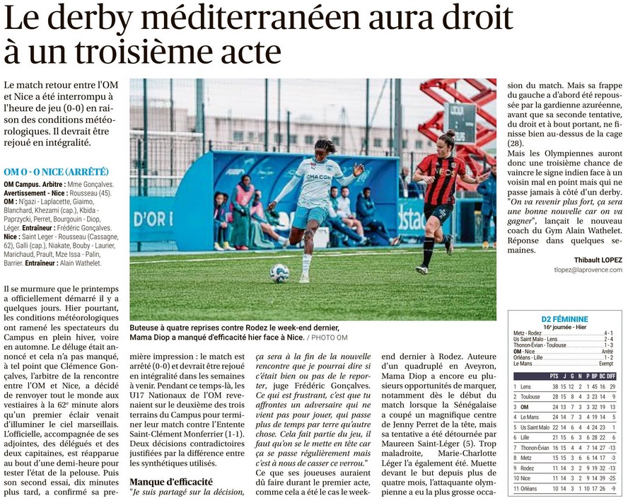 La rencontre de Seconde Ligue entre l'OM et l'OGC Nice a été interrompue. Dimanche après-midi, le match de la 16e journée de Seconde Ligue à l'OM Campus entre l'Olympique de Marseille et l'OGC Nice a été arrêté en raison des conditions météorologiques après un peu plus d'une heure de jeu. Le score était de 0 à 0. La rencontre sera reportée à une date ultérieure. |