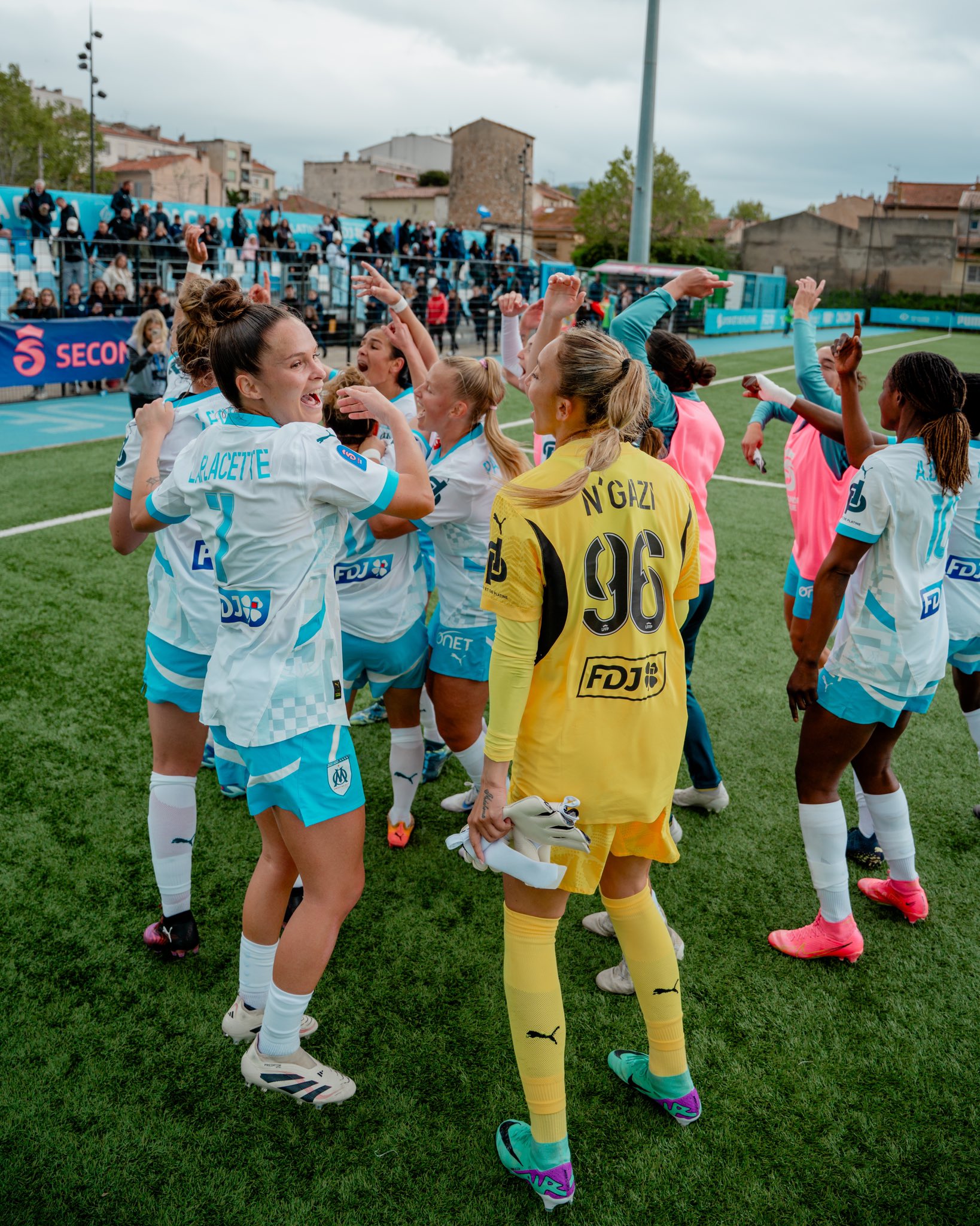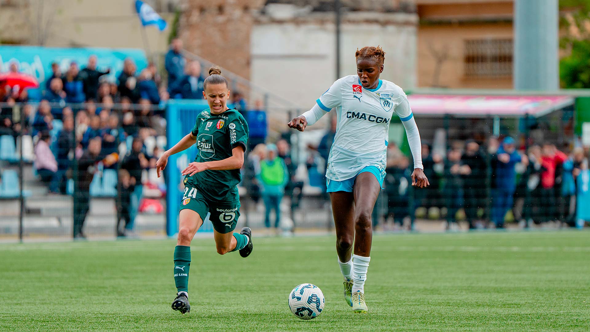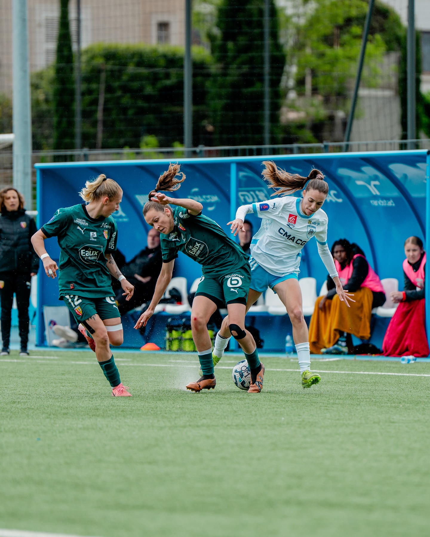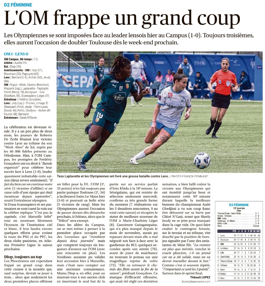 Nos Olympiennes ont battu le RC Lens, dimanche à l'OM Campus, grâce à un but de Mama Diop. La dernière défaite du RC Lens en Seconde Ligue datait du 22 septembre. Depuis le club nordiste n'avait enchaîné que des matchs nuls et des victoires qui lui avait permis d'être largement en tête du classement. Cette série a pris fin, le dimanche 13 avril à l'OM Campus. Dès les premières minutes de la rencontre, nos Olympiennes ont mis la pression sur les Lensoises. Cela a payé avec un but de notre attaquante sénégalaise, Mama Diop, dès la dixième minute. La formation de Frédéric Gonçalves a su conserver cet avantage jusqu'au coup de sifflet final. Au classement, l'OM est troisième avec 33 points à une longueur du Toulouse FC. Lors de la prochaine journée, le dimanche 20 avril à 13 heures, l'OM se déplacera à Orléans, huitième du championnat. |