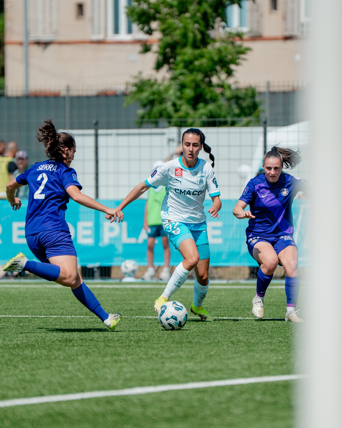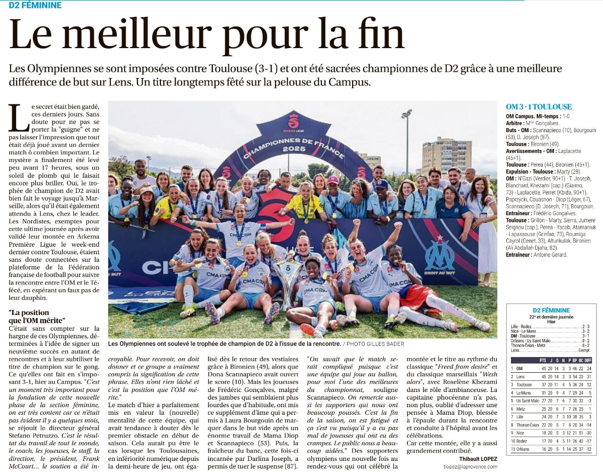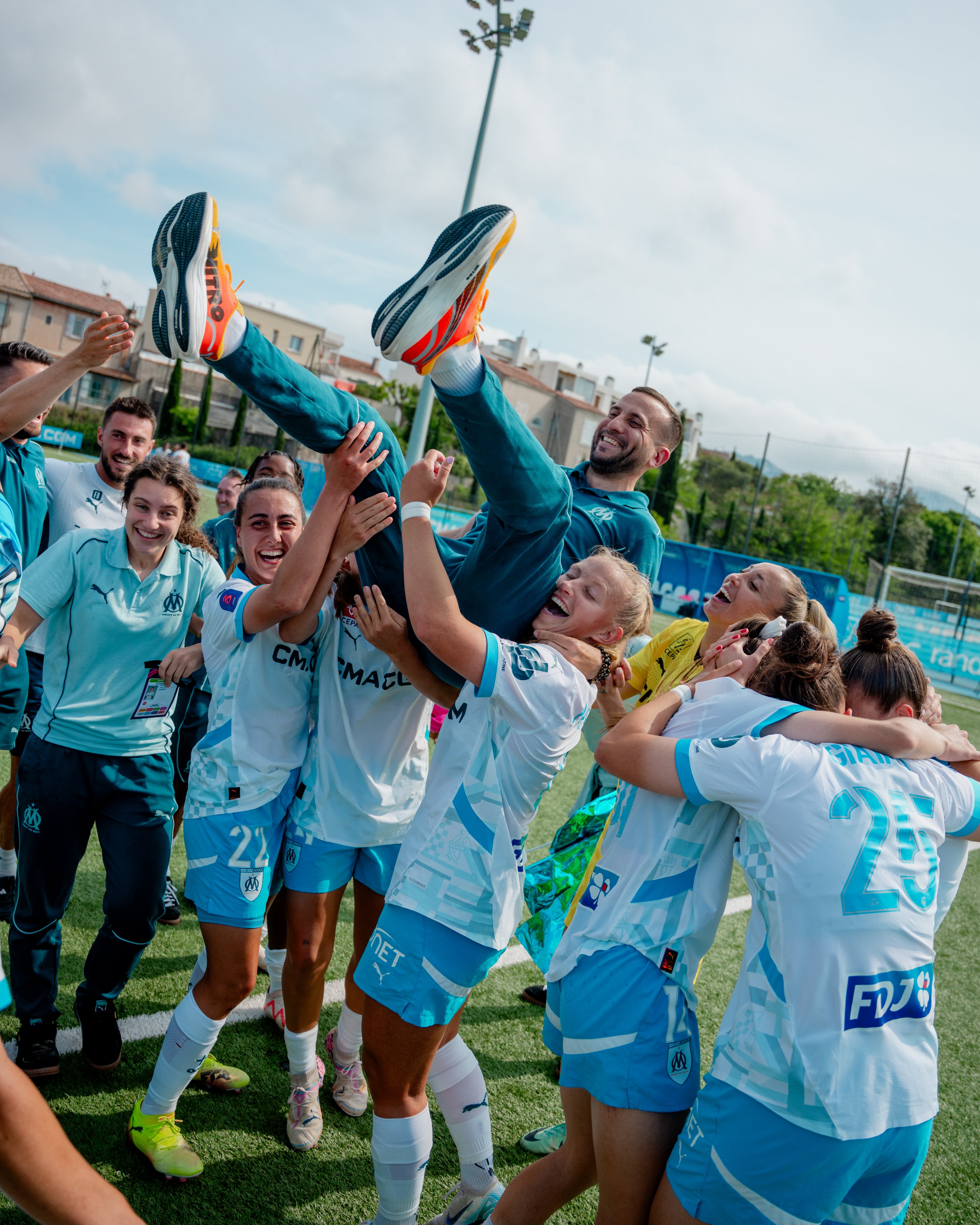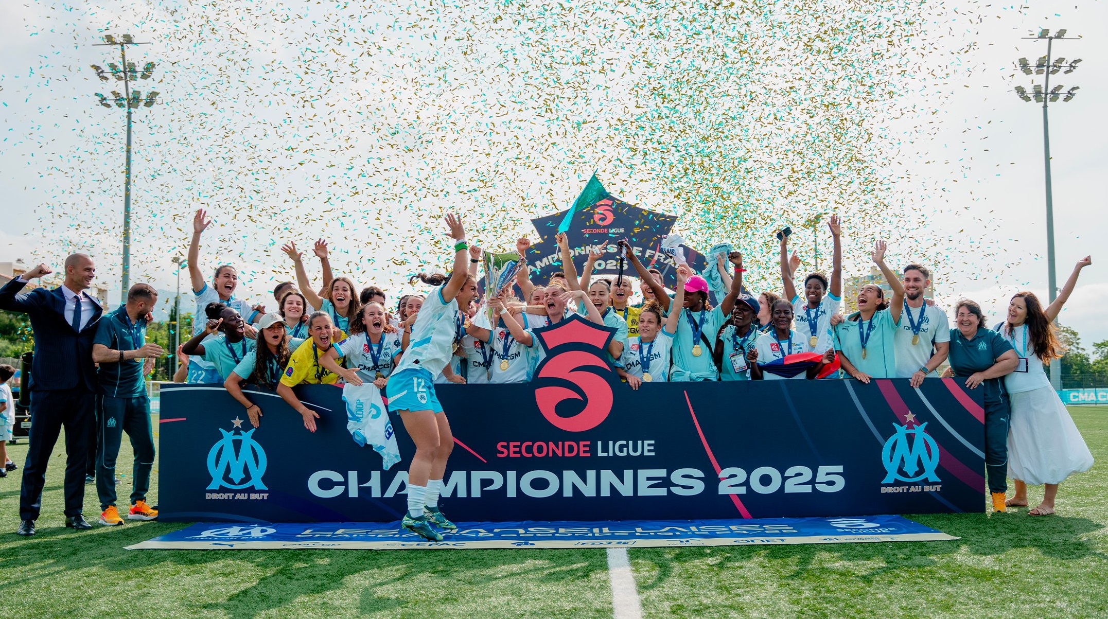 Nos Marseillaises sont championnes de France de Seconde Ligue 2024-2025. Probablement inspirées par leur tour d'honneur effectué la veille juste avant le coup du match entre l'OM et Rennes à l'Orange Vélodrome devant près de 60.000 spectateurs, nos Marseillaises sont allées chercher "la cerise sur le gâteau", comme l'avait dit leur entraîneur, Frédéric Gonçalves. Le gâteau, c'est bien évidemment la montée en Arkema Première Ligue, assurée depuis le succès, le week-end dernier, sur la pelouse de Saint-Malo. La cerise, c'est le titre de champion de France de Seconde Ligue que son équipe a glané au terme d'une seconde partie de saison éblouissante conclue ce dimanche après-midi à Marseille par un neuvième succès consécutif face à Toulouse FC, troisième. Cette victoire permet à l'OM de s'adjuger le titre de champion de D2 féminine, le second de l'histoire du Club après celui acquis en 2016. Car avant le match, le calcul était des plus simples : seul un succès permettrait à l'OM de revenir, en termes de points, à hauteur de Lens, exempt. Mais la différence de buts particulière, favorable à l'OM, offrirait la première position finale. Dans la lignée de leurs dernières prestations, nos Marseillaises ont tout de suite voulu imposer leur rythme à la rencontre. Dès la dixième minute, sur un bon débordement et un centre de Tess Laplacette, Dona Scannapieco ouvrait la marque. Plein comme un oeuf, l'OM Campus se levait pour célébrer cette réalisation qui rapprochait l'équipe du titre. L'expulsion de la Toulousaine Chloé Marty, juste avant la demi-heure de jeu, pouvait laisser penser que les choses allaient être encore plus simples pour les joueuses de Frédéric Gonçalves. Il n'en a rien été. De retour des vestiaires, en infériorité numérique, le TFC a égalisé. A 1 à 1, c'est le RC Lens qui était sacré. L'OM s'est rapidement remobilisé et a accentué la cadence du match. Le second but marseillais n'a pas tardé à intervenir par l'intermédiaire de Laura Bourgouin. Puis le troisième, en fin de rencontre, était l'oeuvre de Darlina Joseph entrée peu de temps. Un but marqué au même moment que l'évacuation par les pompiers de Mama Diop, touchée à l'épaule. Au coup de sifflet final, la section féminine de l'Olympique de Marseille a pu célébrer le titre de champion de France de Seconde Ligue. Tout le monde s'est pris dans les bras pendant que se mettait en place la remise des médailles et de la coupe. Présent à l'OM Campus, Pablo Longoria savourait ce moment, au lendemain de la deuxième place de L1 acquise par l'équipe masculine. Une fois les médailles autour du cou des joueuses et membres du staff, la remise du trophée s'est déroulée face à la tribune de l'OM Campus, toujours aussi pleine. Les confettis ont volé dans le ciel marseillais balayé par le vent lorsque la coupe a été brandie.