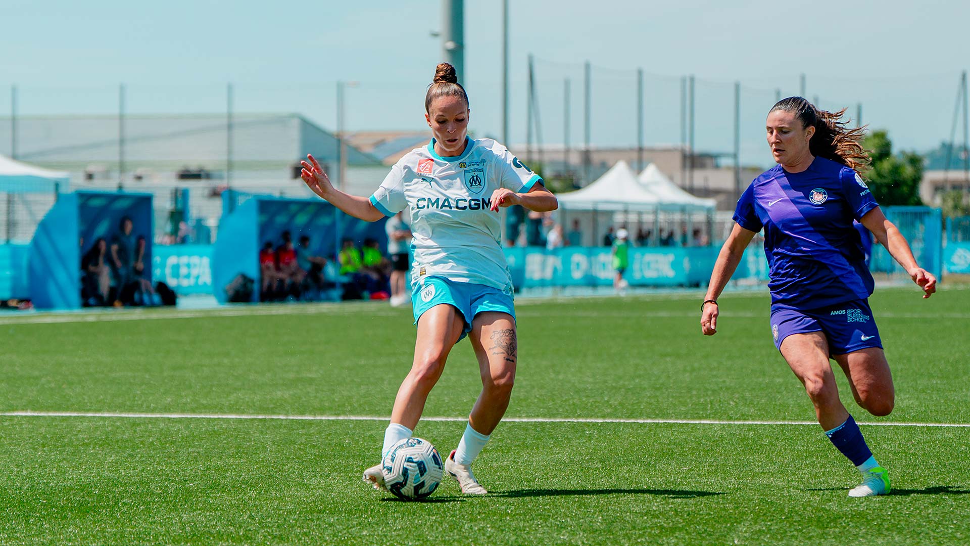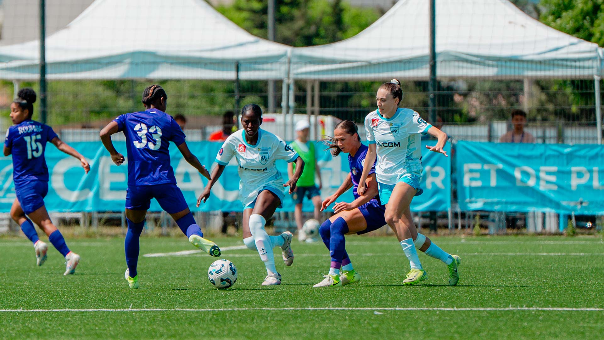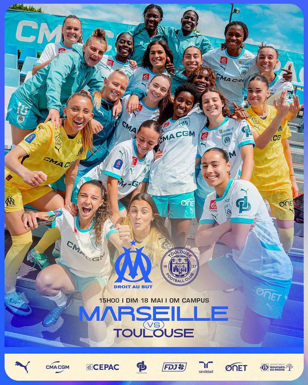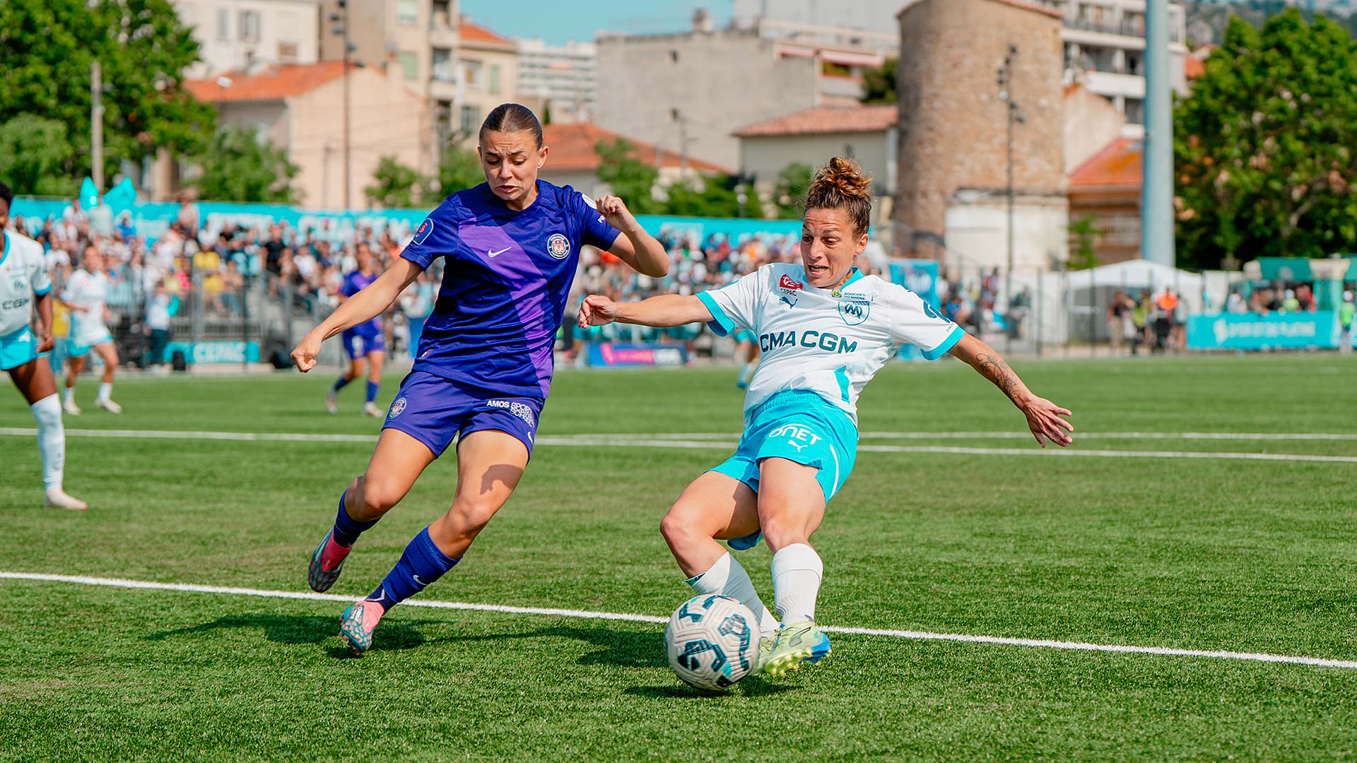 Nos Marseillaises sont championnes de France de Seconde Ligue 2024-2025. Probablement inspirées par leur tour d'honneur effectué la veille juste avant le coup du match entre l'OM et Rennes à l'Orange Vélodrome devant près de 60.000 spectateurs, nos Marseillaises sont allées chercher "la cerise sur le gâteau", comme l'avait dit leur entraîneur, Frédéric Gonçalves. Le gâteau, c'est bien évidemment la montée en Arkema Première Ligue, assurée depuis le succès, le week-end dernier, sur la pelouse de Saint-Malo. La cerise, c'est le titre de champion de France de Seconde Ligue que son équipe a glané au terme d'une seconde partie de saison éblouissante conclue ce dimanche après-midi à Marseille par un neuvième succès consécutif face à Toulouse FC, troisième. Cette victoire permet à l'OM de s'adjuger le titre de champion de D2 féminine, le second de l'histoire du Club après celui acquis en 2016. Car avant le match, le calcul était des plus simples : seul un succès permettrait à l'OM de revenir, en termes de points, à hauteur de Lens, exempt. Mais la différence de buts particulière, favorable à l'OM, offrirait la première position finale. Dans la lignée de leurs dernières prestations, nos Marseillaises ont tout de suite voulu imposer leur rythme à la rencontre. Dès la dixième minute, sur un bon débordement et un centre de Tess Laplacette, Dona Scannapieco ouvrait la marque. Plein comme un oeuf, l'OM Campus se levait pour célébrer cette réalisation qui rapprochait l'équipe du titre. L'expulsion de la Toulousaine Chloé Marty, juste avant la demi-heure de jeu, pouvait laisser penser que les choses allaient être encore plus simples pour les joueuses de Frédéric Gonçalves. Il n'en a rien été. De retour des vestiaires, en infériorité numérique, le TFC a égalisé. A 1 à 1, c'est le RC Lens qui était sacré. L'OM s'est rapidement remobilisé et a accentué la cadence du match. Le second but marseillais n'a pas tardé à intervenir par l'intermédiaire de Laura Bourgouin. Puis le troisième, en fin de rencontre, était l'oeuvre de Darlina Joseph entrée peu de temps. Un but marqué au même moment que l'évacuation par les pompiers de Mama Diop, touchée à l'épaule. Au coup de sifflet final, la section féminine de l'Olympique de Marseille a pu célébrer le titre de champion de France de Seconde Ligue. Tout le monde s'est pris dans les bras pendant que se mettait en place la remise des médailles et de la coupe. Présent à l'OM Campus, Pablo Longoria savourait ce moment, au lendemain de la deuxième place de L1 acquise par l'équipe masculine. Une fois les médailles autour du cou des joueuses et membres du staff, la remise du trophée s'est déroulée face à la tribune de l'OM Campus, toujours aussi pleine. Les confettis ont volé dans le ciel marseillais balayé par le vent lorsque la coupe a été brandie.