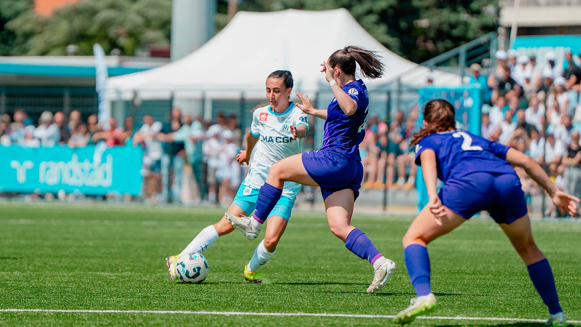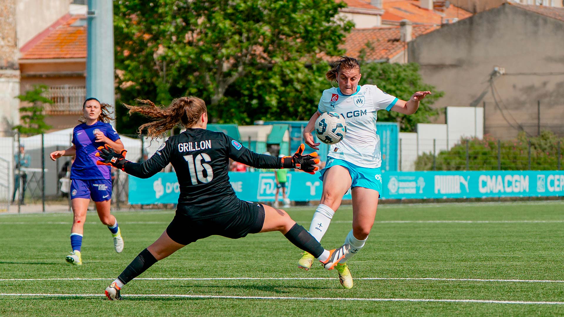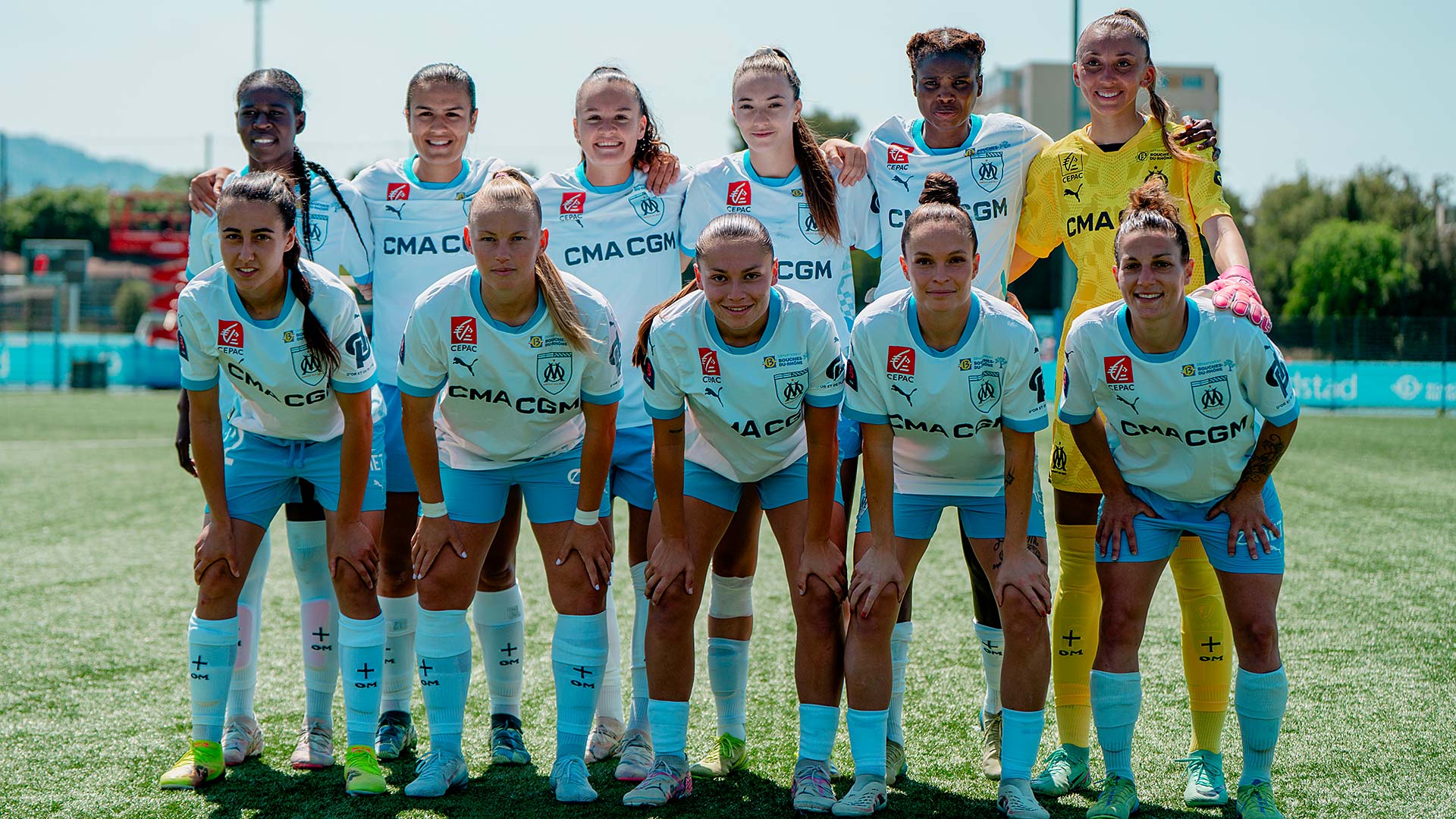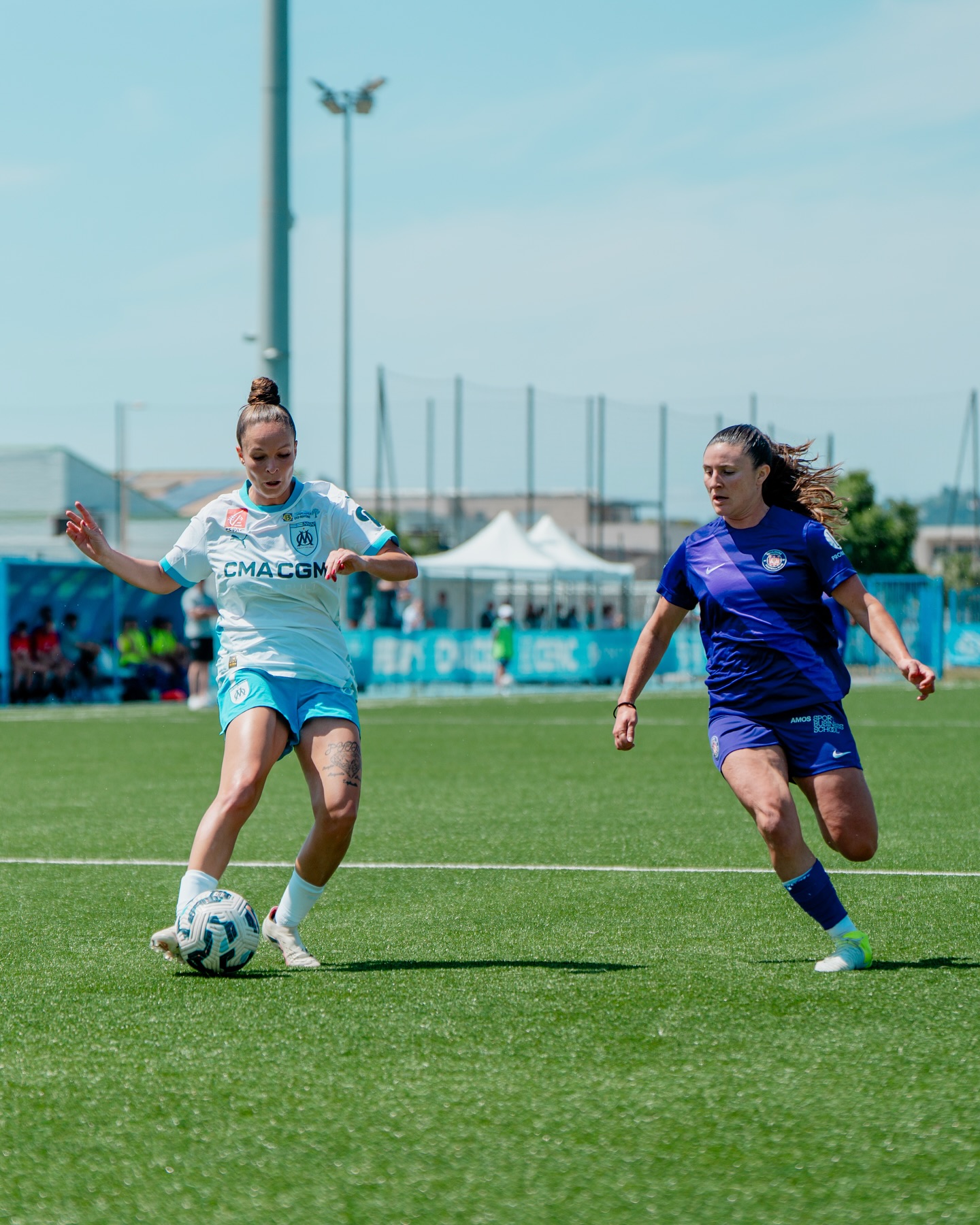 Nos Marseillaises sont championnes de France de Seconde Ligue 2024-2025. Probablement inspirées par leur tour d'honneur effectué la veille juste avant le coup du match entre l'OM et Rennes à l'Orange Vélodrome devant près de 60.000 spectateurs, nos Marseillaises sont allées chercher "la cerise sur le gâteau", comme l'avait dit leur entraîneur, Frédéric Gonçalves. Le gâteau, c'est bien évidemment la montée en Arkema Première Ligue, assurée depuis le succès, le week-end dernier, sur la pelouse de Saint-Malo. La cerise, c'est le titre de champion de France de Seconde Ligue que son équipe a glané au terme d'une seconde partie de saison éblouissante conclue ce dimanche après-midi à Marseille par un neuvième succès consécutif face à Toulouse FC, troisième. Cette victoire permet à l'OM de s'adjuger le titre de champion de D2 féminine, le second de l'histoire du Club après celui acquis en 2016. Car avant le match, le calcul était des plus simples : seul un succès permettrait à l'OM de revenir, en termes de points, à hauteur de Lens, exempt. Mais la différence de buts particulière, favorable à l'OM, offrirait la première position finale. Dans la lignée de leurs dernières prestations, nos Marseillaises ont tout de suite voulu imposer leur rythme à la rencontre. Dès la dixième minute, sur un bon débordement et un centre de Tess Laplacette, Dona Scannapieco ouvrait la marque. Plein comme un oeuf, l'OM Campus se levait pour célébrer cette réalisation qui rapprochait l'équipe du titre. L'expulsion de la Toulousaine Chloé Marty, juste avant la demi-heure de jeu, pouvait laisser penser que les choses allaient être encore plus simples pour les joueuses de Frédéric Gonçalves. Il n'en a rien été. De retour des vestiaires, en infériorité numérique, le TFC a égalisé. A 1 à 1, c'est le RC Lens qui était sacré. L'OM s'est rapidement remobilisé et a accentué la cadence du match. Le second but marseillais n'a pas tardé à intervenir par l'intermédiaire de Laura Bourgouin. Puis le troisième, en fin de rencontre, était l'oeuvre de Darlina Joseph entrée peu de temps. Un but marqué au même moment que l'évacuation par les pompiers de Mama Diop, touchée à l'épaule. Au coup de sifflet final, la section féminine de l'Olympique de Marseille a pu célébrer le titre de champion de France de Seconde Ligue. Tout le monde s'est pris dans les bras pendant que se mettait en place la remise des médailles et de la coupe. Présent à l'OM Campus, Pablo Longoria savourait ce moment, au lendemain de la deuxième place de L1 acquise par l'équipe masculine. Une fois les médailles autour du cou des joueuses et membres du staff, la remise du trophée s'est déroulée face à la tribune de l'OM Campus, toujours aussi pleine. Les confettis ont volé dans le ciel marseillais balayé par le vent lorsque la coupe a été brandie.