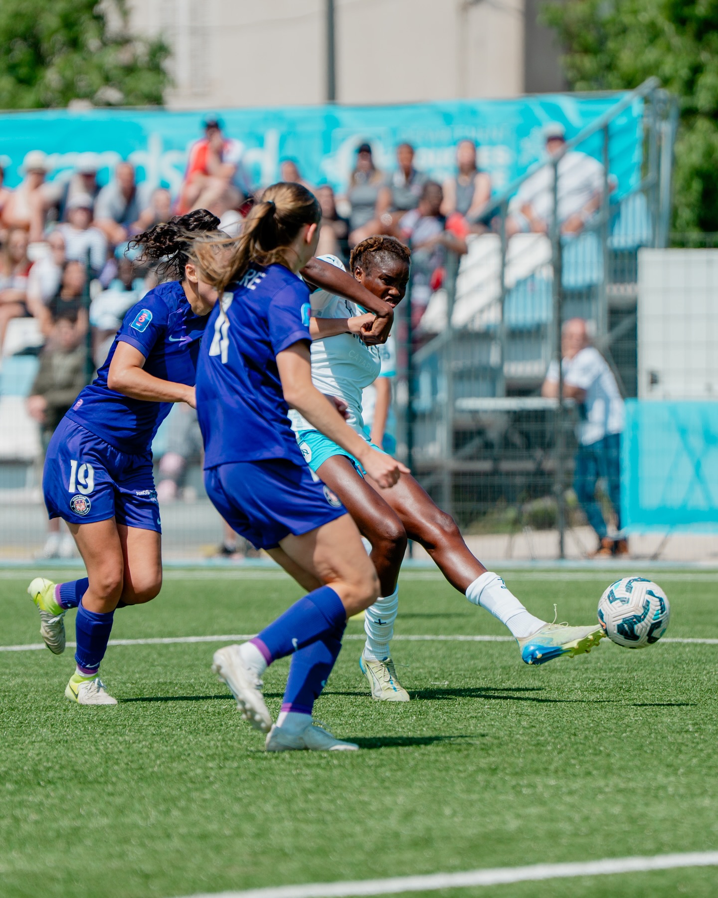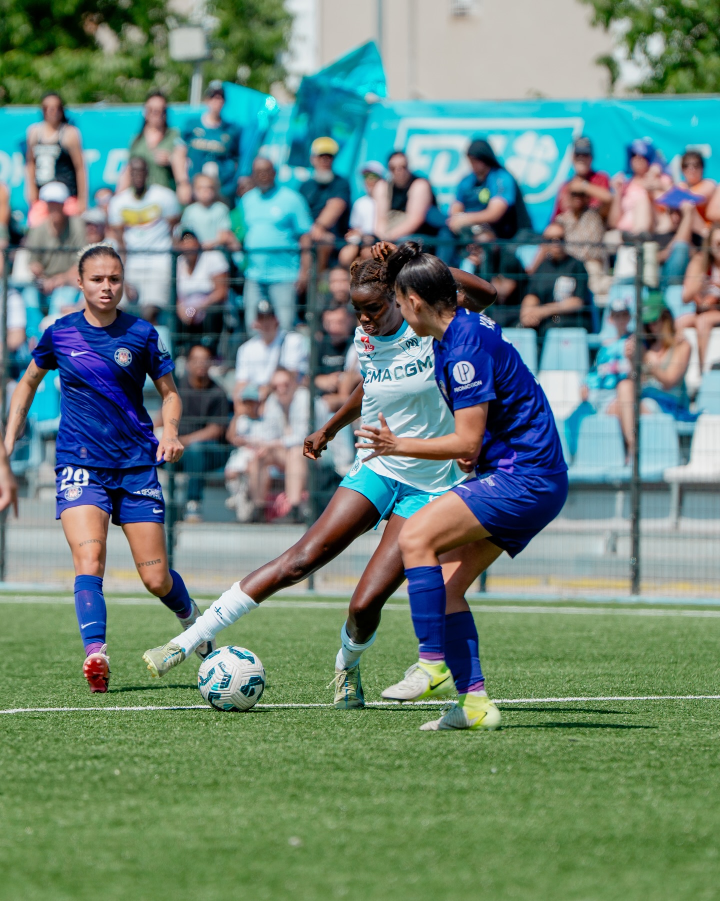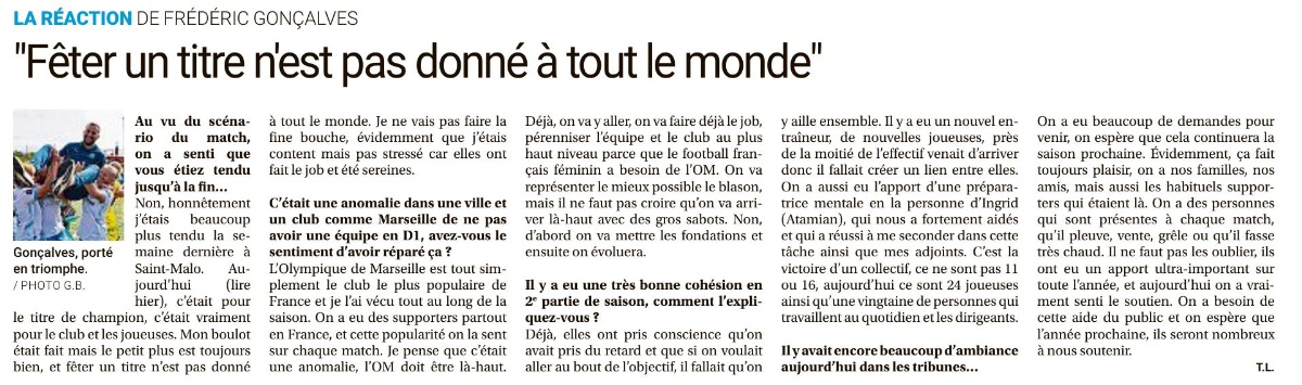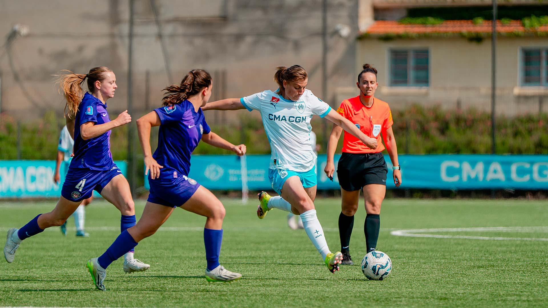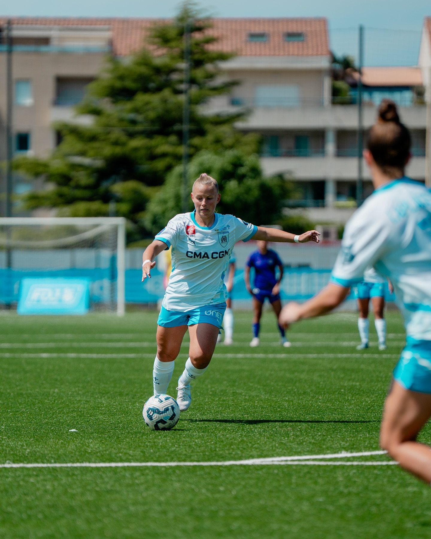 Nos Marseillaises sont championnes de France de Seconde Ligue 2024-2025. Probablement inspirées par leur tour d'honneur effectué la veille juste avant le coup du match entre l'OM et Rennes à l'Orange Vélodrome devant près de 60.000 spectateurs, nos Marseillaises sont allées chercher "la cerise sur le gâteau", comme l'avait dit leur entraîneur, Frédéric Gonçalves. Le gâteau, c'est bien évidemment la montée en Arkema Première Ligue, assurée depuis le succès, le week-end dernier, sur la pelouse de Saint-Malo. La cerise, c'est le titre de champion de France de Seconde Ligue que son équipe a glané au terme d'une seconde partie de saison éblouissante conclue ce dimanche après-midi à Marseille par un neuvième succès consécutif face à Toulouse FC, troisième. Cette victoire permet à l'OM de s'adjuger le titre de champion de D2 féminine, le second de l'histoire du Club après celui acquis en 2016. Car avant le match, le calcul était des plus simples : seul un succès permettrait à l'OM de revenir, en termes de points, à hauteur de Lens, exempt. Mais la différence de buts particulière, favorable à l'OM, offrirait la première position finale. Dans la lignée de leurs dernières prestations, nos Marseillaises ont tout de suite voulu imposer leur rythme à la rencontre. Dès la dixième minute, sur un bon débordement et un centre de Tess Laplacette, Dona Scannapieco ouvrait la marque. Plein comme un oeuf, l'OM Campus se levait pour célébrer cette réalisation qui rapprochait l'équipe du titre. L'expulsion de la Toulousaine Chloé Marty, juste avant la demi-heure de jeu, pouvait laisser penser que les choses allaient être encore plus simples pour les joueuses de Frédéric Gonçalves. Il n'en a rien été. De retour des vestiaires, en infériorité numérique, le TFC a égalisé. A 1 à 1, c'est le RC Lens qui était sacré. L'OM s'est rapidement remobilisé et a accentué la cadence du match. Le second but marseillais n'a pas tardé à intervenir par l'intermédiaire de Laura Bourgouin. Puis le troisième, en fin de rencontre, était l'oeuvre de Darlina Joseph entrée peu de temps. Un but marqué au même moment que l'évacuation par les pompiers de Mama Diop, touchée à l'épaule. Au coup de sifflet final, la section féminine de l'Olympique de Marseille a pu célébrer le titre de champion de France de Seconde Ligue. Tout le monde s'est pris dans les bras pendant que se mettait en place la remise des médailles et de la coupe. Présent à l'OM Campus, Pablo Longoria savourait ce moment, au lendemain de la deuxième place de L1 acquise par l'équipe masculine. Une fois les médailles autour du cou des joueuses et membres du staff, la remise du trophée s'est déroulée face à la tribune de l'OM Campus, toujours aussi pleine. Les confettis ont volé dans le ciel marseillais balayé par le vent lorsque la coupe a été brandie.