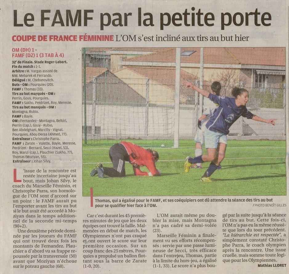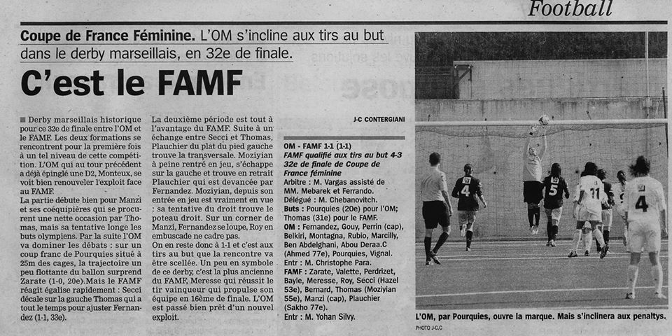 Christophe Parra l'entraîneur olympien reconnaît la supériorité du FA Marseille, mais rend surtout honneur à ses joueuses : "J'avais présenté la rencontre aux filles de deux façons : - Il y a des matches appréhendés pour travailler, progresser. Ils ne sont pas toujours bons à jouer, mais ils participent à la construction d'une histoire. - D'autres, comme celui d'aujourd'hui, sont des matches à émotions. Il faut les vivre pleinement. Les filles se sont orientées vers cette deuxième option pour participer pleinement. "Je n'ai rien à leur reprocher dans leur implication, leur investissement. Les 16e de finale sont pour l'avenir. La route est encore longue. Le FA Marseille a une équipe de grande qualité, je comprends mieux pourquoi ces filles ont été à deux doigts de monter Division 1 la saison dernière." Johan SILVY (entraîneur du FAMF) : "On a très mal commencé, peut-être parce qu'on avait adopté un système de jeu différent par rapport à d'habitude. Les joueuses se sont parlées à la mi-temps et de mon côté, je leur ai demandé d'arrêter de s'énerver. On a rectifié le tir en seconde période et la séance de penaltys nous a souri. Cependant, on aurait pu tuer le match avant." |