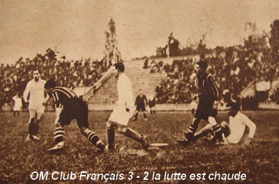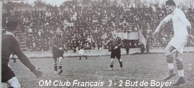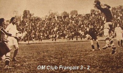 Les joueurs qui se distinguèrent le plus furent, à l'O.M., toute la ligne d'avants, Durbec et Allé. Les demis faiblirent terriblement lorsqu'ils furent mis à la besogne d'une manière incessante. Par bonheur pour eux, Alcazar et Gallay leur apportèrent un concours précieux.. Mais, encore une fois, il est aisé de comprendre que le ballon, entre les pieds des demis est beaucoup plus vite retourné à portée de shot du but que s'il est détenu par les avants. Gallay, l'ancien ailier gauche international, fournit un labeur formidable et heureux. |