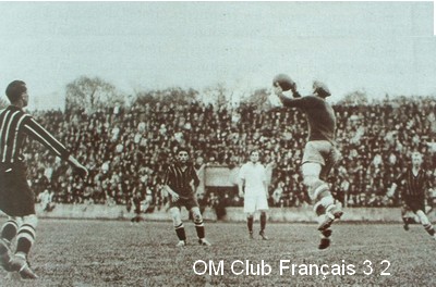 Lorsque, tantôt par hasard, plus souvent grâce aux passes clairvoyantes de Gallay, elle entrait en possession du ballon, elle voyait son action vite enrayée par les demis et arrières parisiens, supérieurs en nombre, et le ballon retournait aux avants parisiens. La défense marseillaise, qui manqua totalement de fond, à part Durbec, n'avait jamais le temps de respirer, puisque ses avants ne conservaient pas le ballon, comme ils le firent en première mi-temps. Le demi-centre Cabassu eut un quart d'heure d'éclipse ; Aquaron, fatigué, ne renouvela plus ses exploits du début de la partie ; Jacquier joua à maintes reprises en affolé. Heureusement, les interventions décisives de Durbec, qui pratiqua une méthode rapide et autoritaire, écartèrent fréquemment le danger. |
